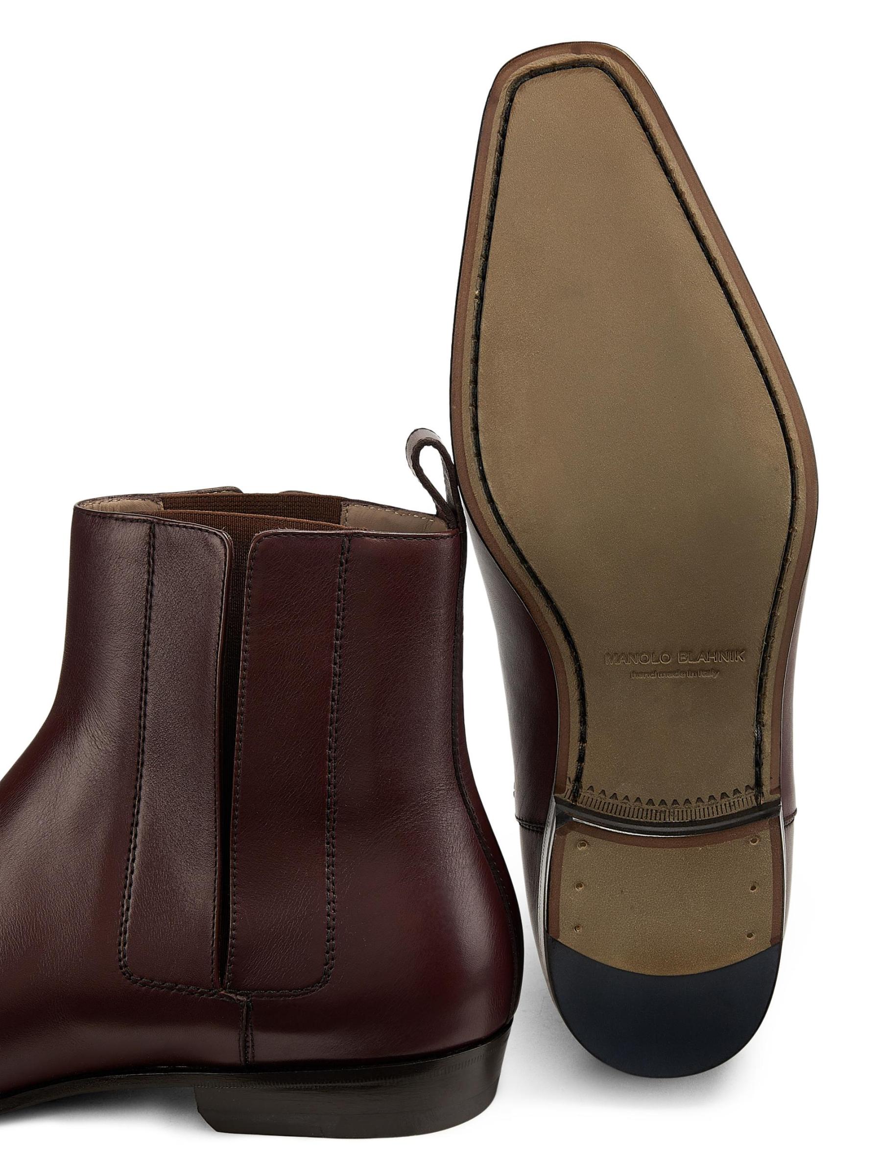 The Bruton ankle boots from Manolo Blahnik are crafted of smooth leather featuring elastic side panels and a back tab.Almond toe Pulls on Leather/textile upper Leather lining Leather/rubber sole Made in Italy