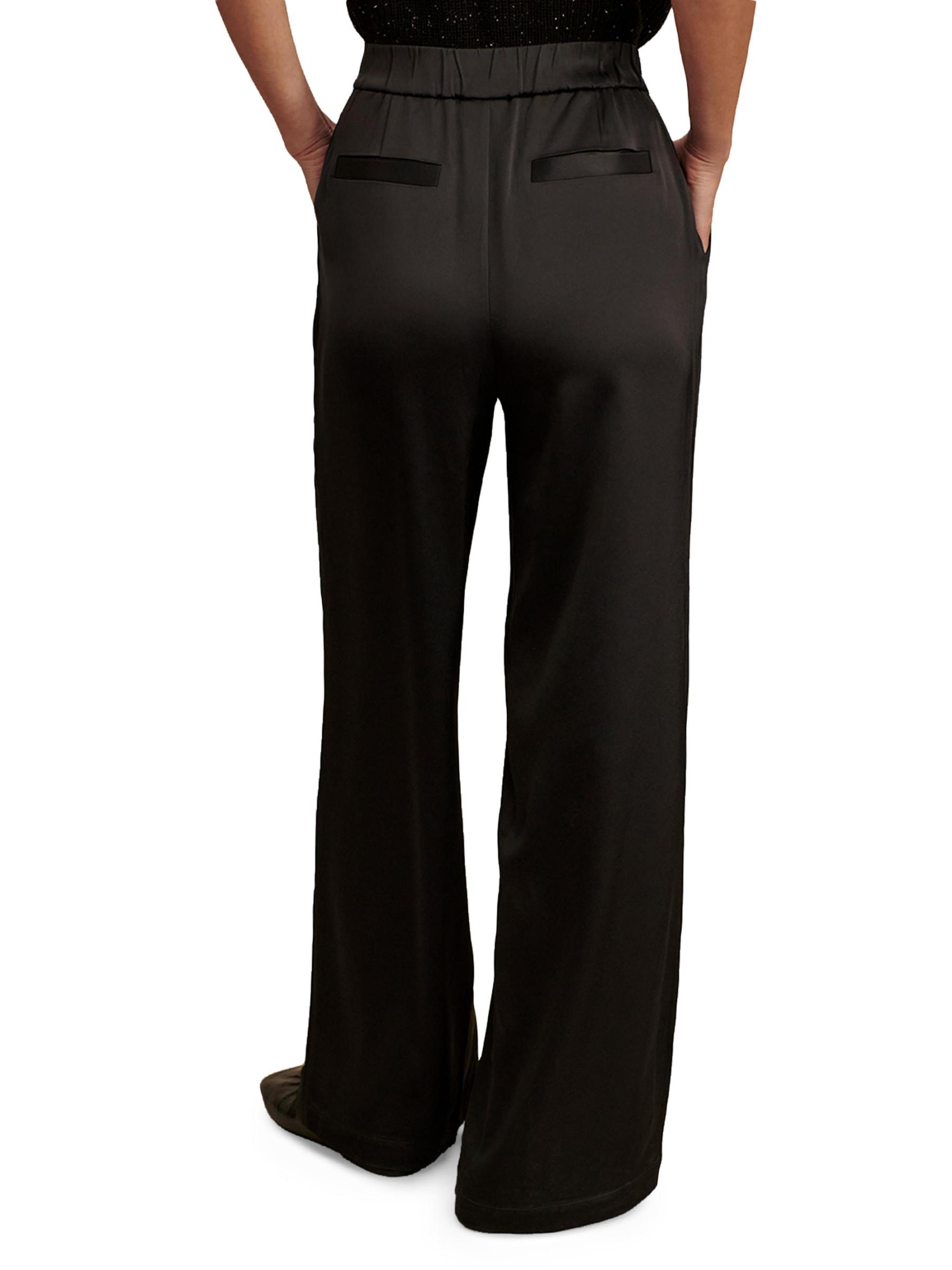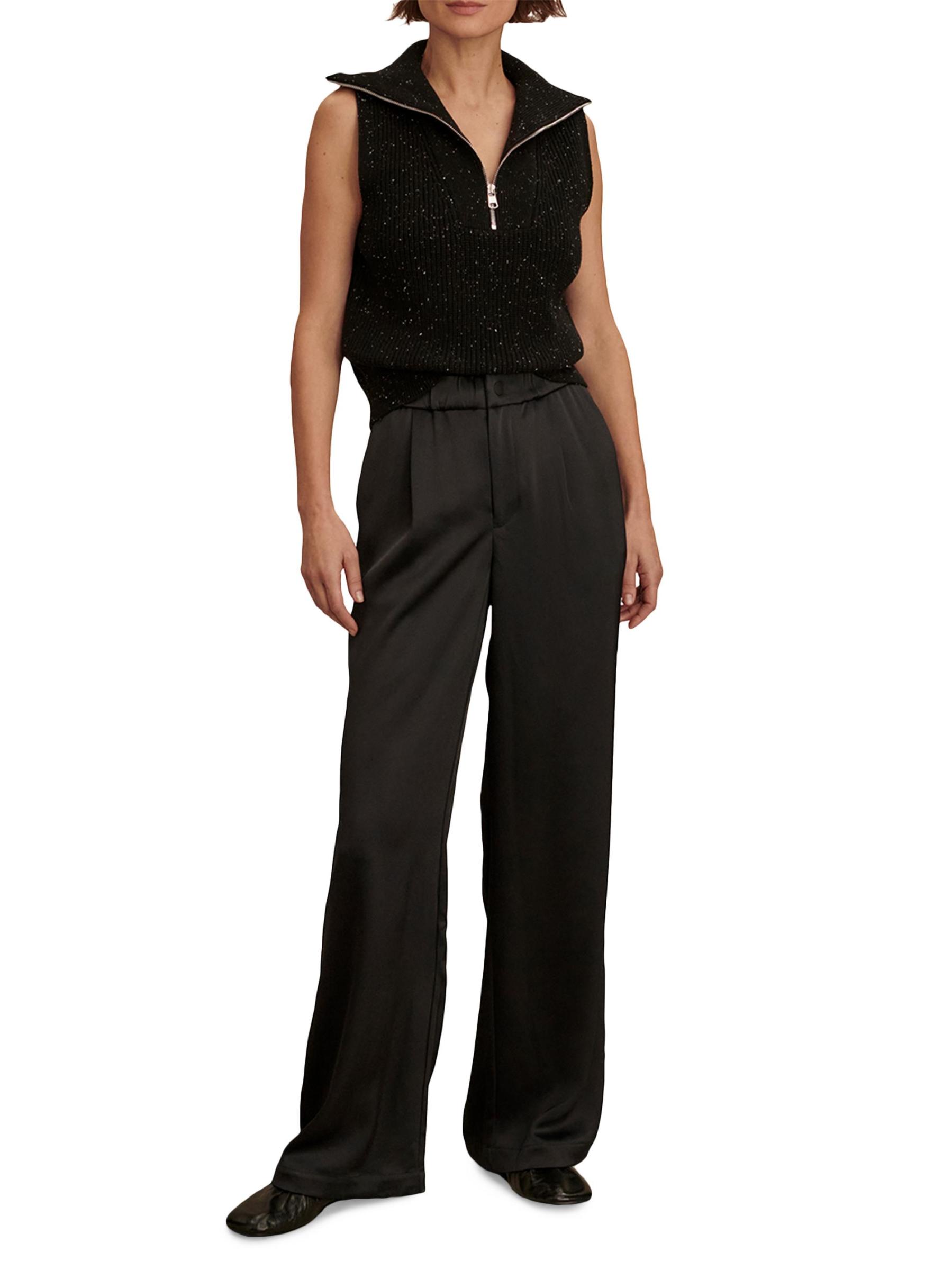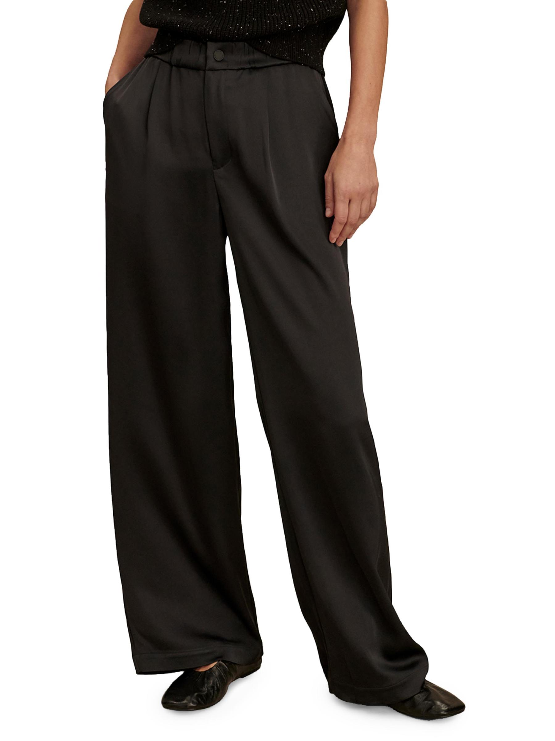 Varley's Bryden 2.0 sateen pants feature a wide-leg silhouette with a subtle pleated front and an elasticized waistband.