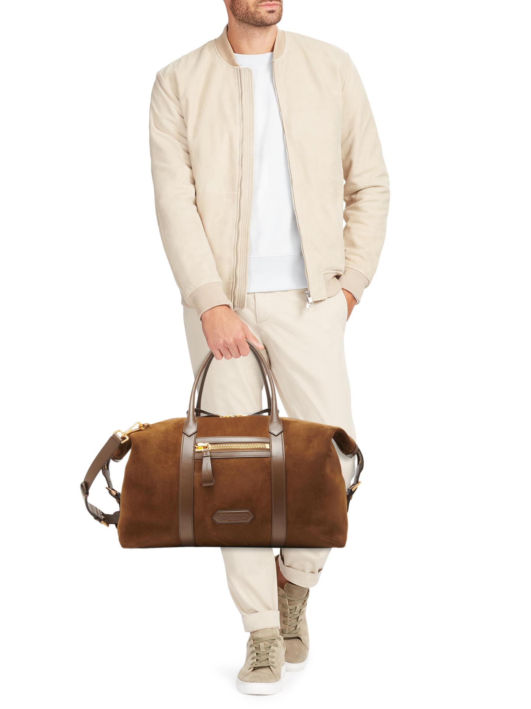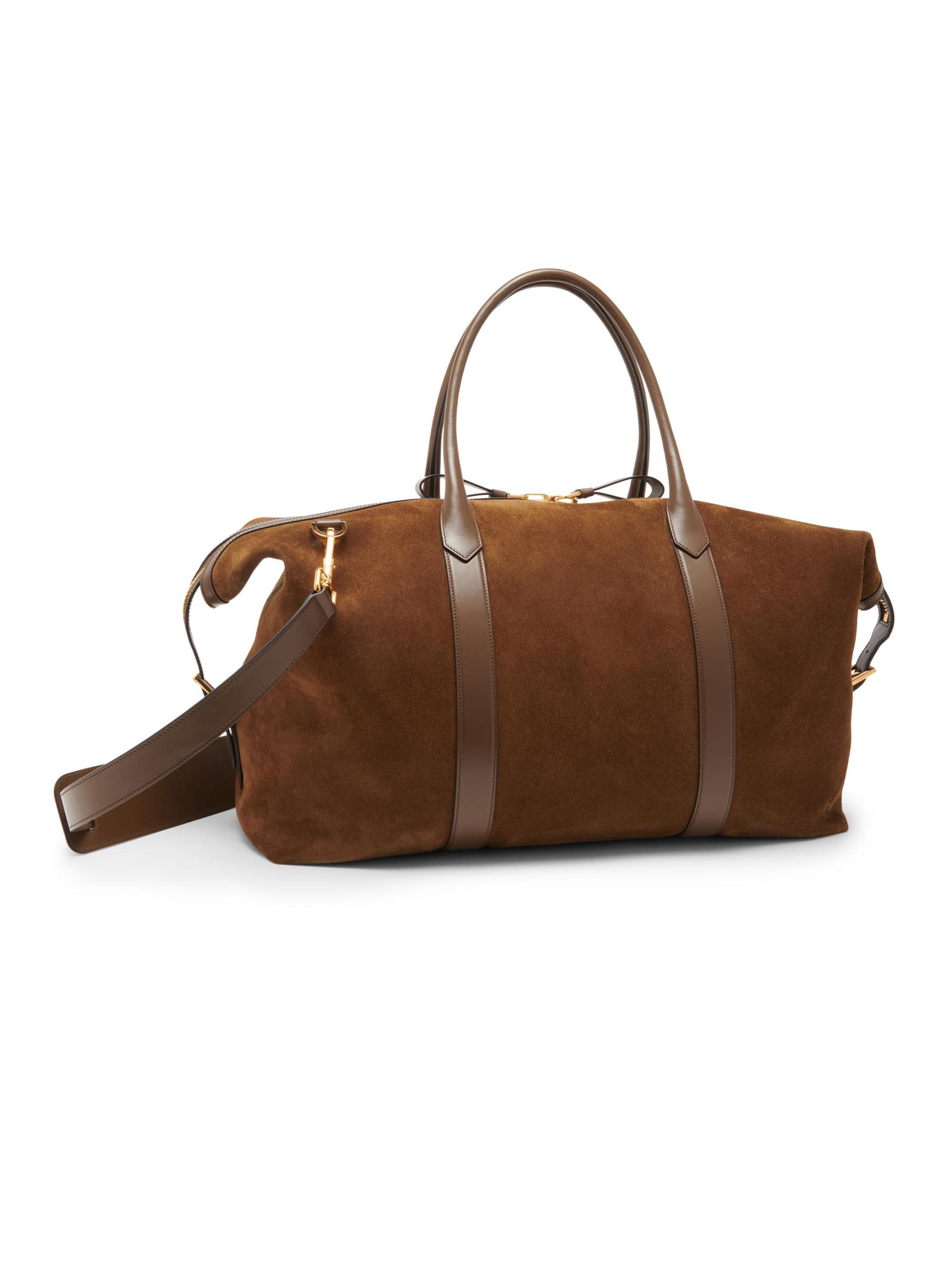 Made in Italy, the Buckley suede holdall from TOM FORD is accented with smooth leather detailing and goldtone hardware.