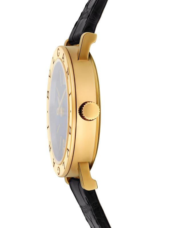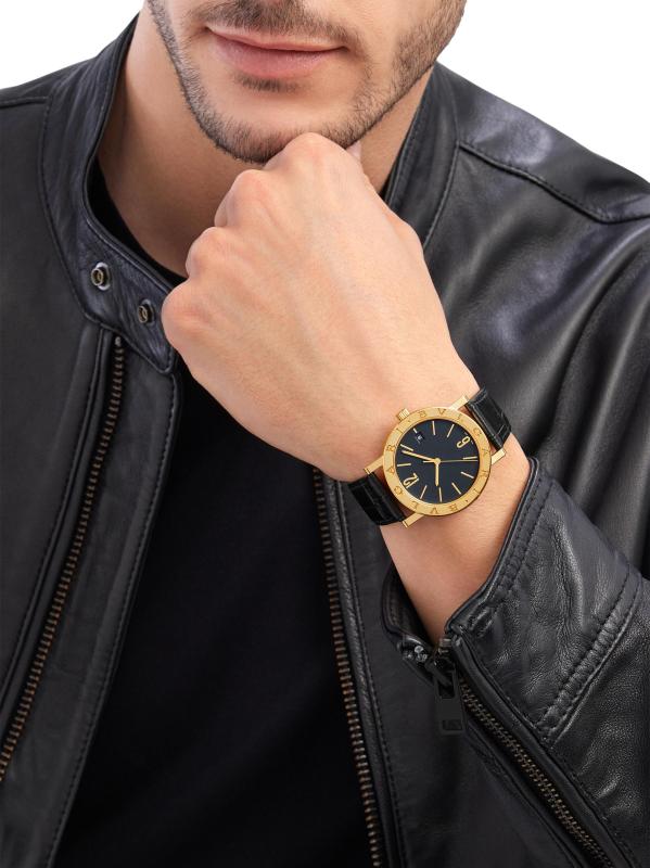 From the BVLGARI BVLGARI Collection. Secured with a black alligator leather strap, BVLGARI's watch features an 18K-yellow-gold case, a logo-engraved bezel, and a black opaline dial with a date display at three o'clock.Presented in BVLGARI's signature packaging, inspired by the house's rich history and commitment to luxury Automatic movement Logo-engraved bezel Black opaline dial Baton hour markers and Arabic numerals Date display at 3 o'clock Second hand 18K yellow gold case Alligator leather strap Pin buckle closure Made in Switzerland