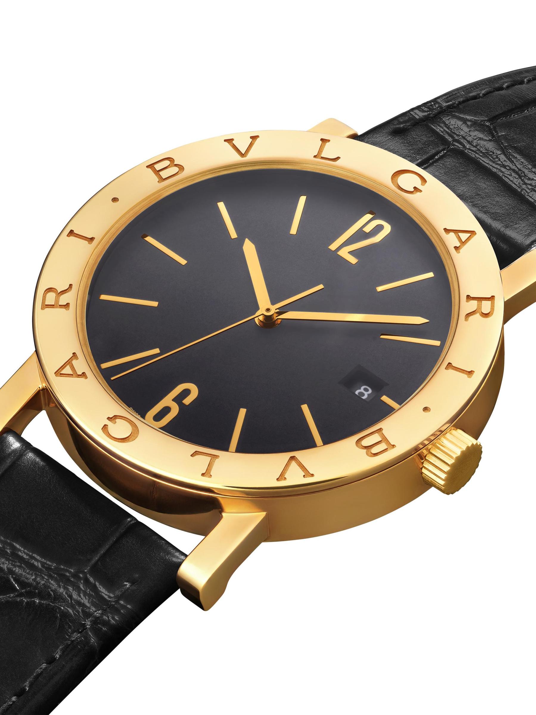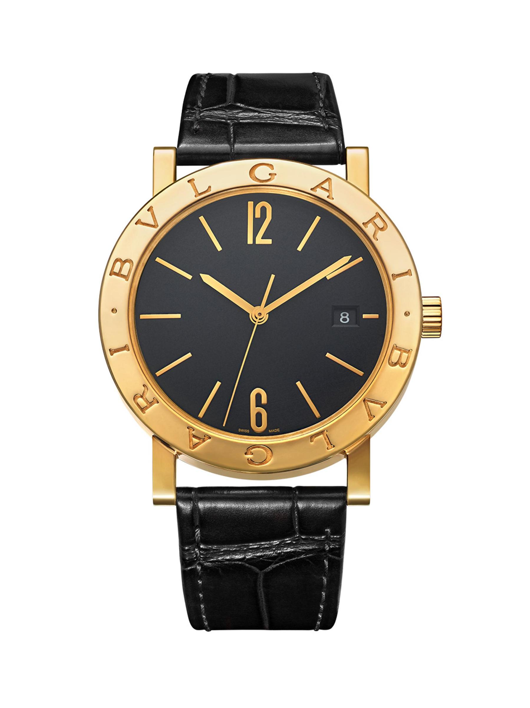 From the BVLGARI BVLGARI Collection. Secured with a black alligator leather strap, BVLGARI's watch features an 18K-yellow-gold case, a logo-engraved bezel, and a black opaline dial with a date display at three o'clock.