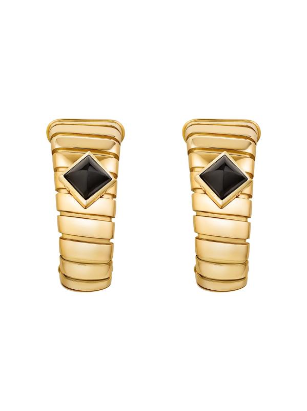 From the BVLGARI Tubogas Collection. Crafted of 18K yellow gold, these hoop earrings from BVLGARI are accented with pyramid-cut onyx cabochons.
