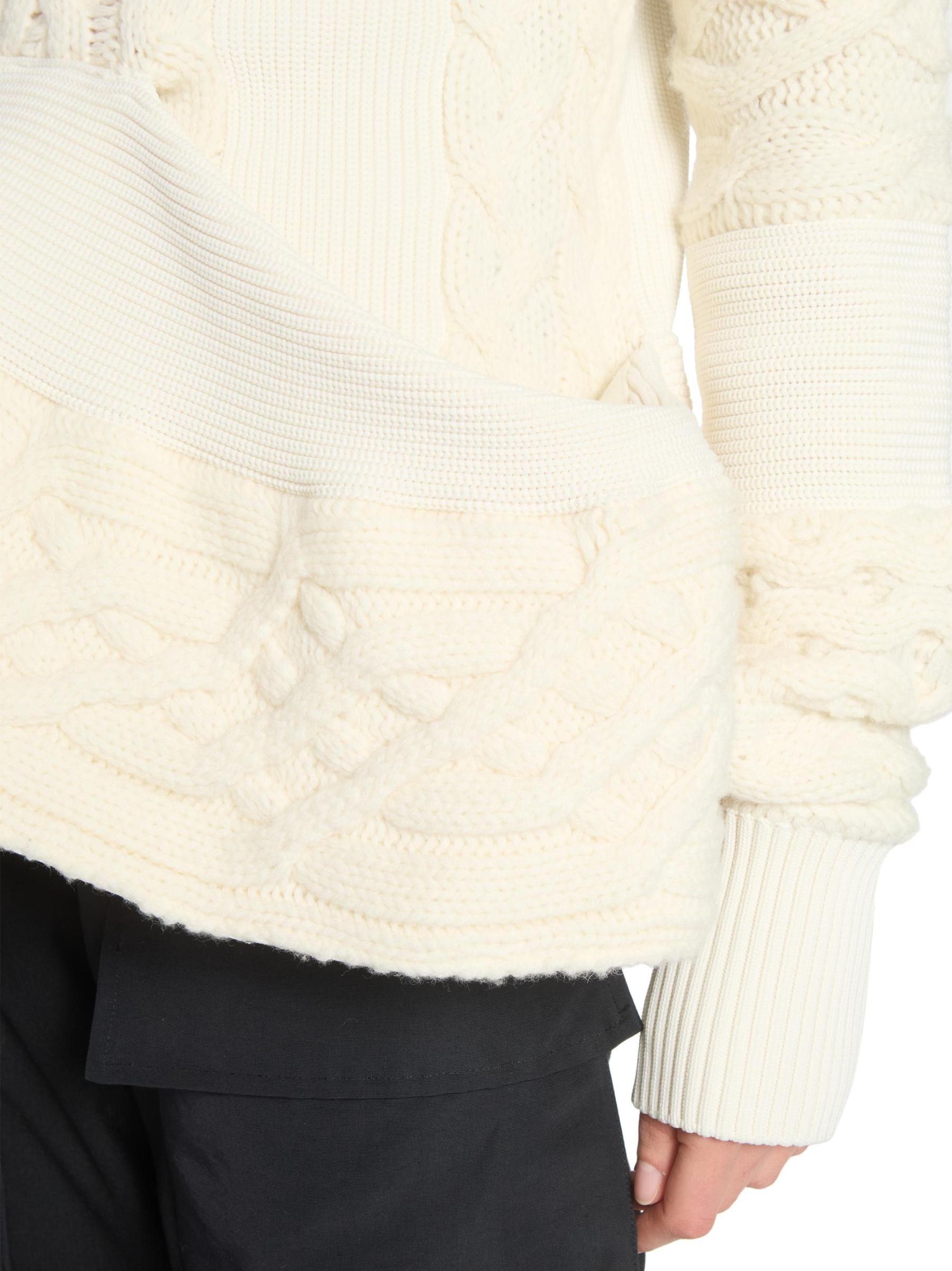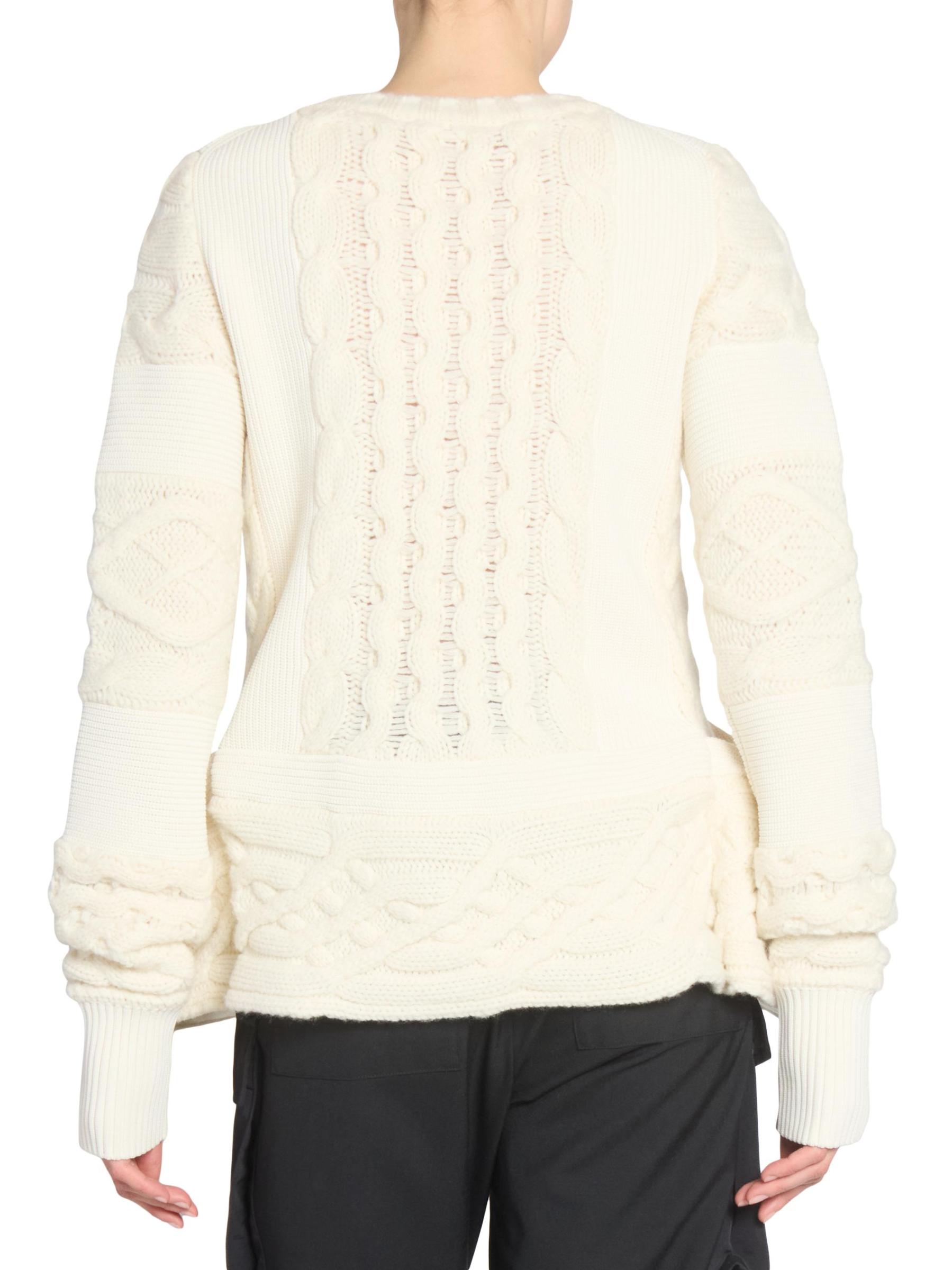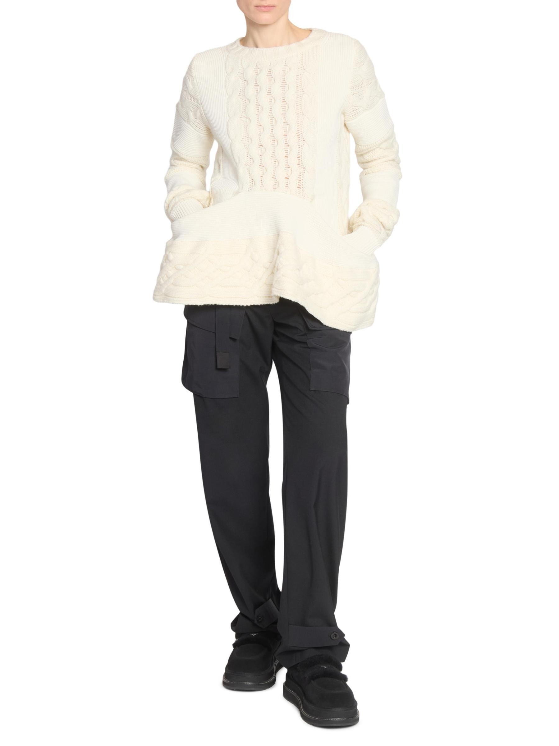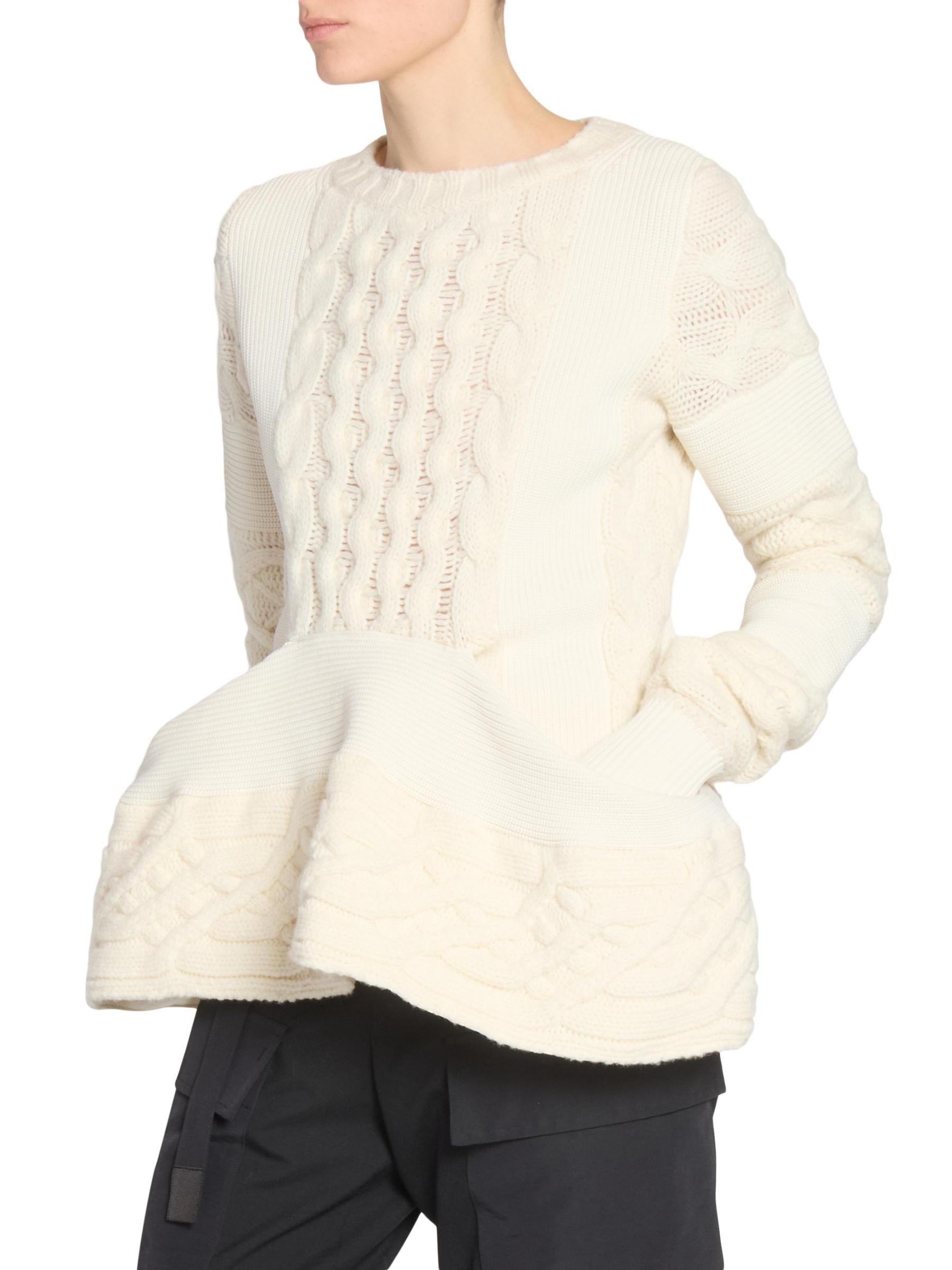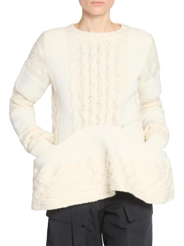 This Sacai cable-knit sweater features a classic crewneck, long sleeves with ribbed cuffs, and a flared peplum hem.Long sleeves, ribbed cuffs Peplum hem Pulls over 63% wool/37% polyester Dry clean Imported