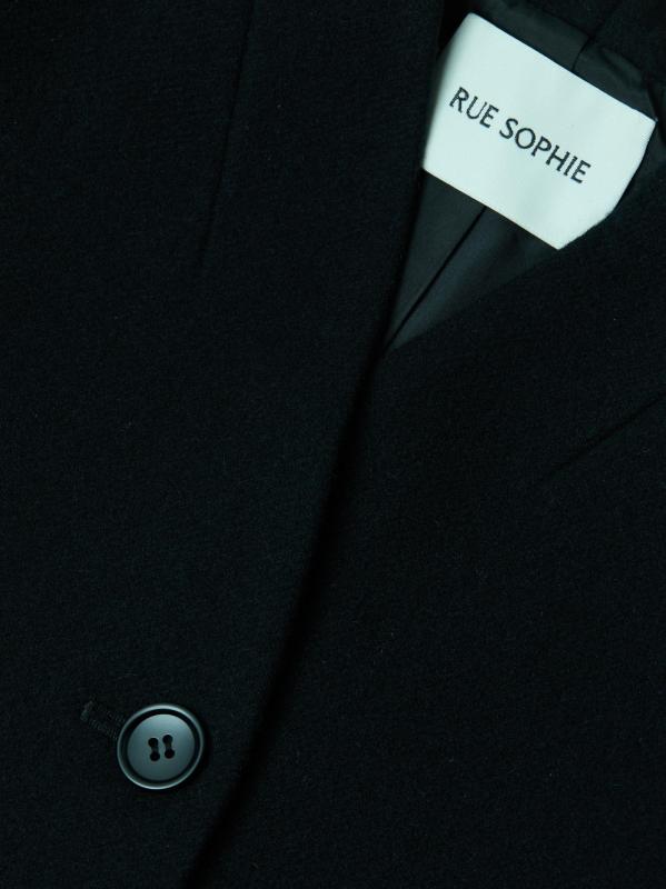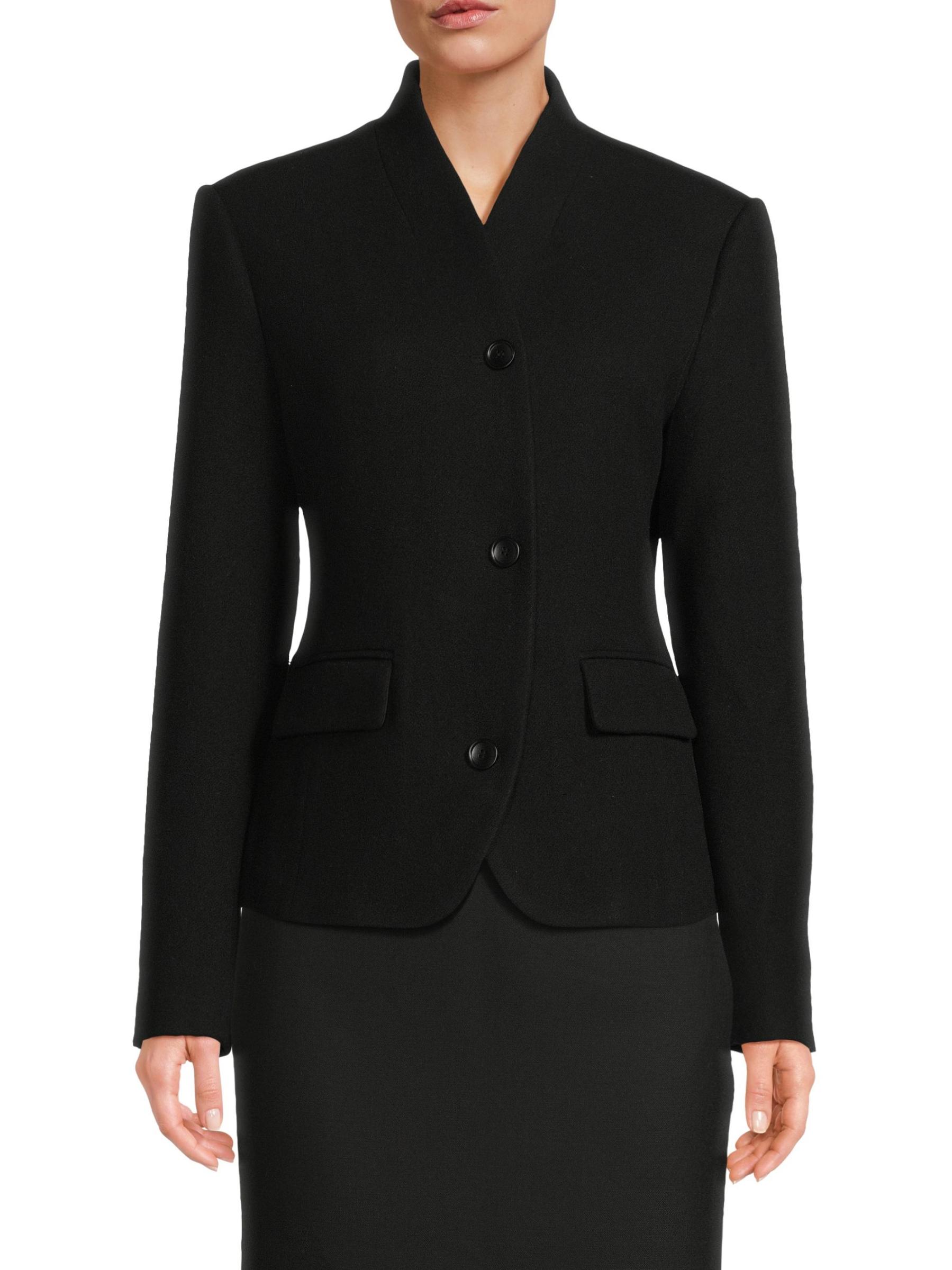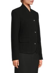 The Camberly blazer from Rue Sophie is crafted of stretch wool and silk. This tailored style features a high shawl collar and a fitted silhouette.