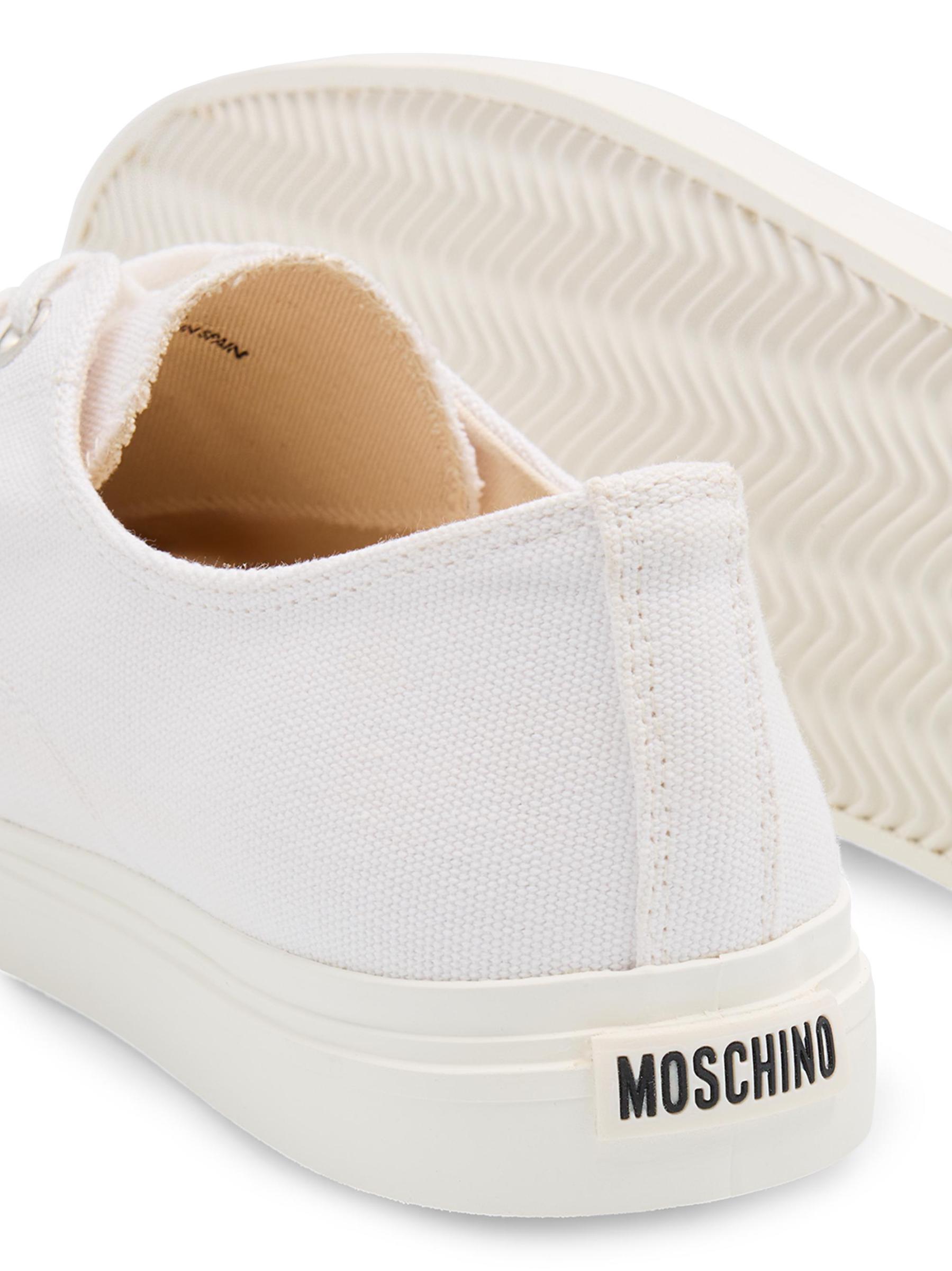 Carfted of cotton canvas, these Moschino low-top sneakers are styled with a squared cap toe and signature heel logo.Cap toe Lace-up style Canvas upper Cotton lining Rubber sole Made in Spain