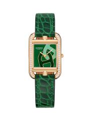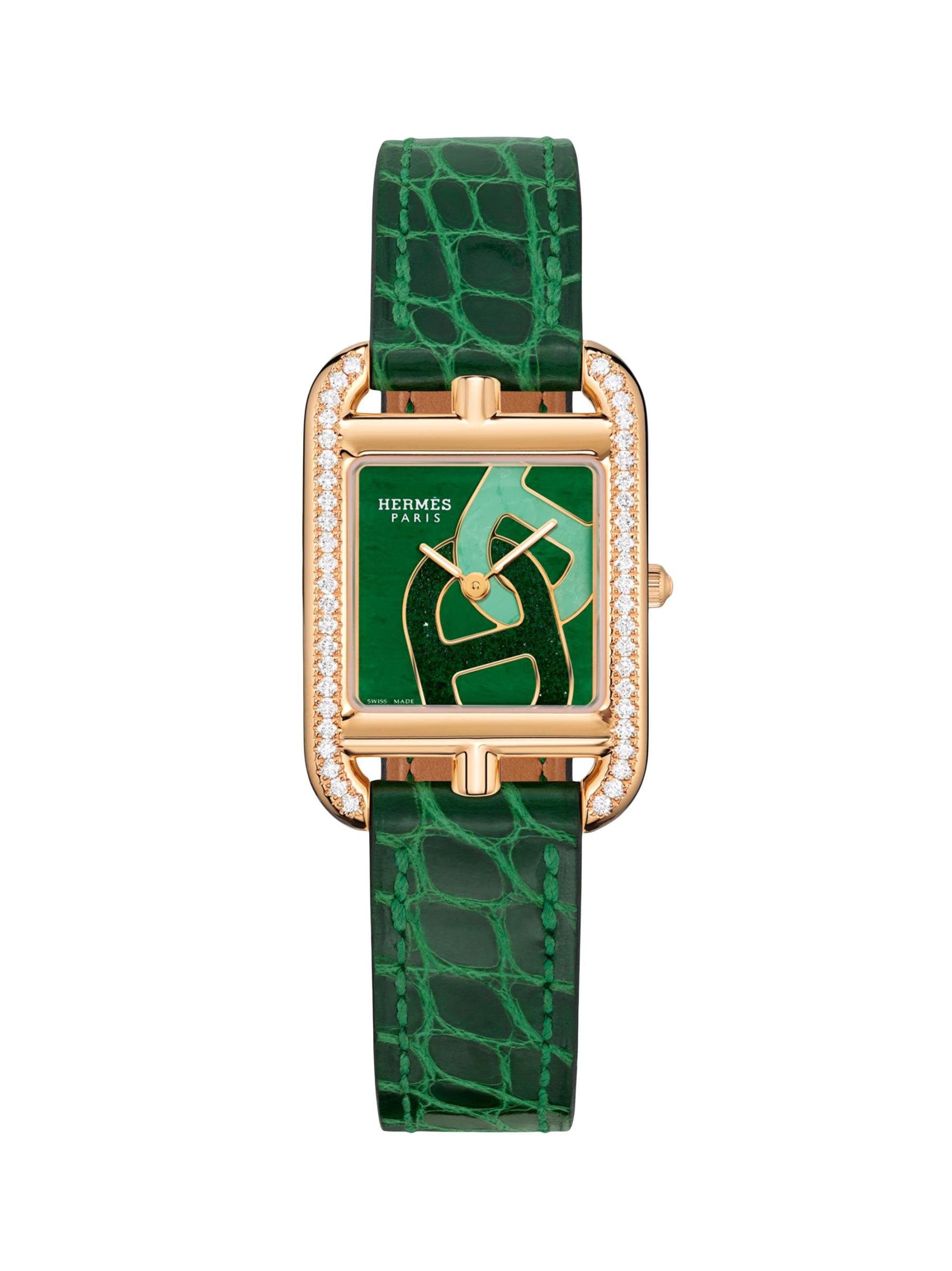 From the Cape Cod Collection. The iconic Anchor Chain motif adorns the dial of this watch from HERMÈS. Crafted of 18K rose gold, diamonds frame the bezel which is anchored by a jewel-toned alligator strap.Swiss quartz movement 18K rose gold bezel with diamonds, 0.42 tcw Anti-glare sapphire crystal 18K rose gold crown Nephrite jade dial with green aventurine and chrysoprase Anchor Chain 18K rose gold case Alligator strap Pin buckle closure Made in Switzerland