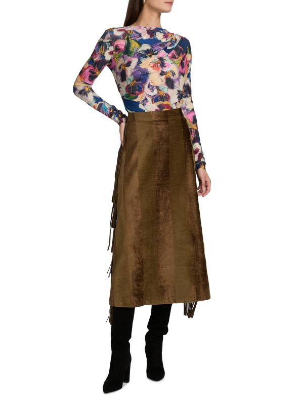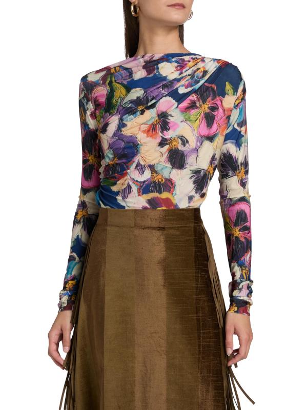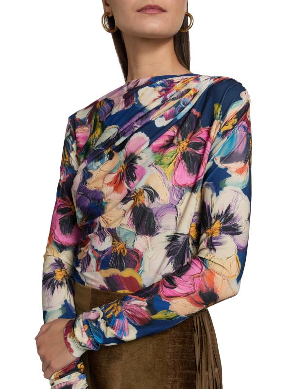 Maria Cher's Carroll Lauren floral jersey long-sleeve top is designed with a round neck, delicate gathering at the shoulder, and ruched detailing at the side.