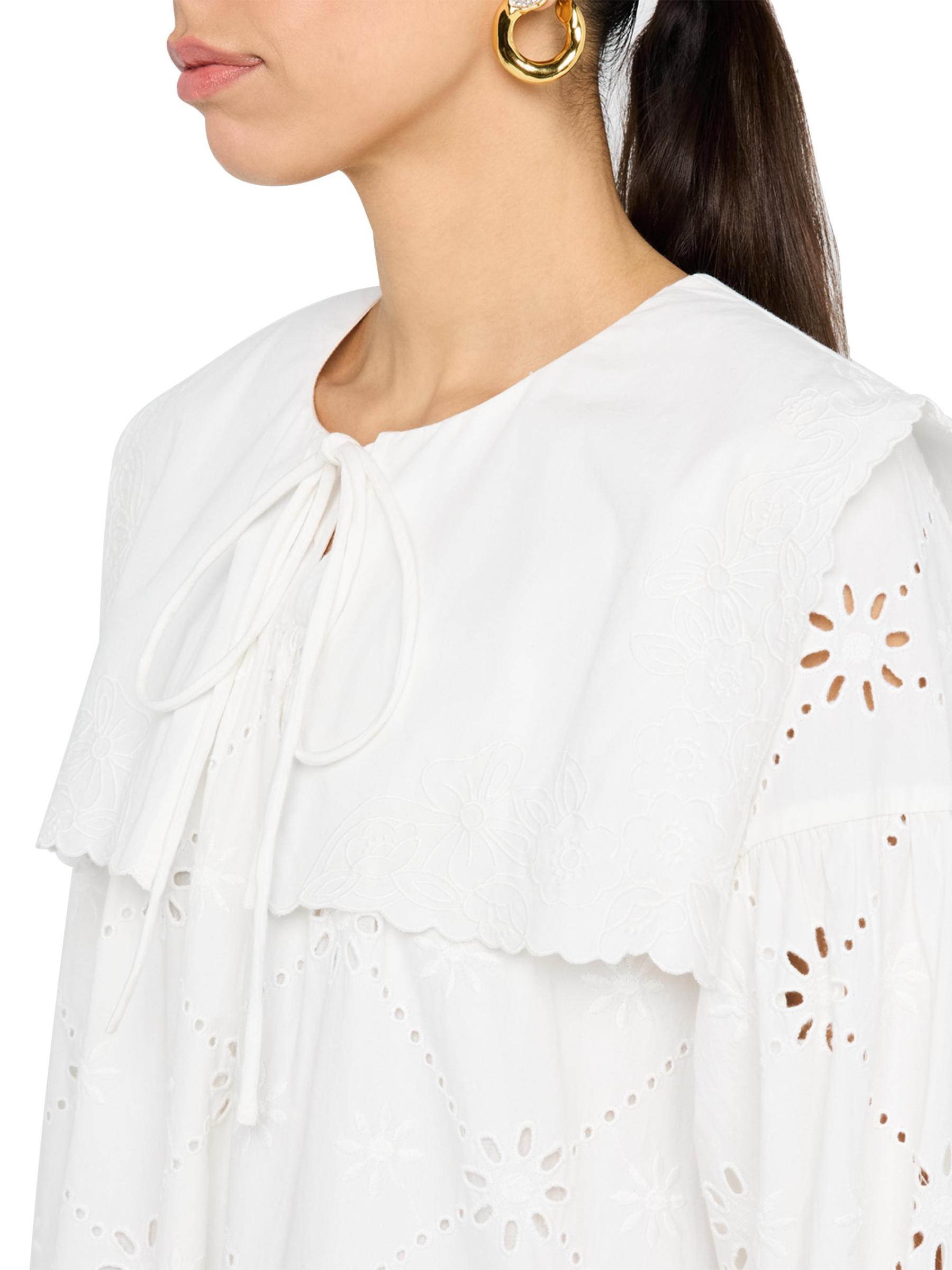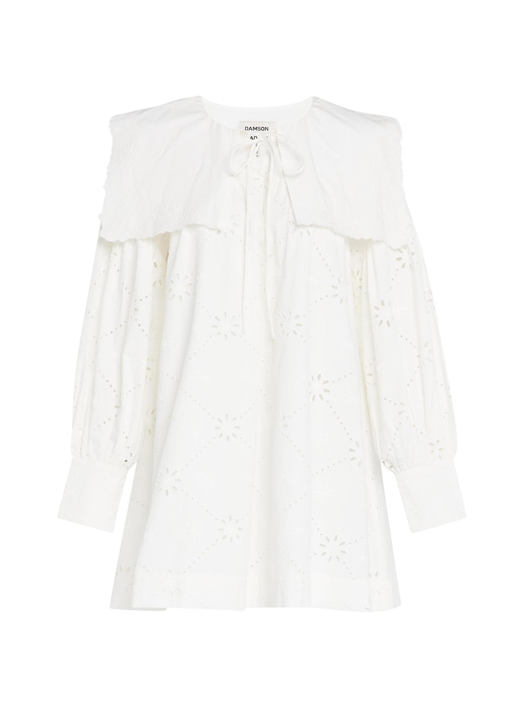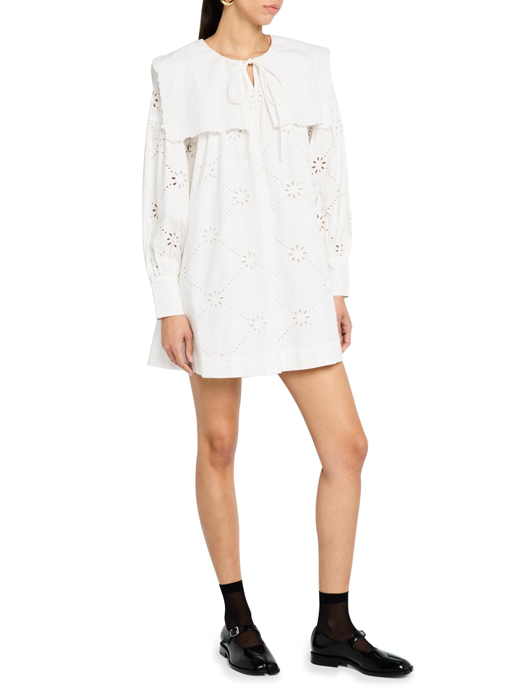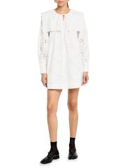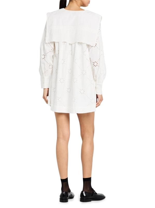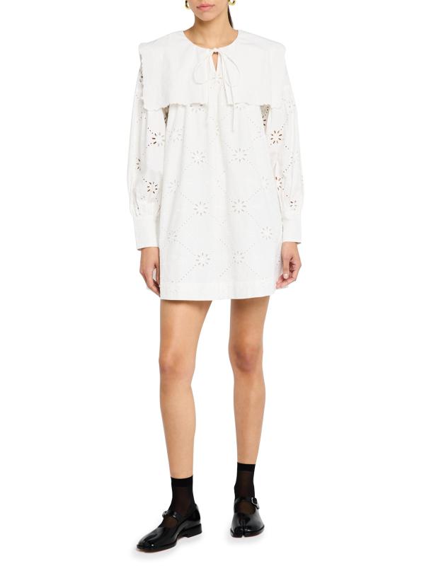 The Cassidy embroidered minidress from Damson Madder features eyelet cotton and a wide sailor collar.