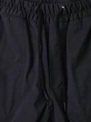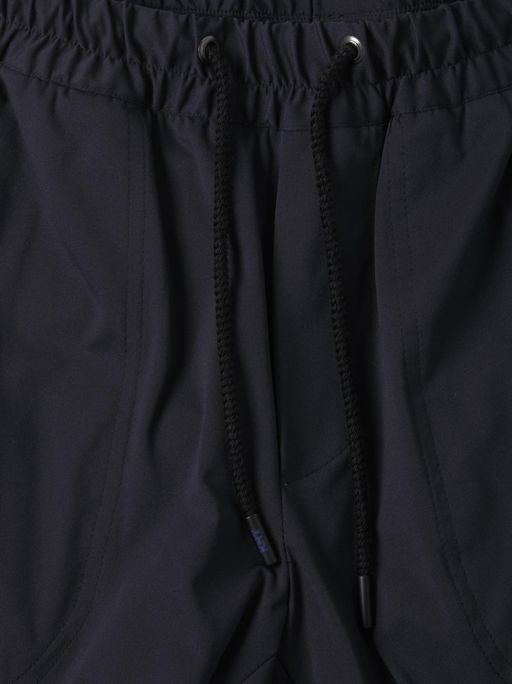 Elasticized drawstring waistband Faux fly On-seam pockets