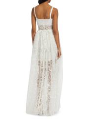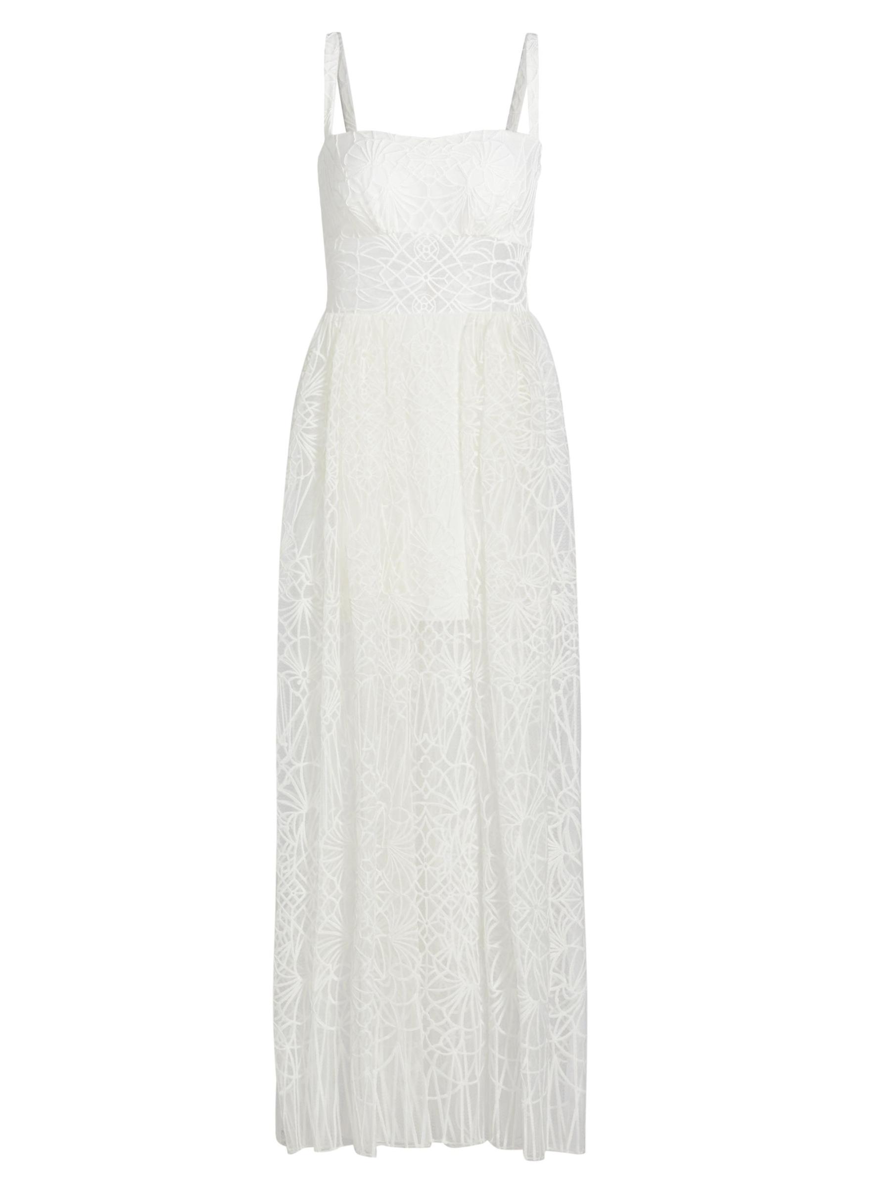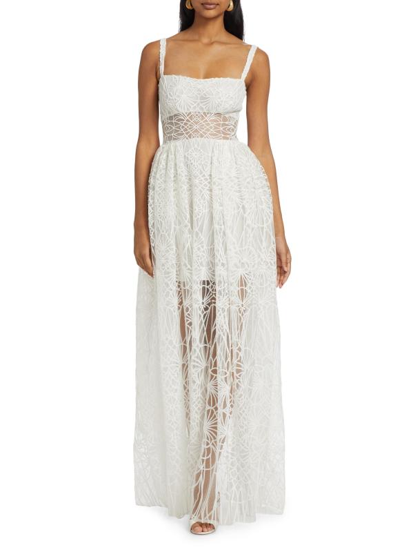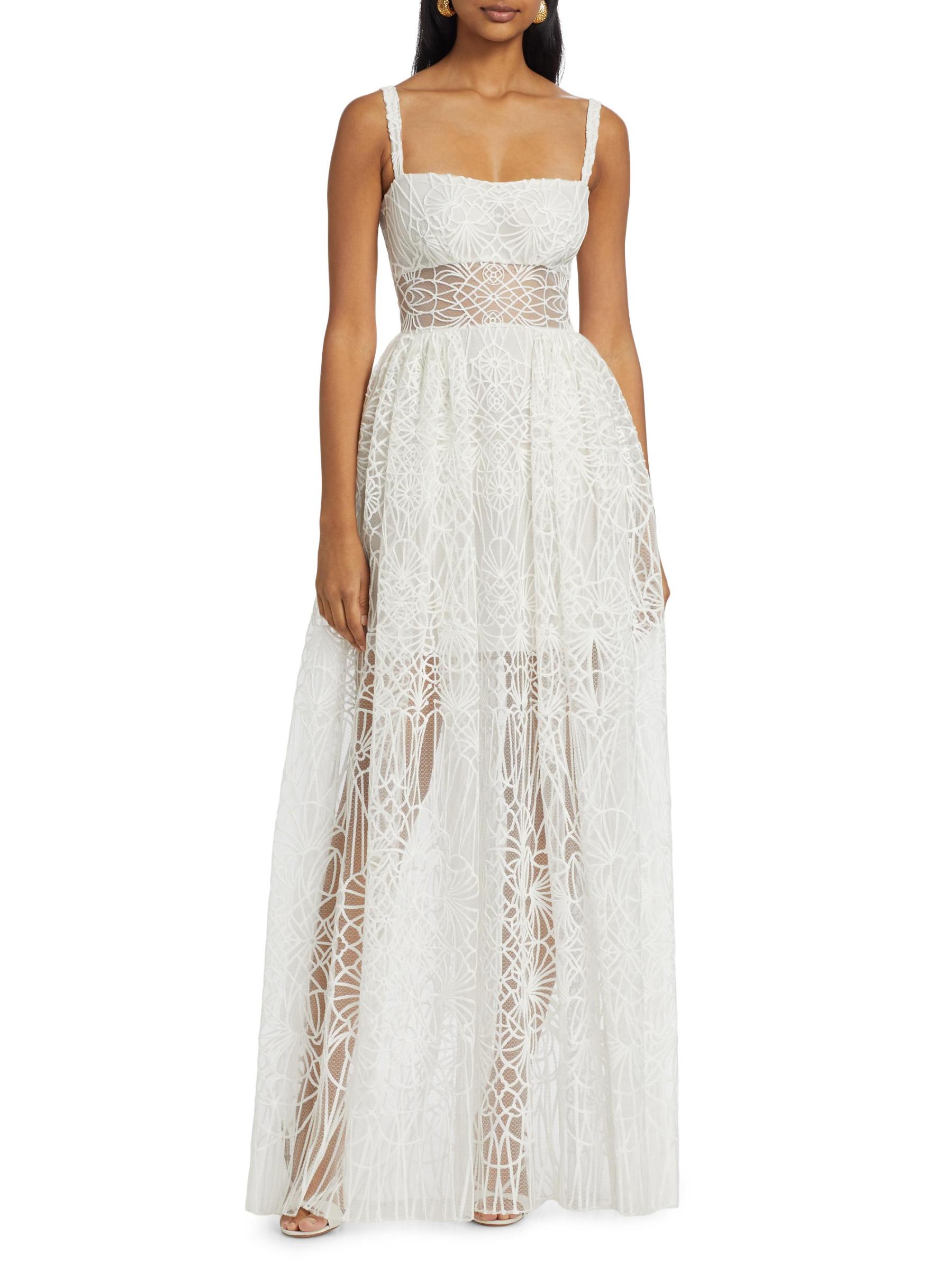 Zuhair Murad's Cathedral A-line maxi dress boasts a sheer bodice with embroidered overlay. Featuring a half-lining with a peeking sheer paneling.Squareneck Spaghetti straps Back zip closure 64% polyester/36% nylon Lining: 100% silk Dry clean Imported