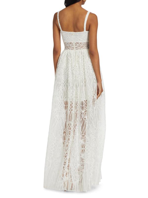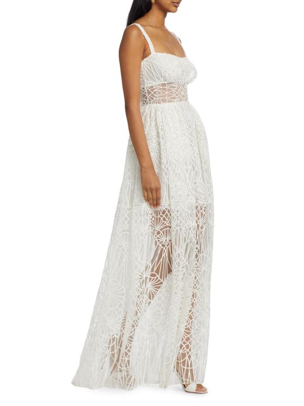 Zuhair Murad's Cathedral A-line maxi dress boasts a sheer bodice with embroidered overlay. Featuring a half-lining with a peeking sheer paneling.