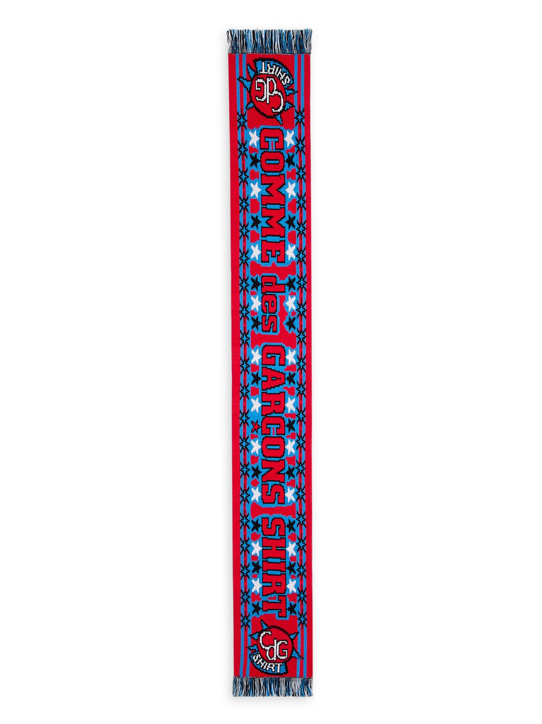 This scarf from Comme des Garçons is jacquard-knit with a signature logo tape design. Fringed ends complete this style.Fringed ends 100% acrylic Made in UK