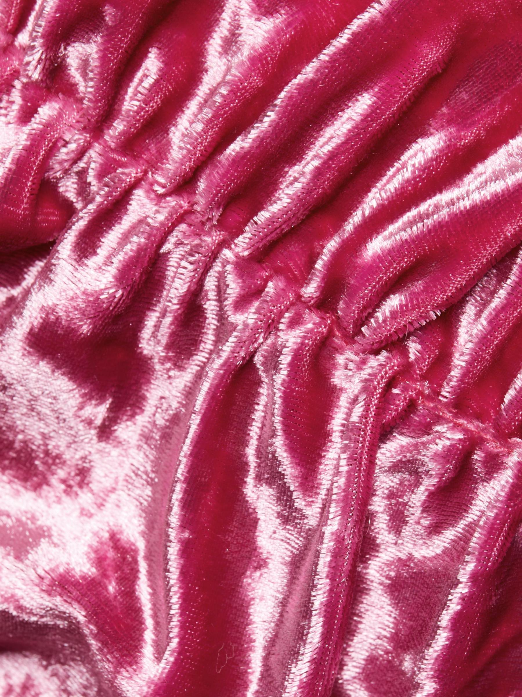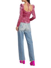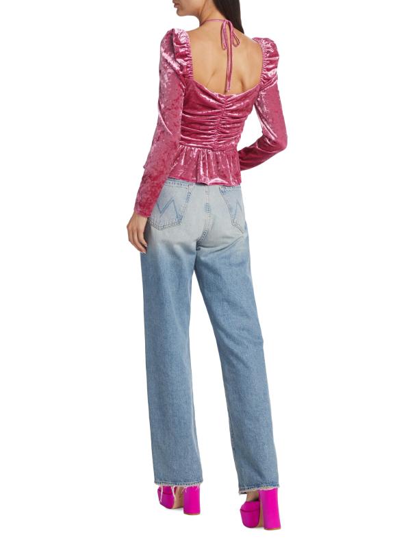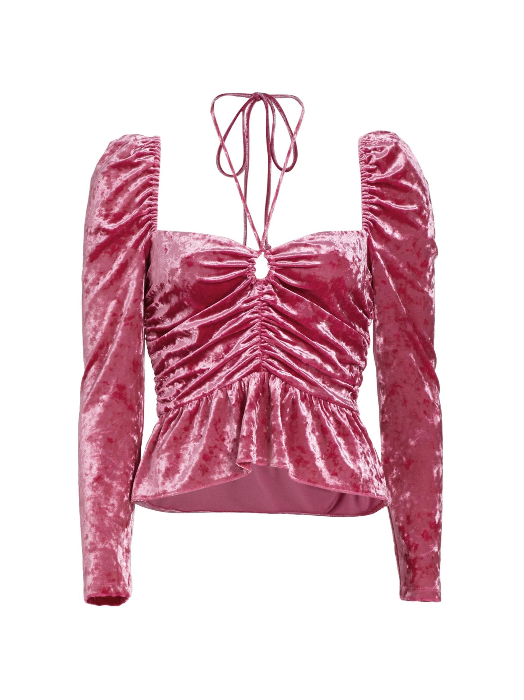Crafted of stretch velvet, Saylor's Cedella ruched blouse features a halterneck, princess sleeves, and peplum hem.