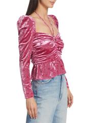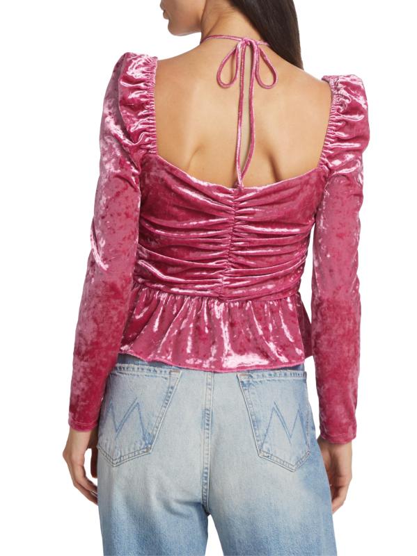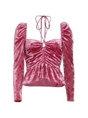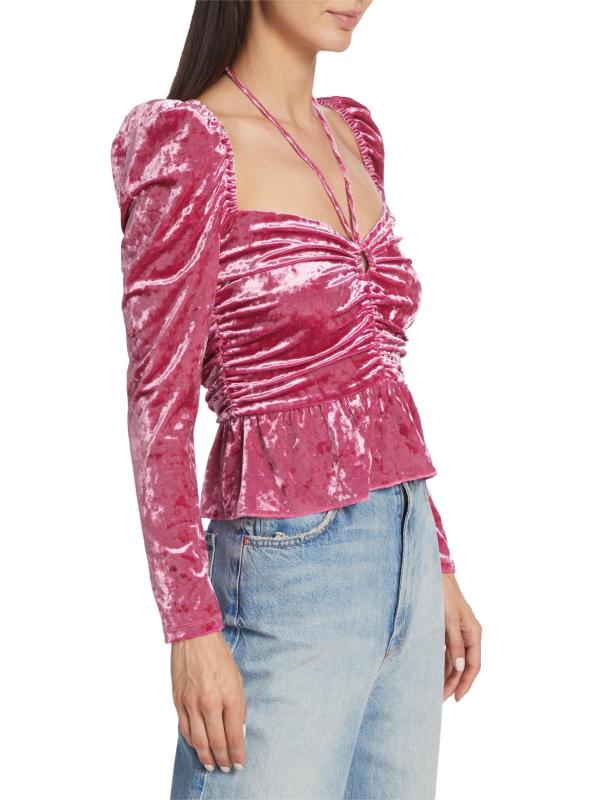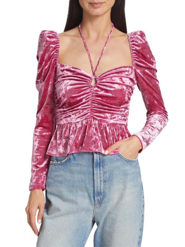 Crafted of stretch velvet, Saylor's Cedella ruched blouse features a halterneck, princess sleeves, and peplum hem.Halter Long sleeves Ties at neck 95% polyester/5% spandex Lining: 90% nylon/10% spandex Dry clean Imported