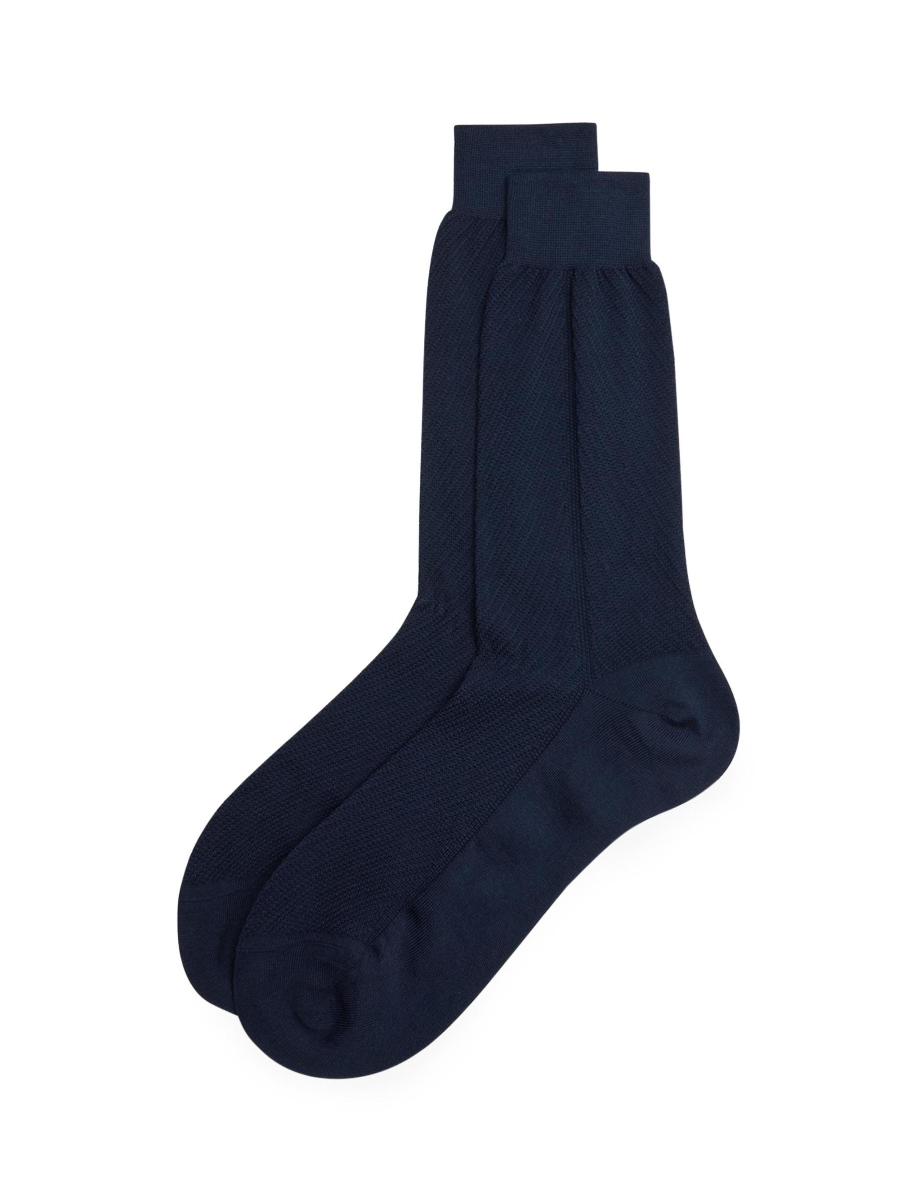 Designed with banded cuffs and a reinforced toe and heel, these Brioni crew socks are crafted of a luxurious Italian Sea Island cotton and silk blend in a jacquard chevron pattern.