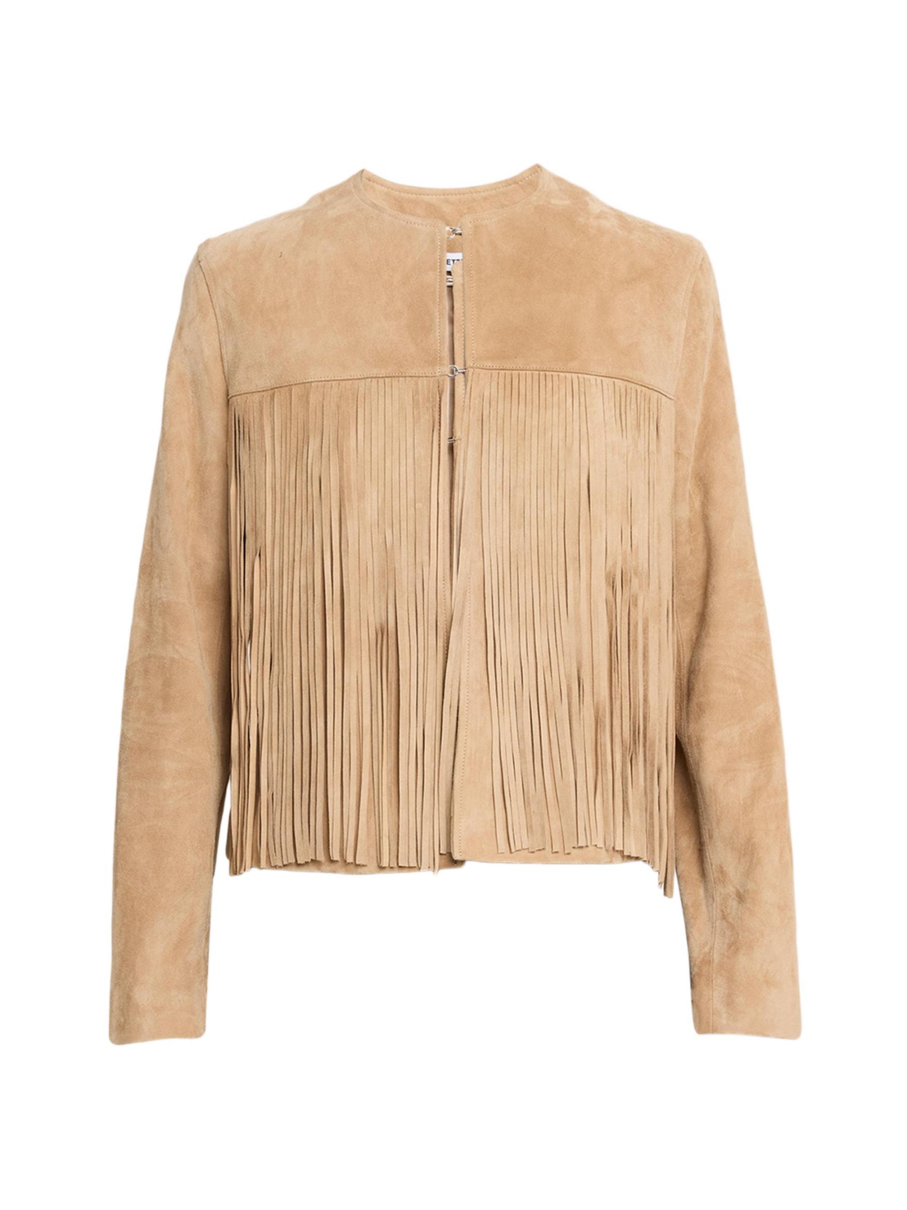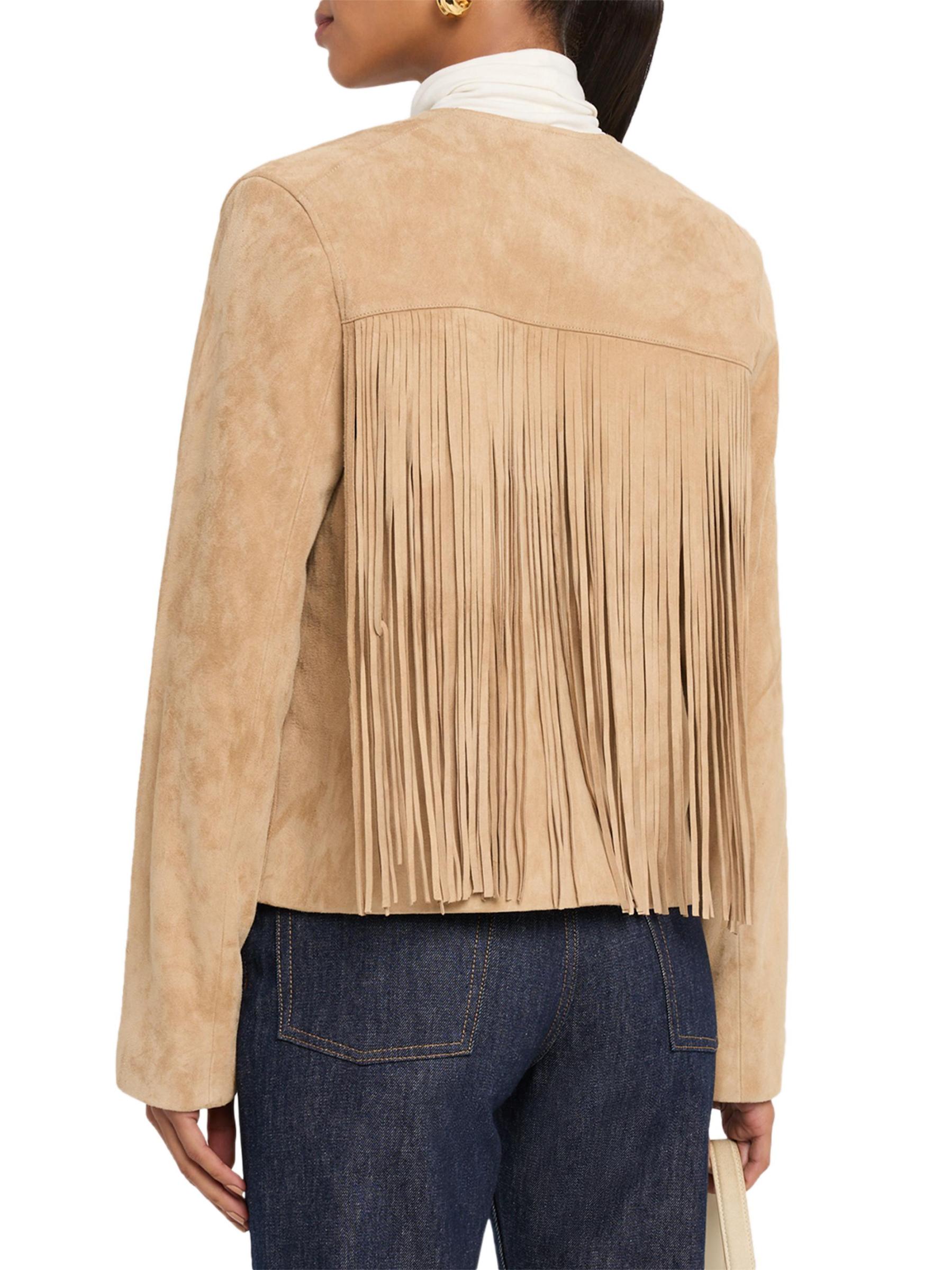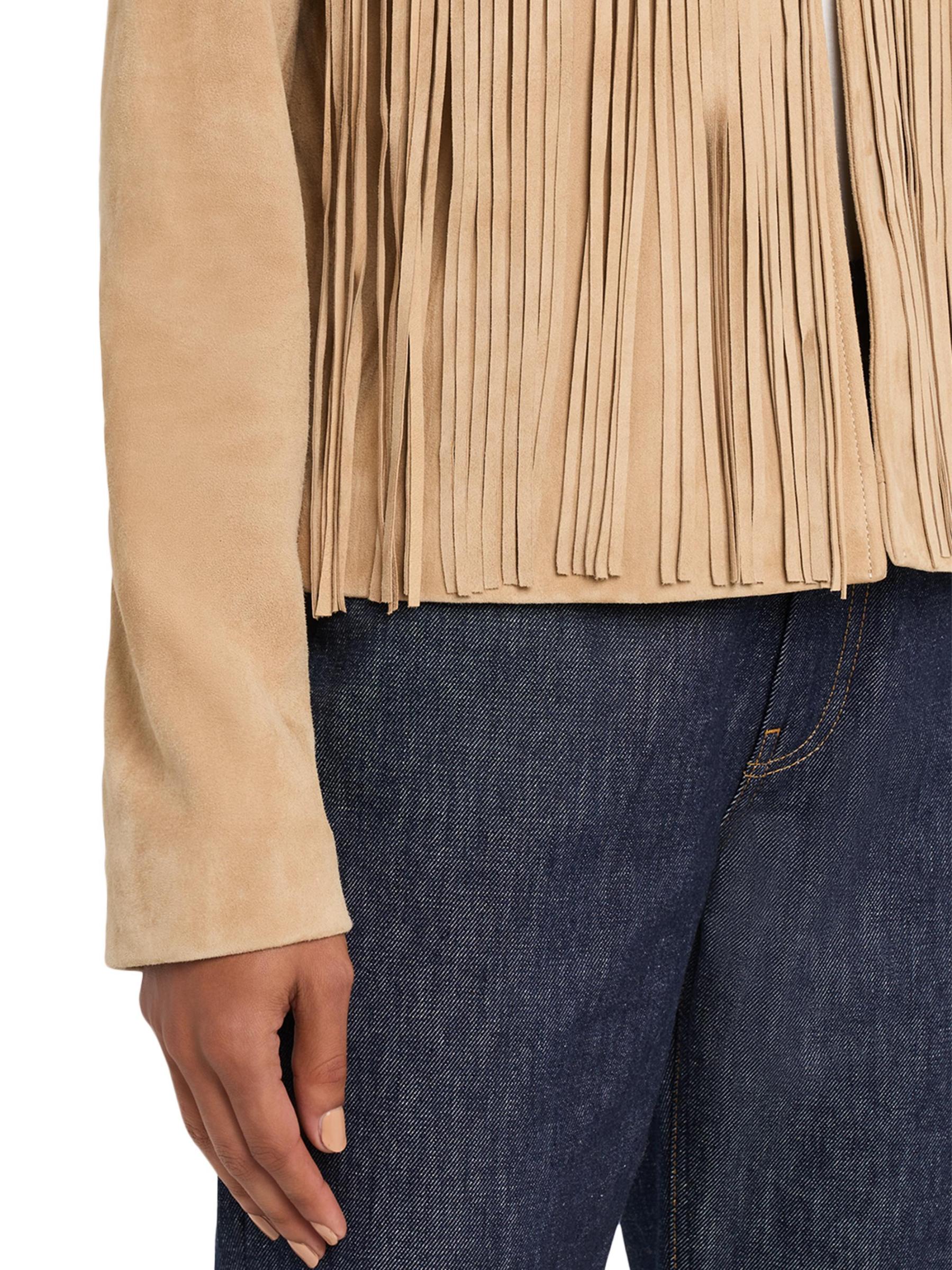 Crafted of soft lamb suede, the Chloe jacket from Fleurette is trimmed with long fringe trim.Round neck Long sleeves Front hook-and-eye closure 100% suede Lining: 100% polyester Dry clean by leather specialist Imported