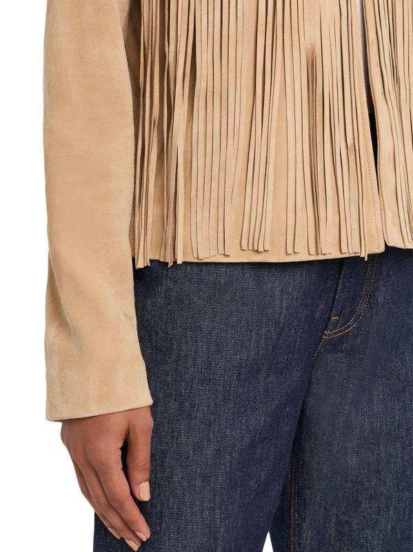 Crafted of soft lamb suede, the Chloe jacket from Fleurette is trimmed with long fringe trim.