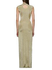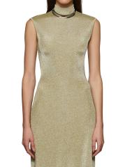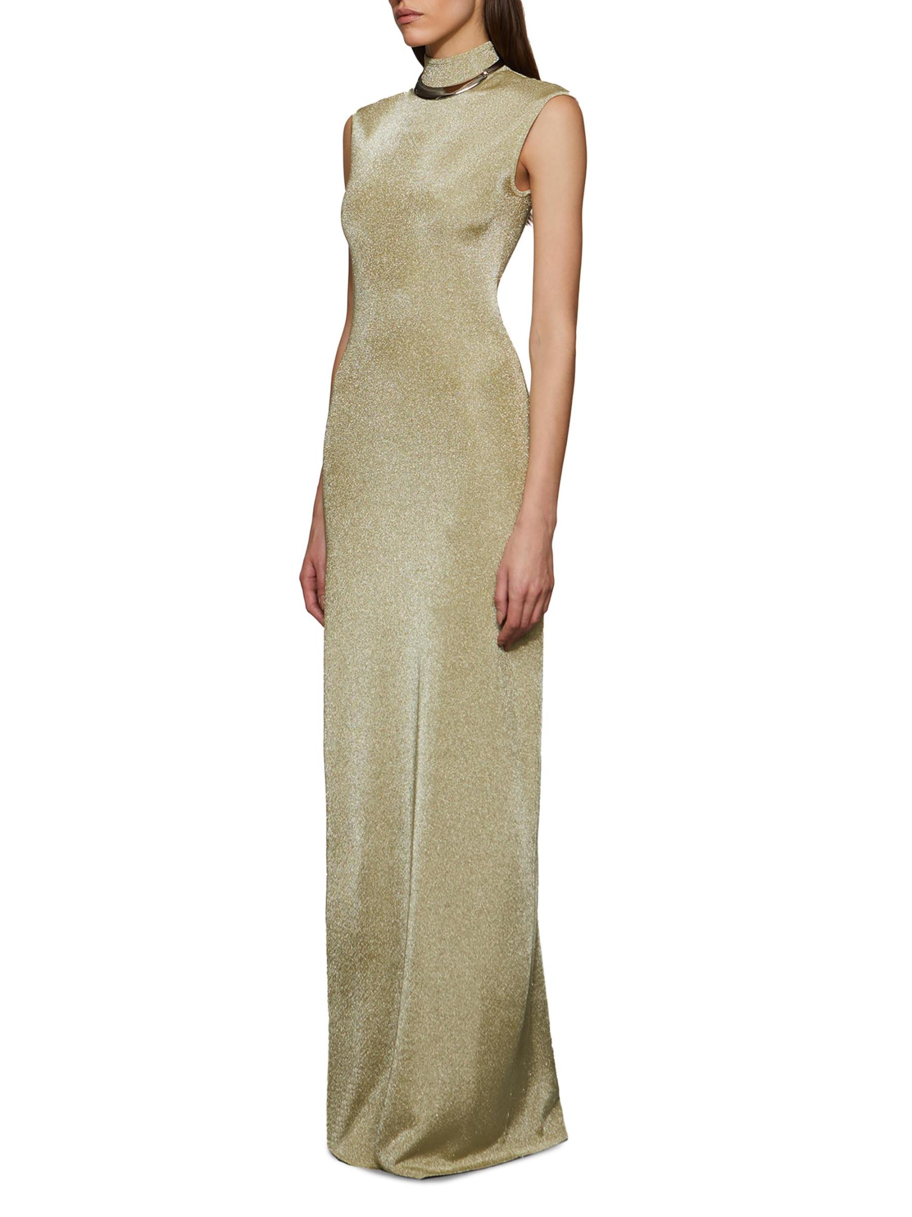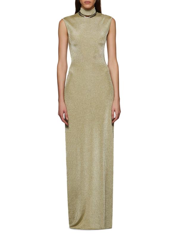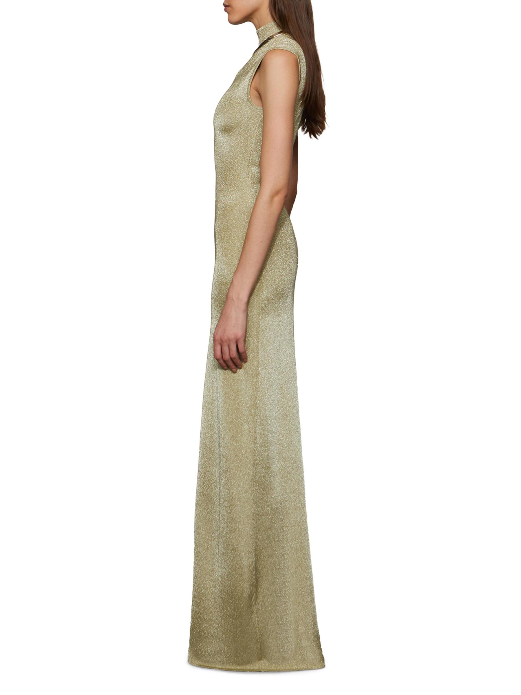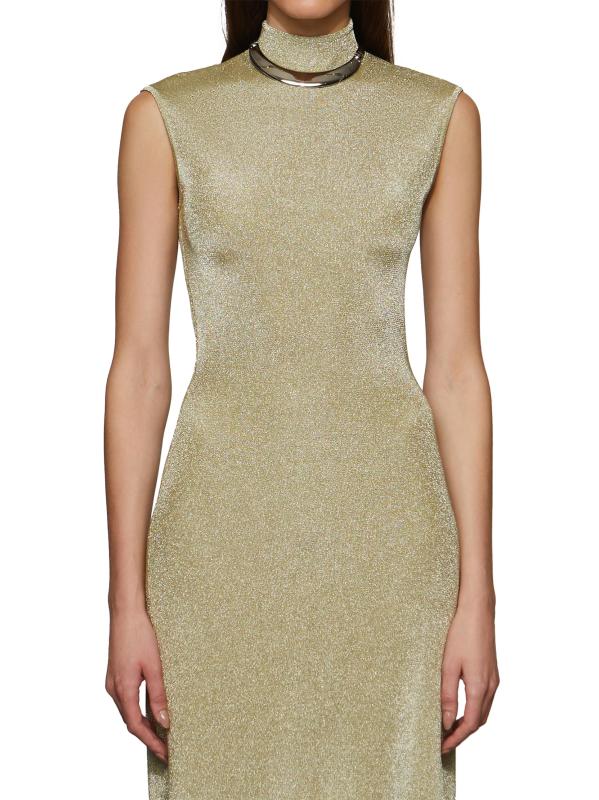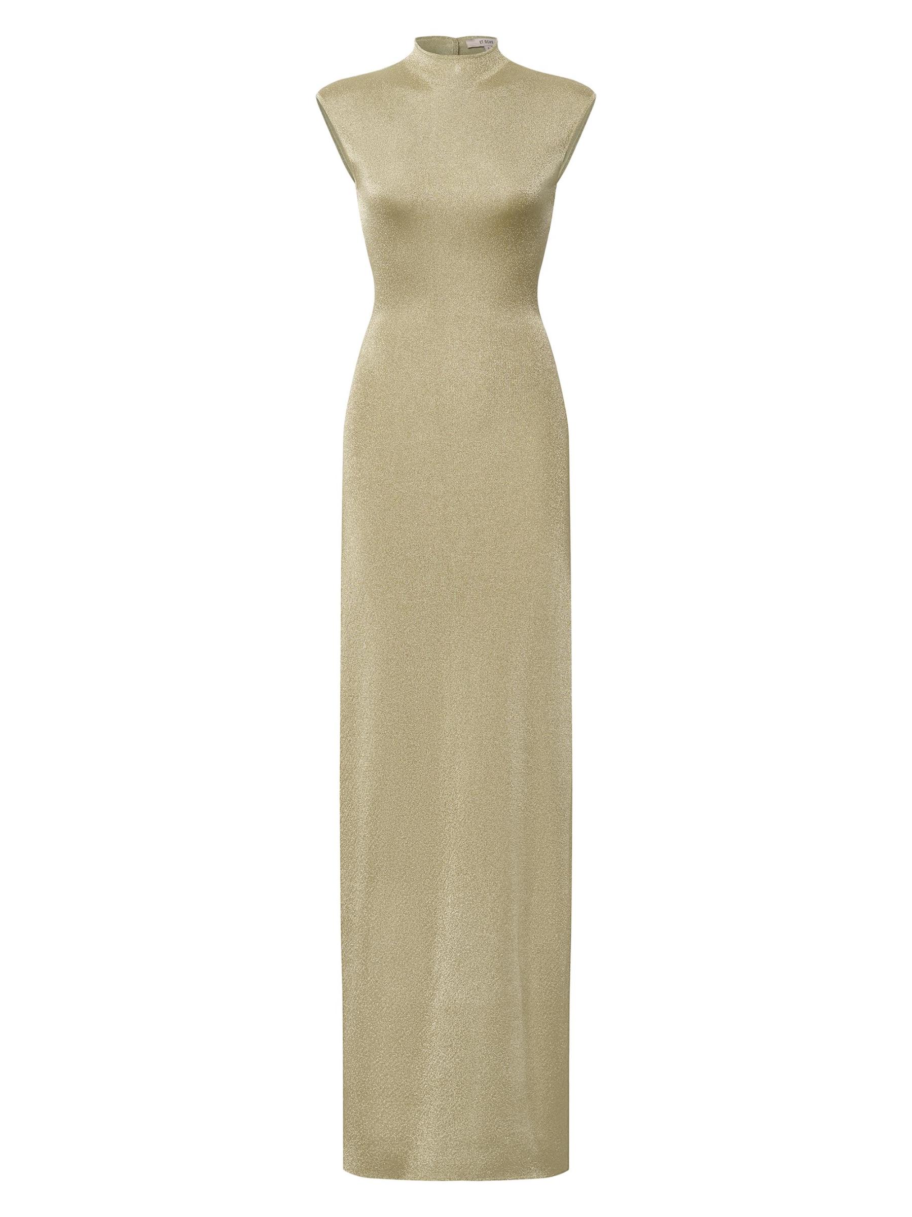 Crafted of a compact metallic knit, Et Ochs' Clare sleeveless maxi dress is cut for a sleek, formfitting silhouette and styled with mock turtleneck.