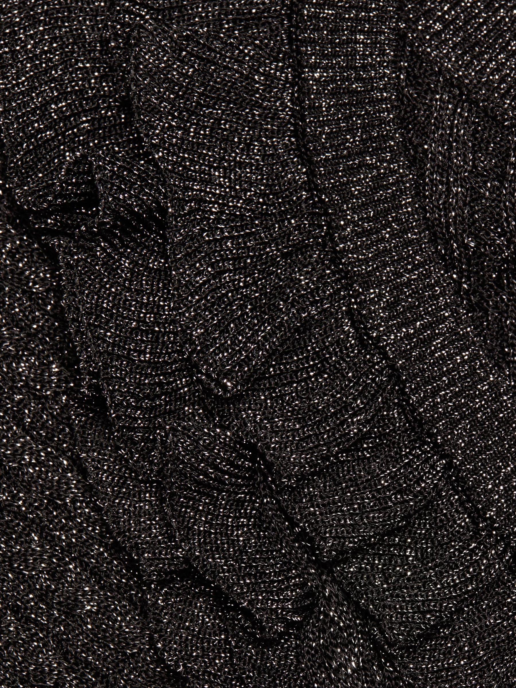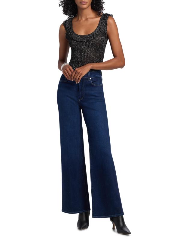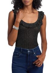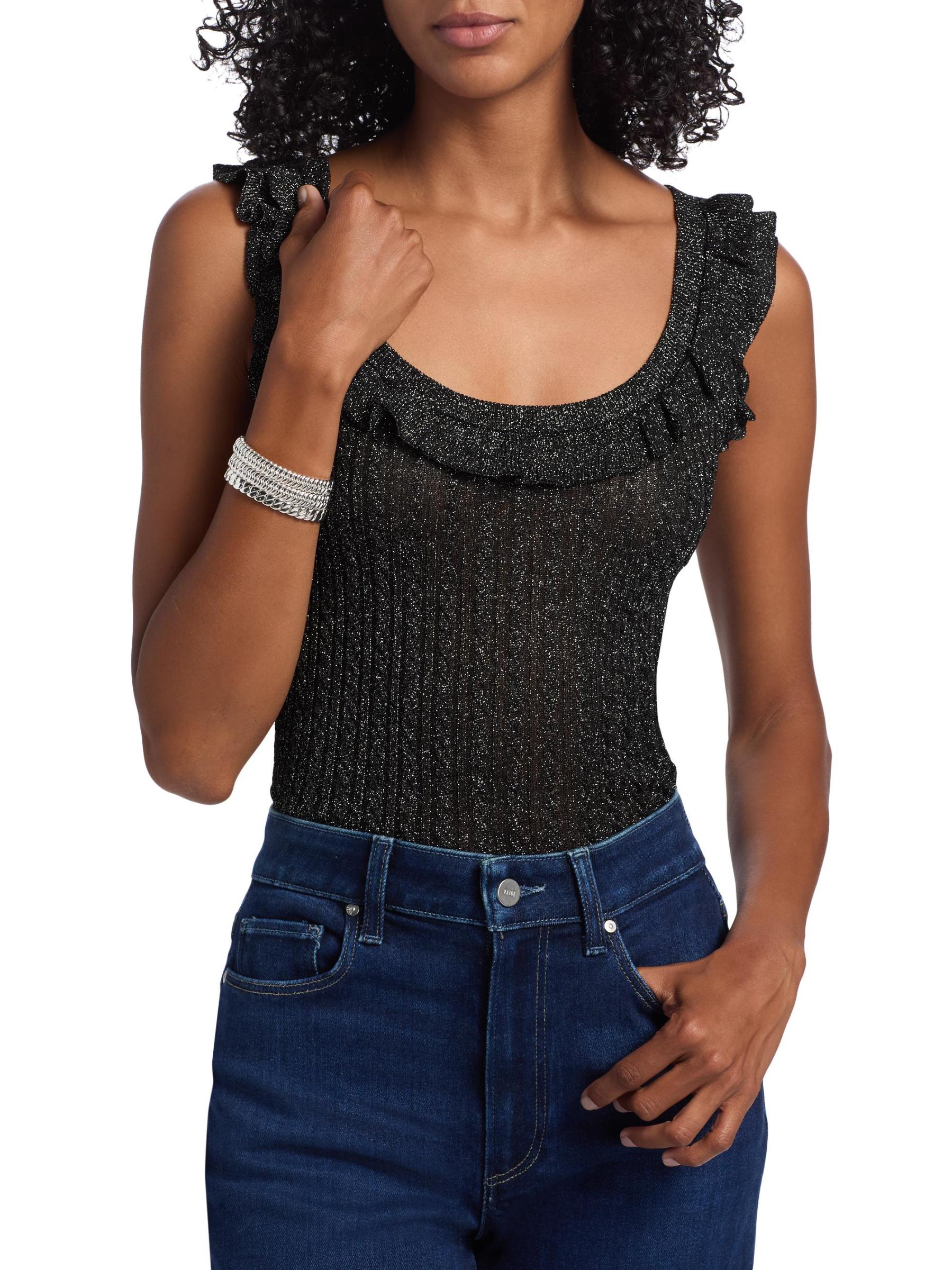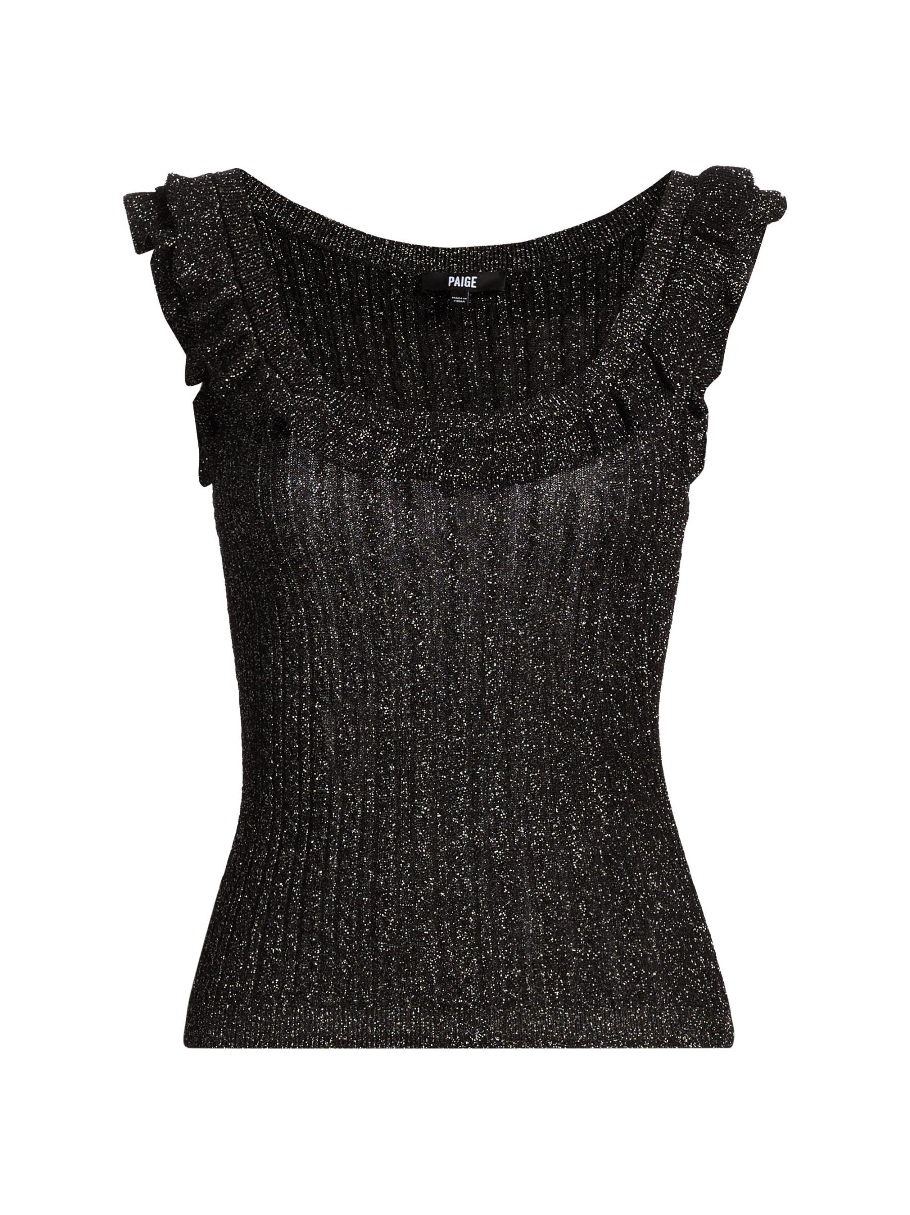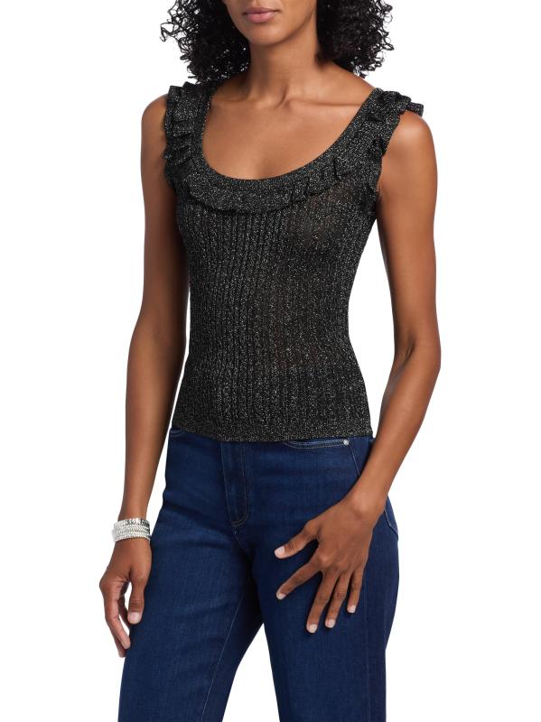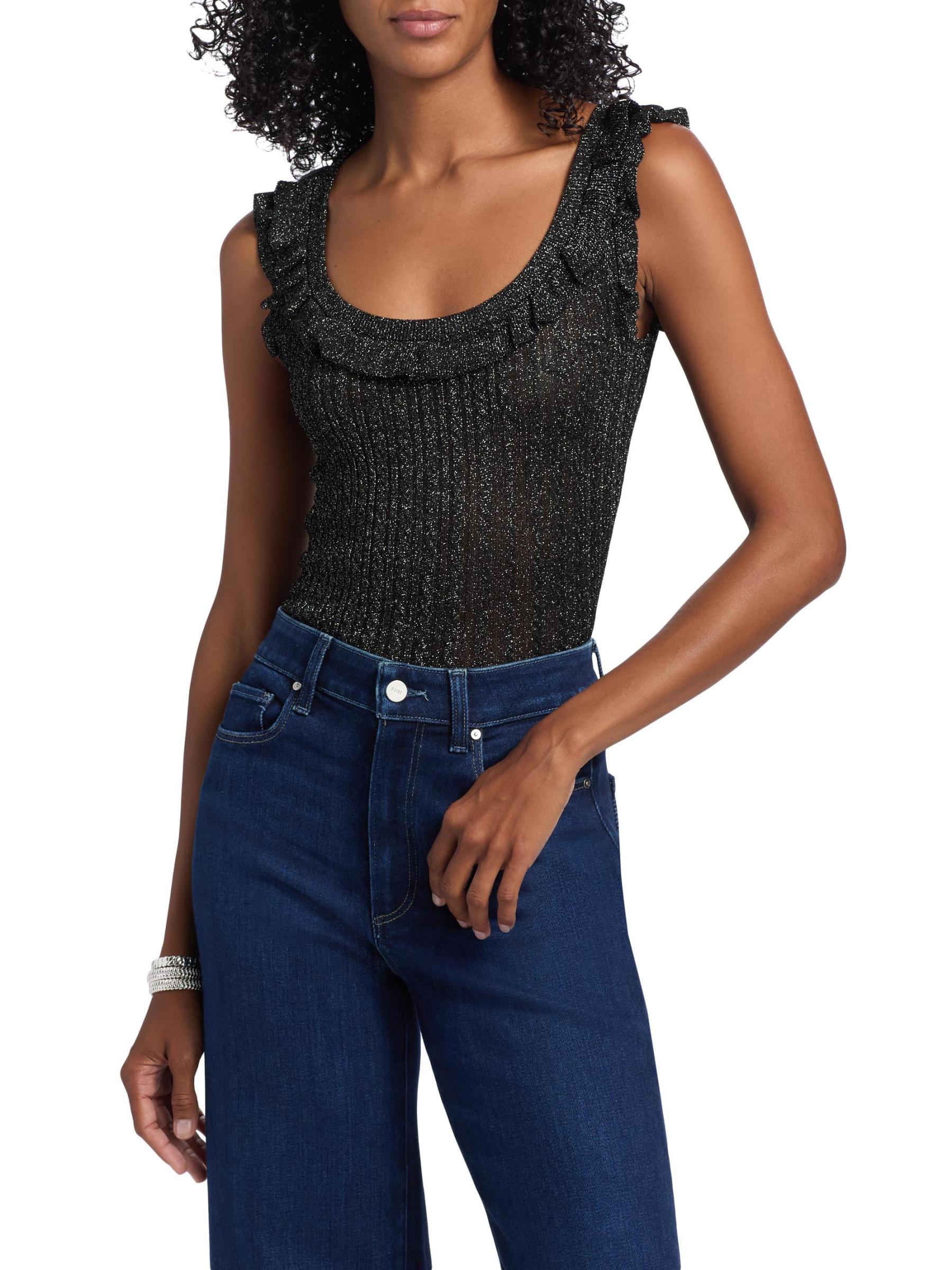 This Clareen sweater tank from Paige is crafted of a metallic rib-knit. A ruffled scoop neckline lends playful detail to this style.
