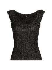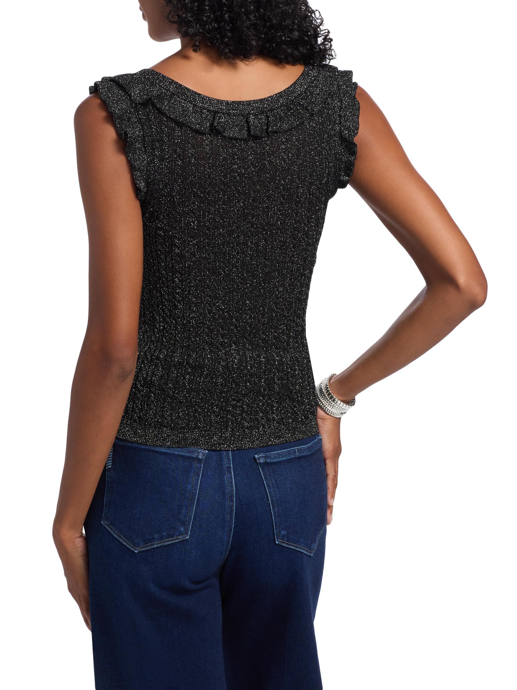 This Clareen sweater tank from Paige is crafted of a metallic rib-knit. A ruffled scoop neckline lends playful detail to this style.Scoopneck Sleeveless Pulls over 87% viscose/13% polyester Dry clean Imported