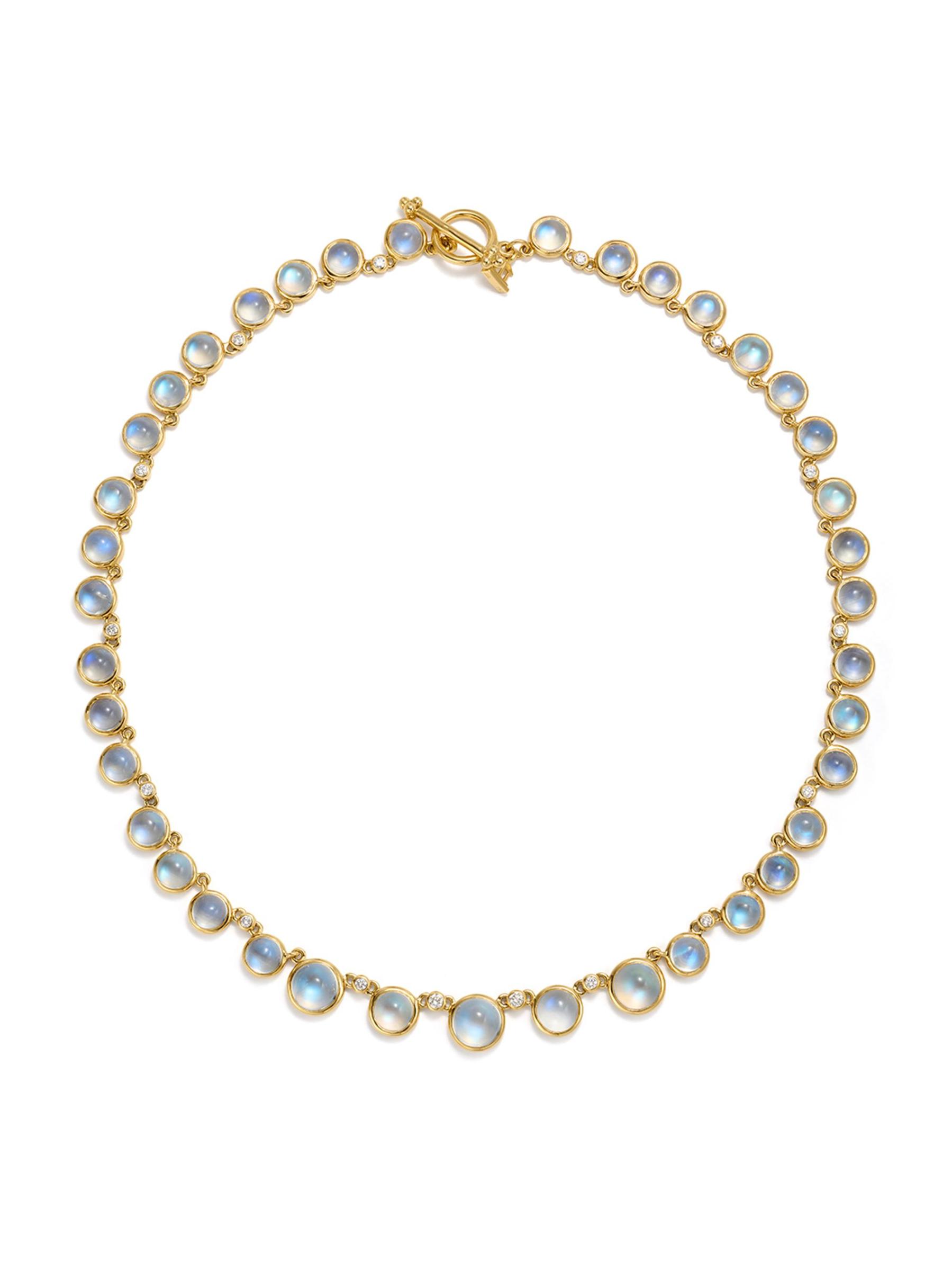 From the Classic Collection. Temple St. Clair's necklace is crafted of 18K yellow gold set with alternating round blue moonstone cabochons and shimmering diamonds. This elegant accessory is finished with the label's signature temple motif at the toggle clasp.Blue moonstone cabochons, 50.66 tcw Diamonds, 0.65 tcw Diamond color grade: G Diamond clarity grade: VS1 18K yellow gold Toggle clasp Made in Italy