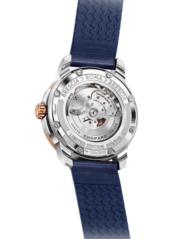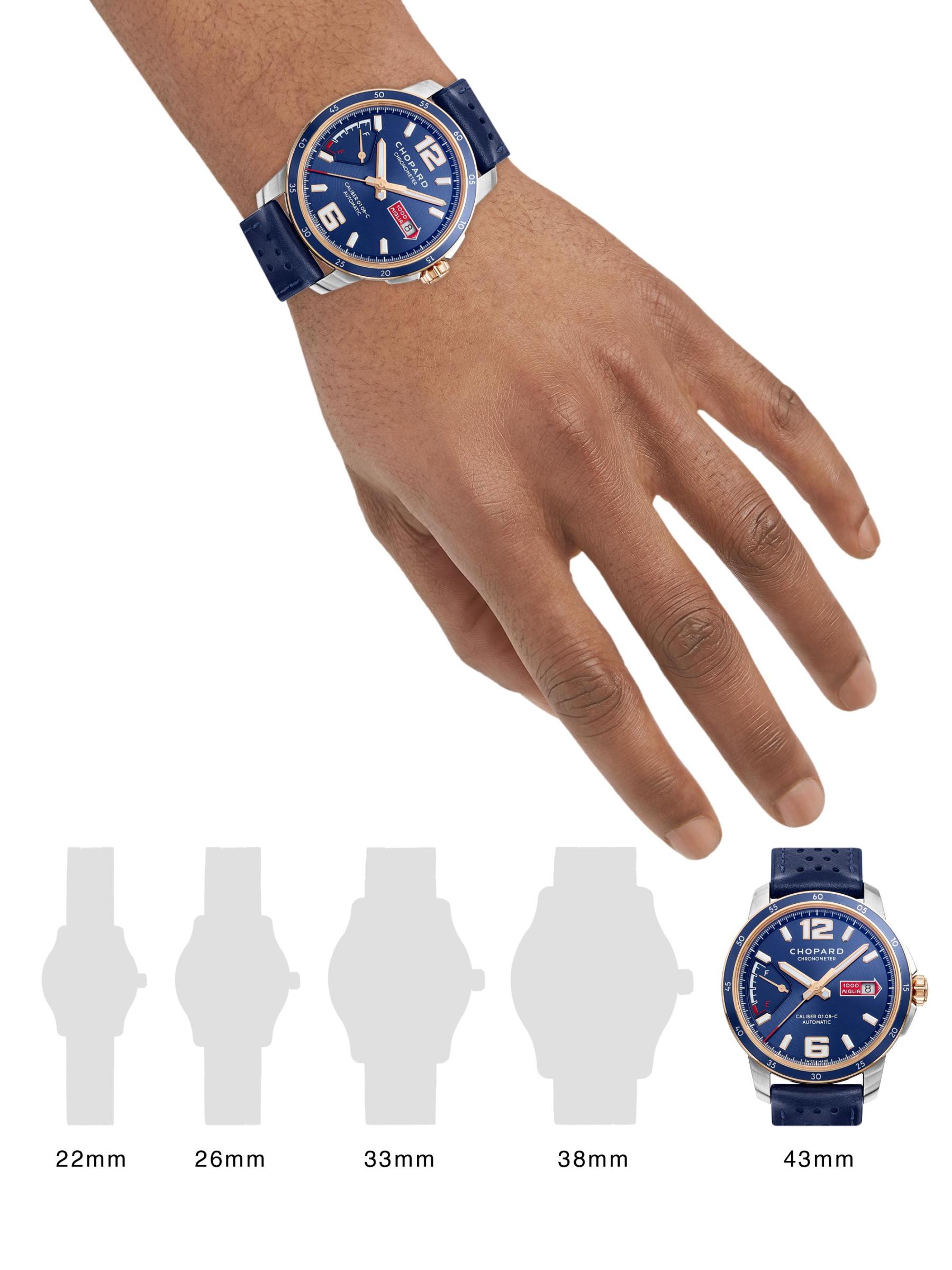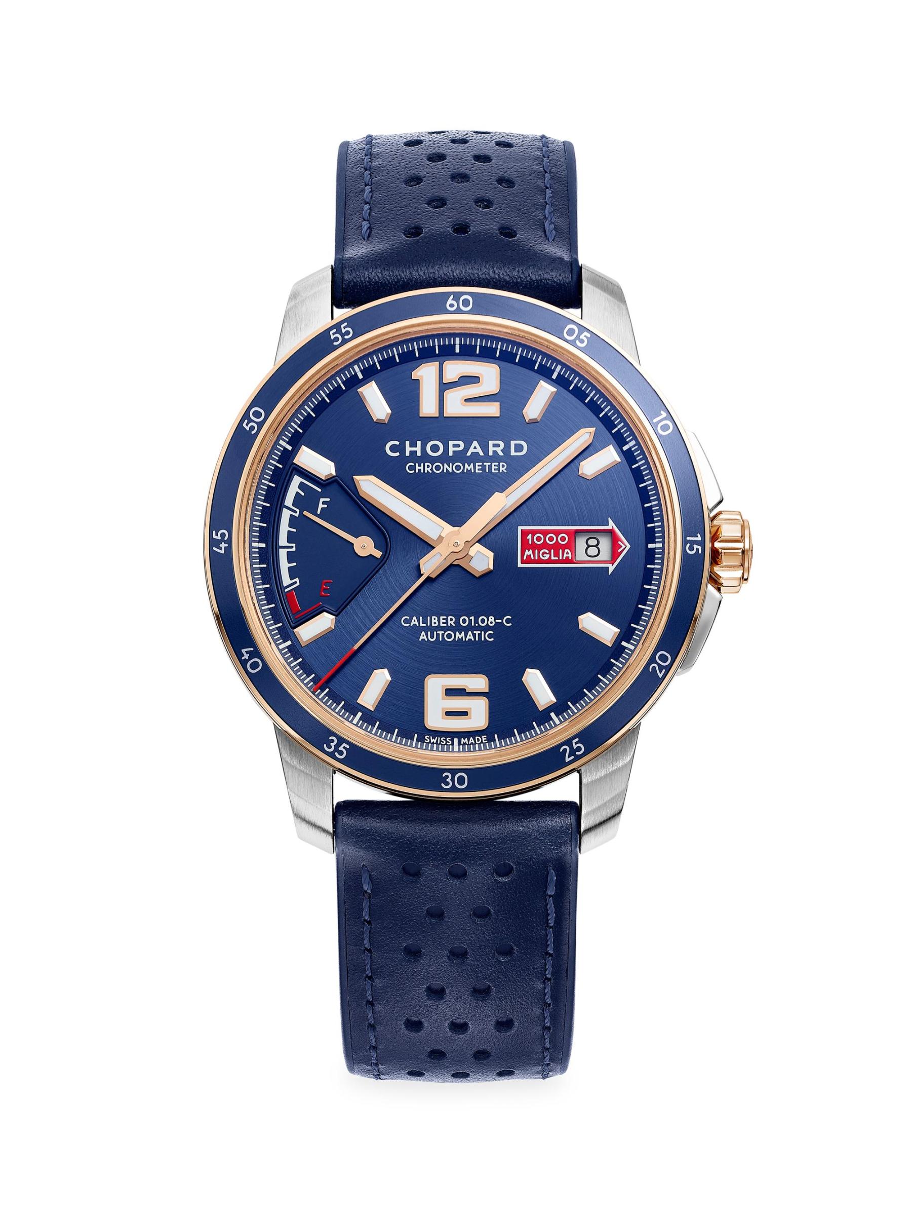 The Classic Racing Collection builds a bridge between automotive engineering and mechanical watchmaking, the result of Karl-Friedrich Scheufele's passion. Bold and assertive, the Mille Miglia GTS Azzurro Power Control watch is cast in stainless steel and 18K rose gold with a perforated blue leather strap. The dial is inspired by a dashboard, featuring an elegant "Azzurro" blue dial with a red Mille Miglia logo and an arrow-shaped race logo framing the date window.01.08-C Caliber self-winding mechanical movement See-through sapphire crystal case back Screw-down crown Satin-brushed blue dial with red Mille Miglia logo Power reserve indicator Rhodium-plated Arabic numerals and Super-LumiNova coated hour markers Date display at 3 o'clock Second hand 18K rose gold