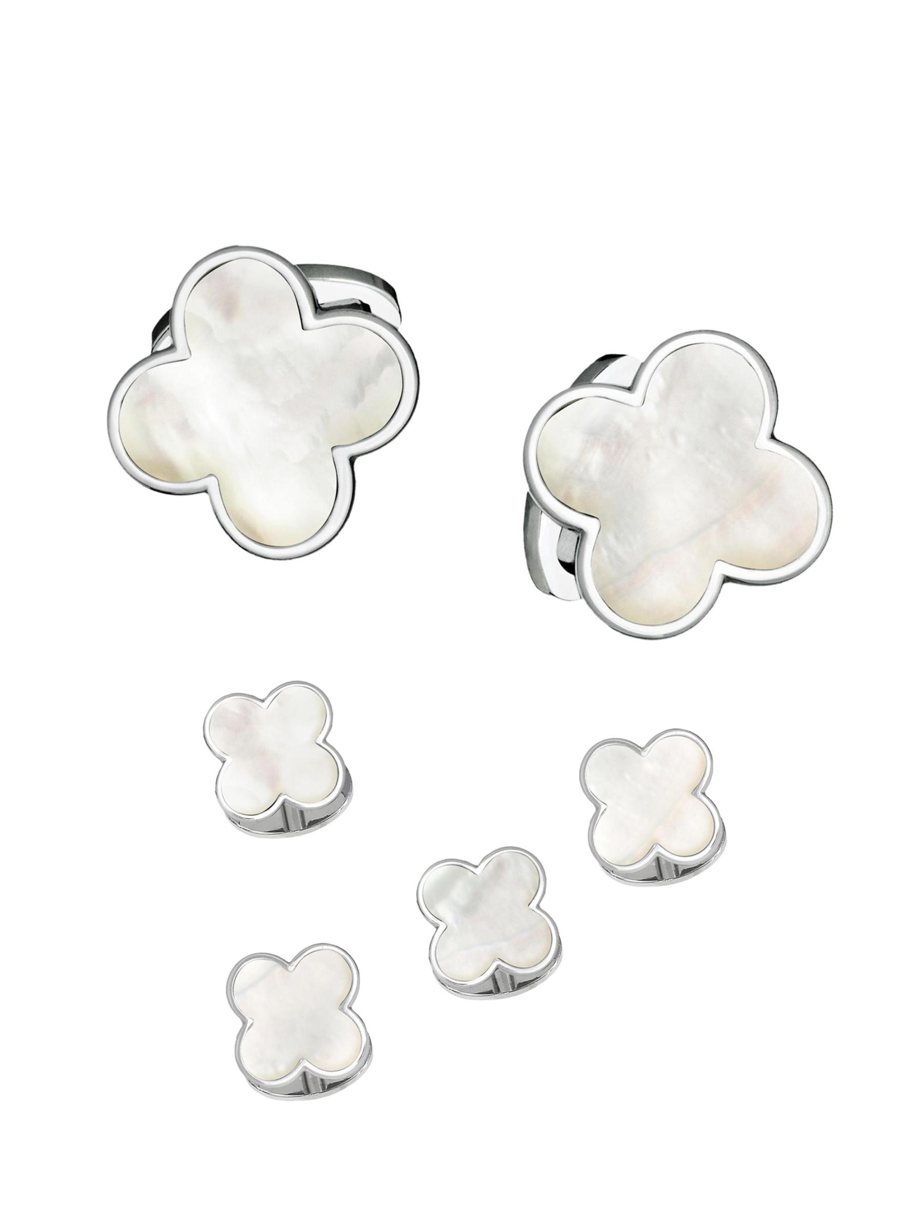 Crafted in the shape of a lucky four-leaf clover, this sleek six-piece cufflinks and shirt studs set is crafted from black onyx with rhodium-plate.Six-piece set BLACK ONYX Rhodium-plated Hinged whale back and push-stud closure Imported