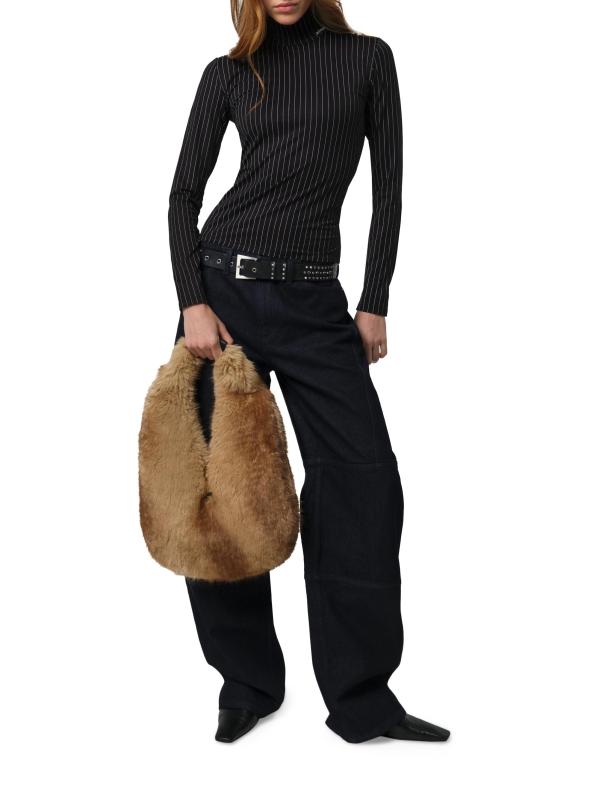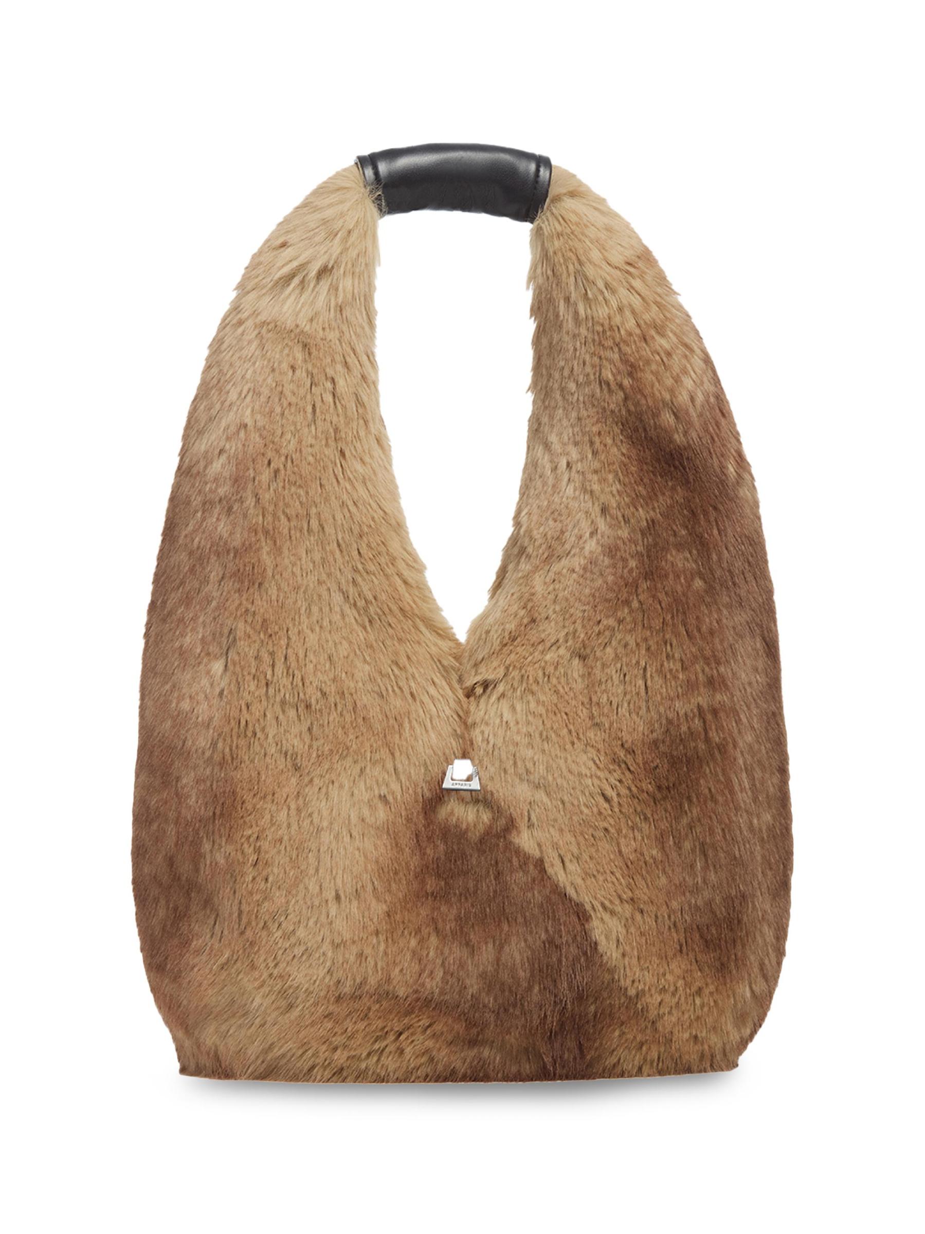 The Colette shoulder bag from Apparis is crafted of faux fur with a faux suede lining. It features a structured silhouette and a removable handle cover.