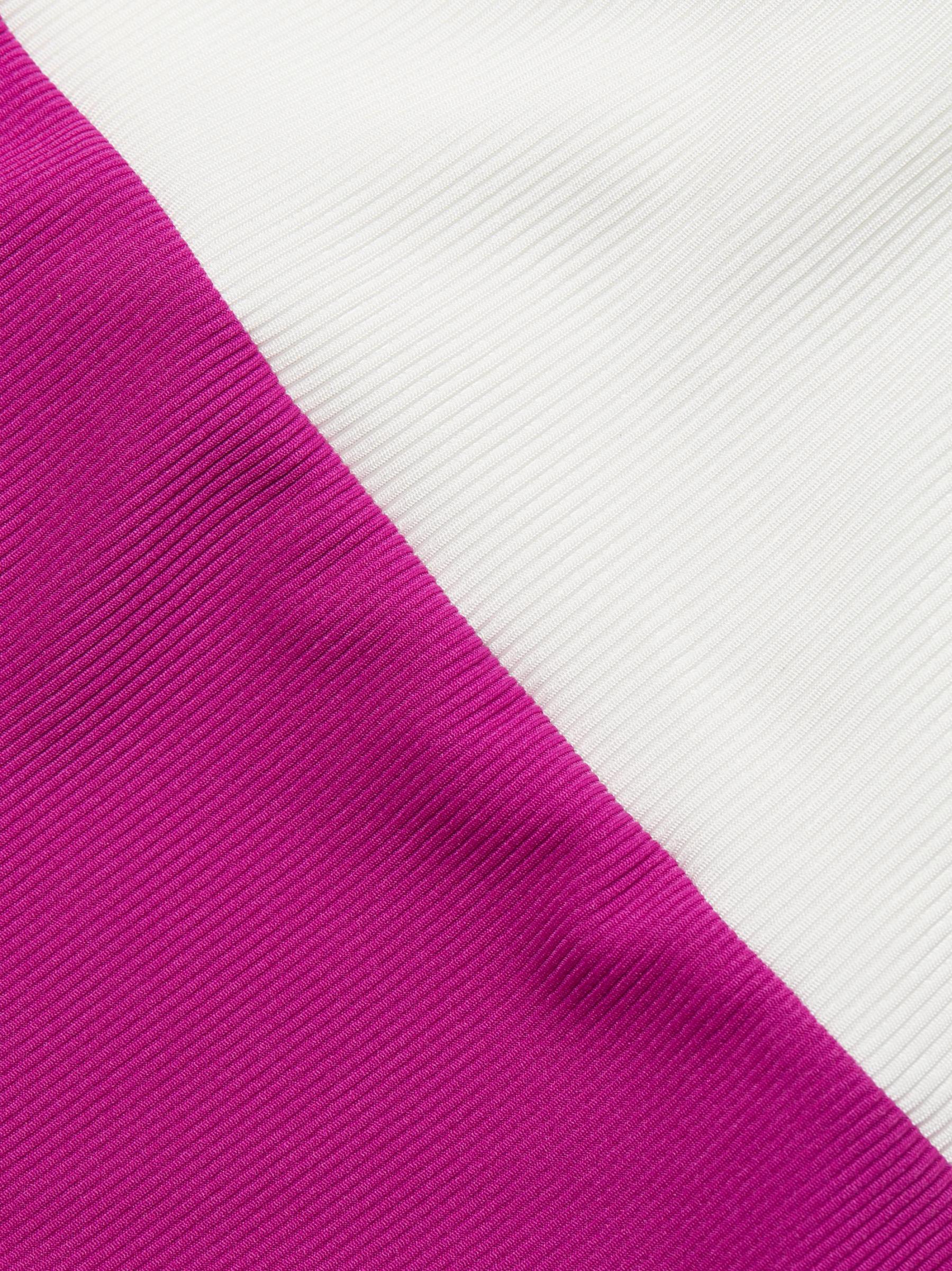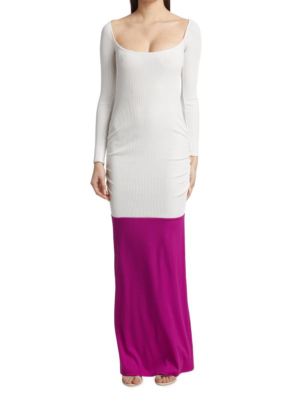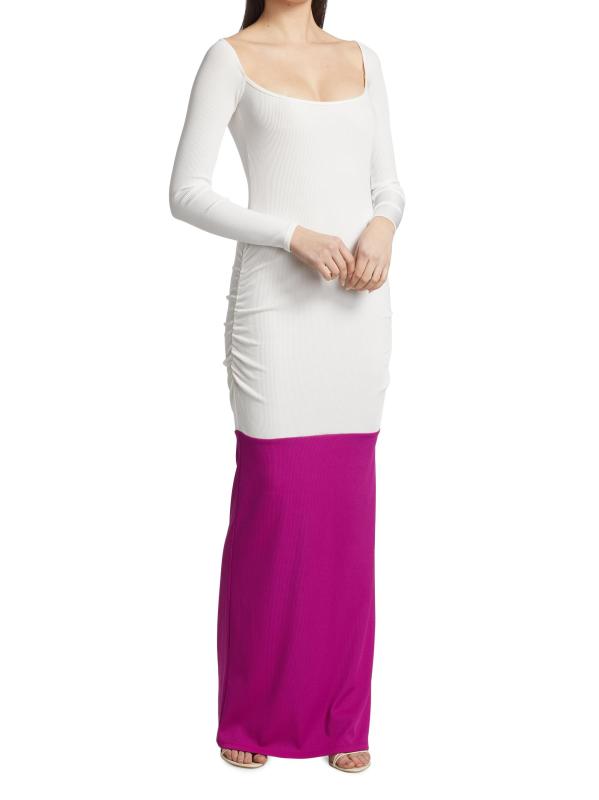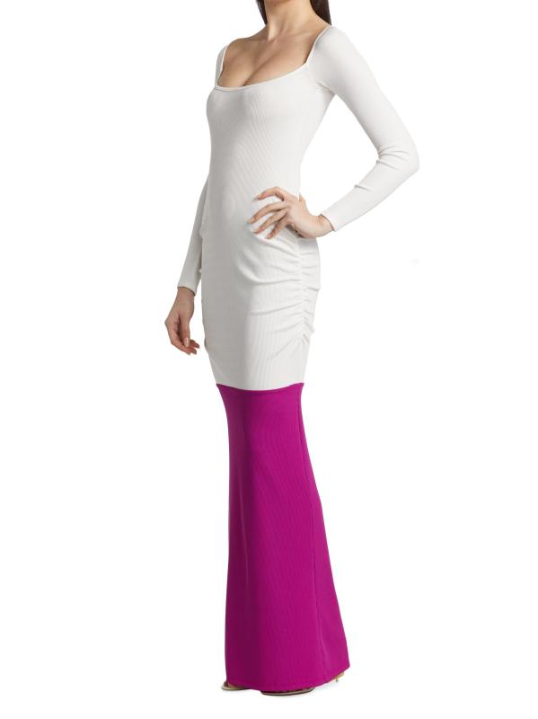 Los Angeles-based IZAYLA has captured the middle road between timeless silhouettes and contemporary fanfare. This collection represents the empowerment of women’s fashions, featuring signature fabrics and classic, conservative cuts. Styled with a circular scoopneck, this vibrant two-tone dress is finished with ruched detailing at the sides.