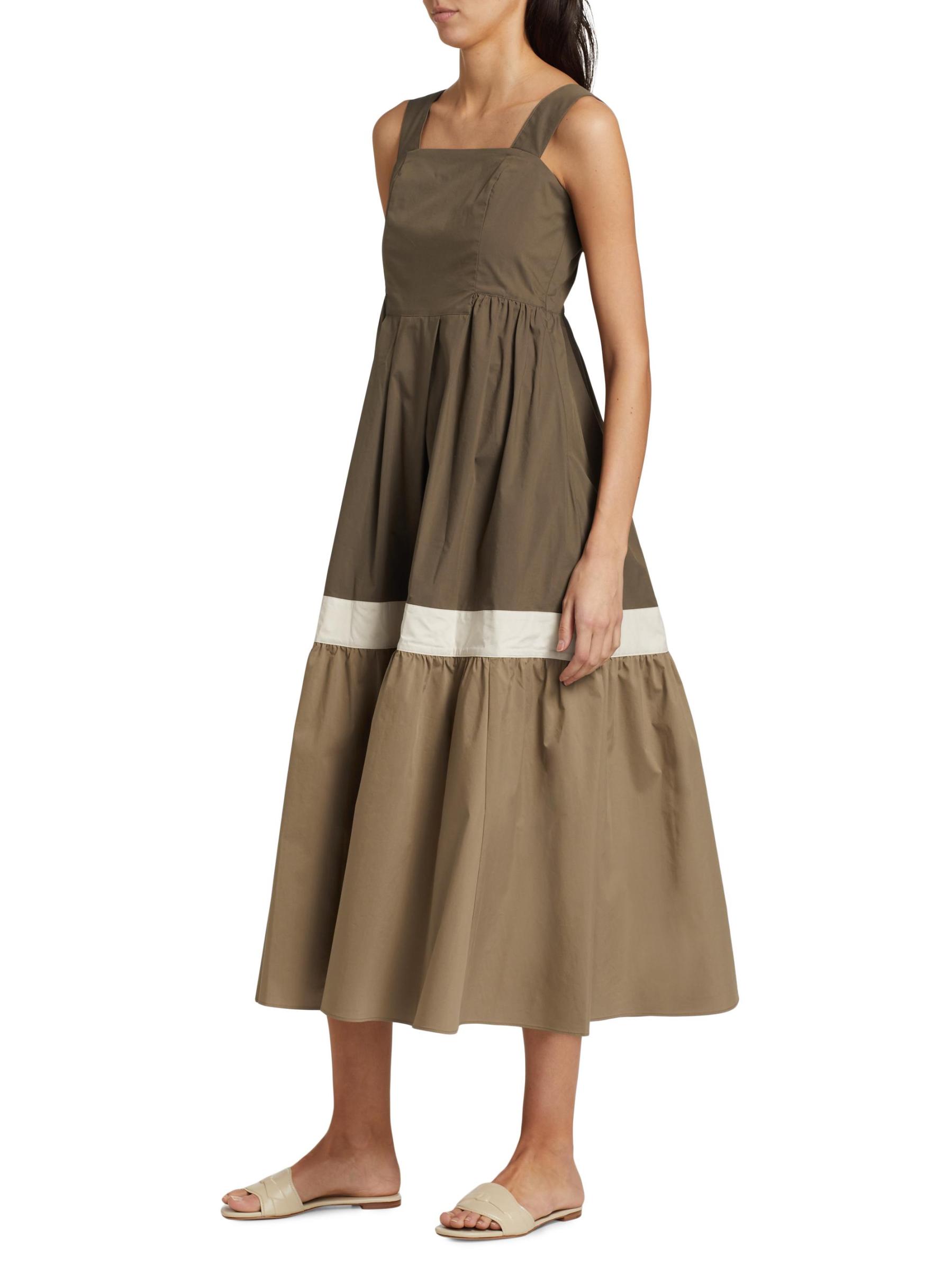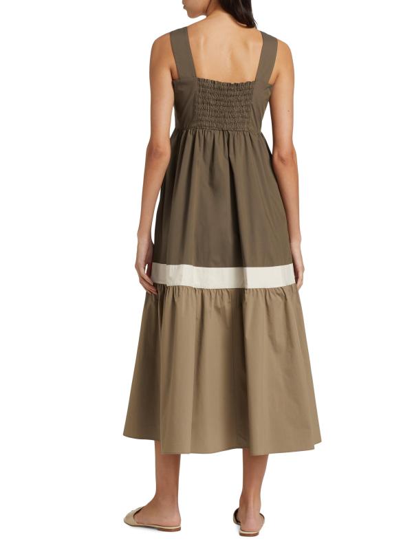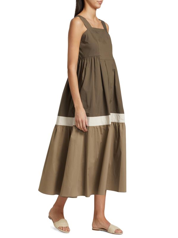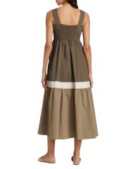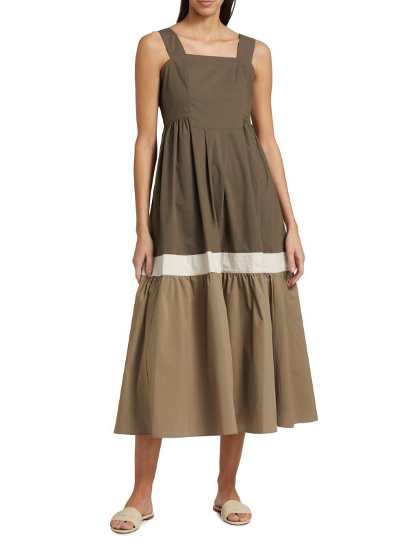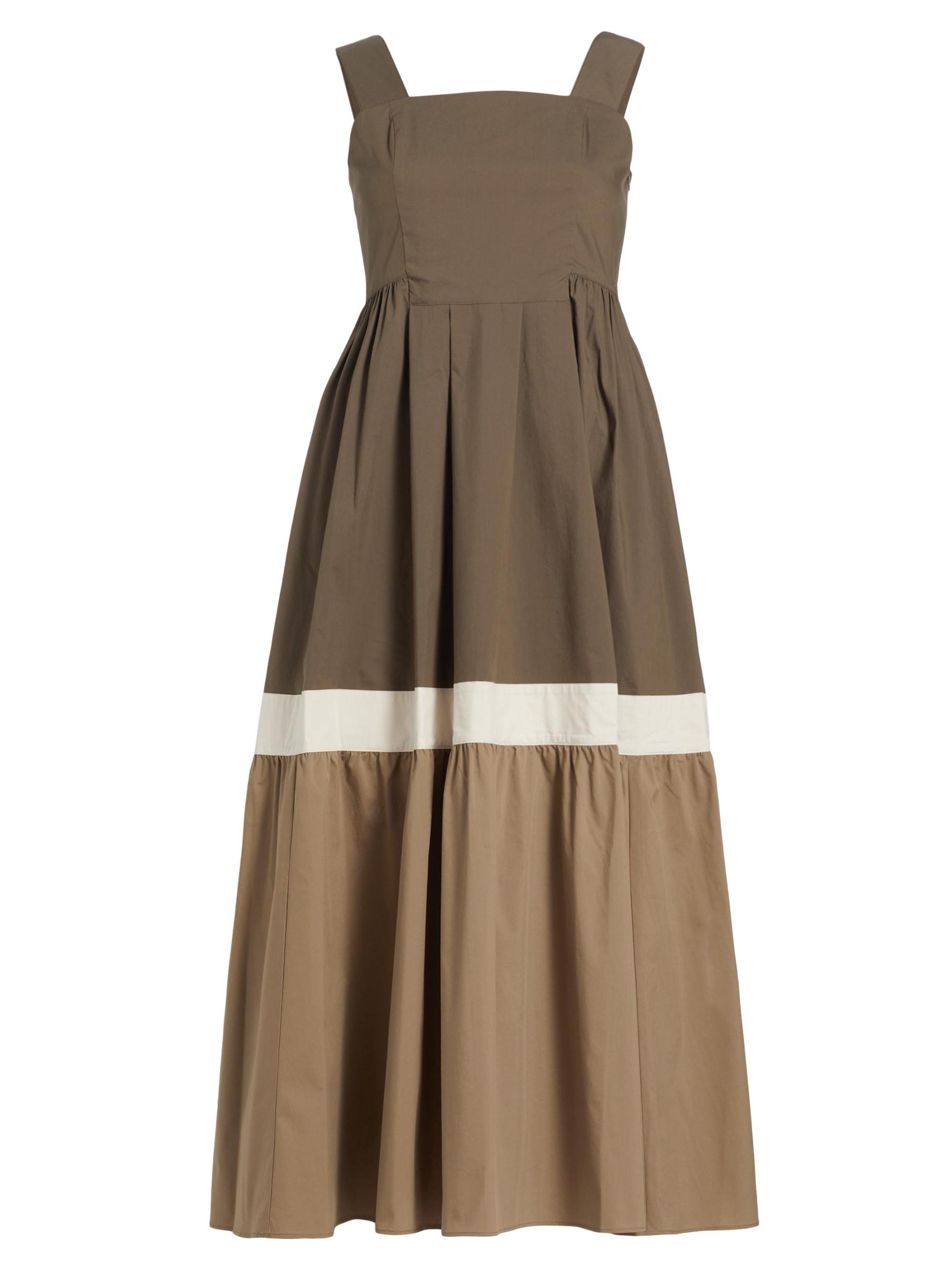 From the Sartorial Rawness Collection. This midi-dress from Barneys New York features a colorblocked design and pleated single-tiered skirt. Wide straps and a comfortable smocked back finish the look.