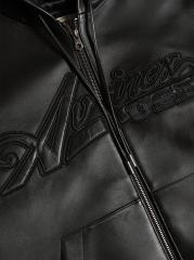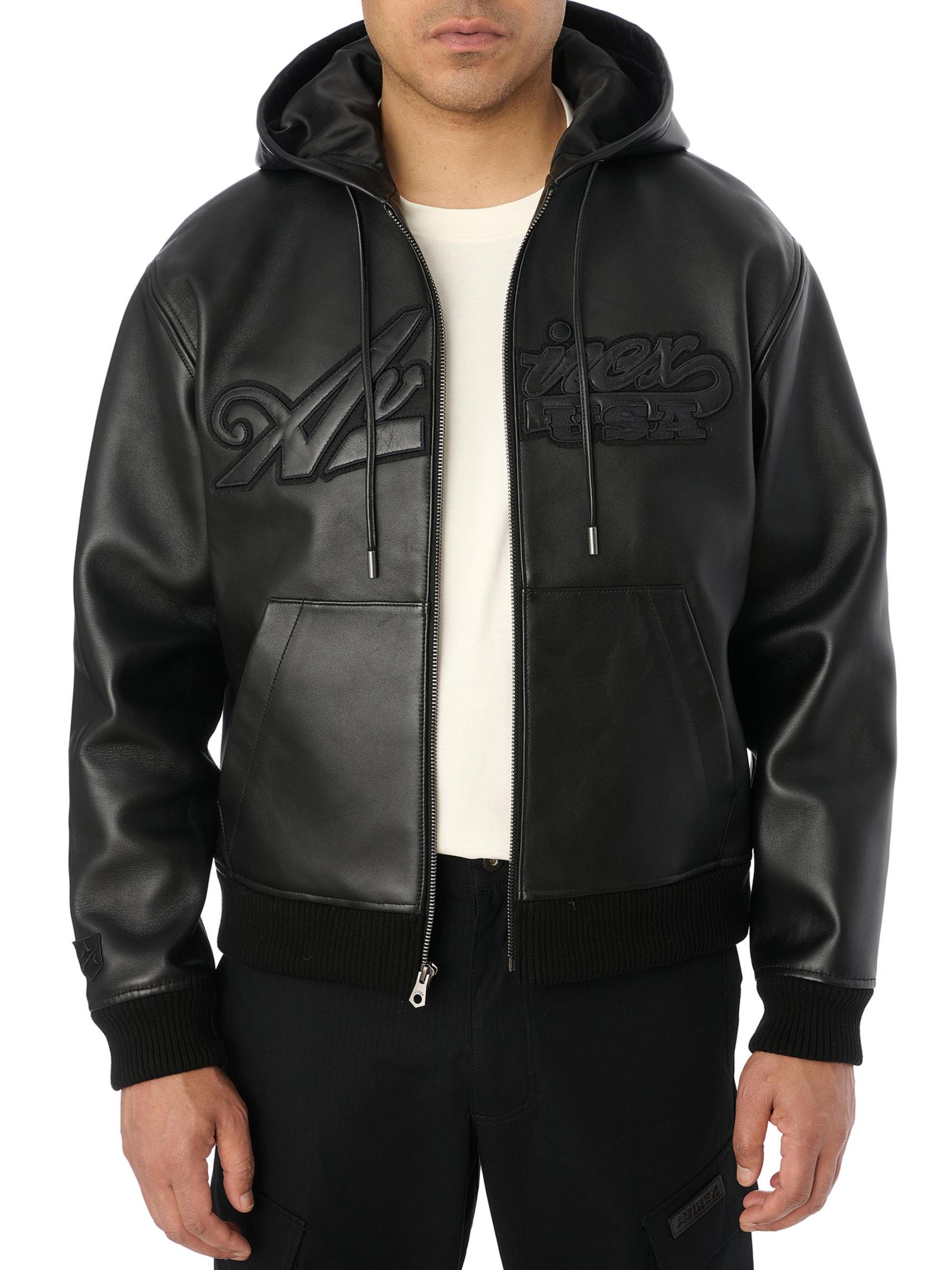 From the Core Collection. This Avirex hoodie is crafted of luxe nappa leather and detailed with a tonal logo script patch on the chest. Rib-knit trim and a split kangaroo pocket lend added comfort to this full-zip style.