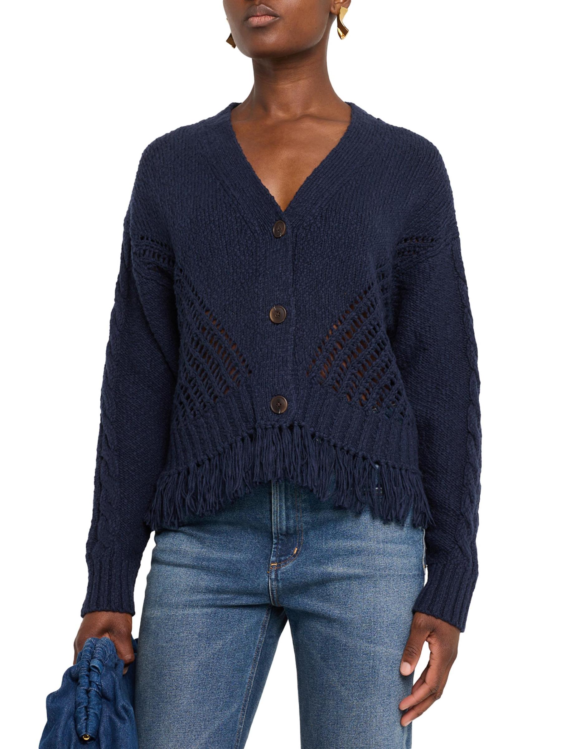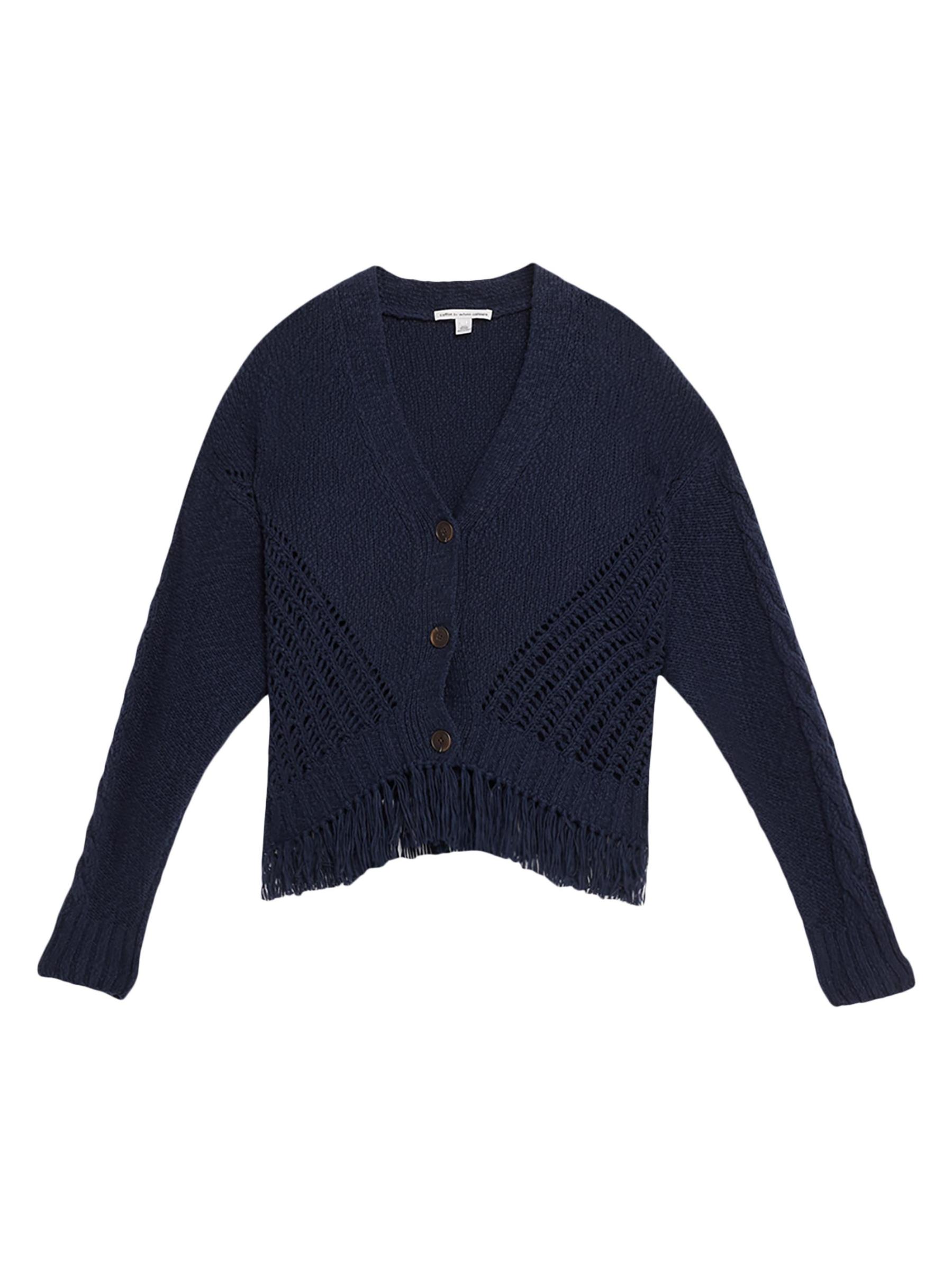Knit from soft cotton, this V-neck cardigan from Autumn Cashmere is designed with a fringed hem.V-neck Drop shoulders Long sleeves Fringed trim Button front closure 100% Cotton Hand wash Imported