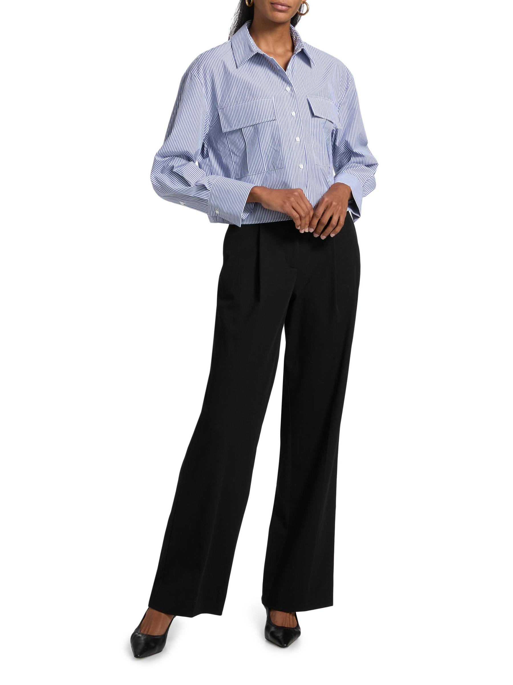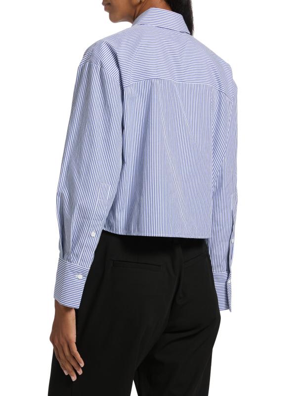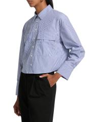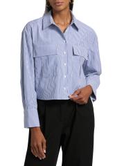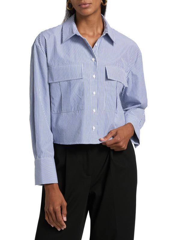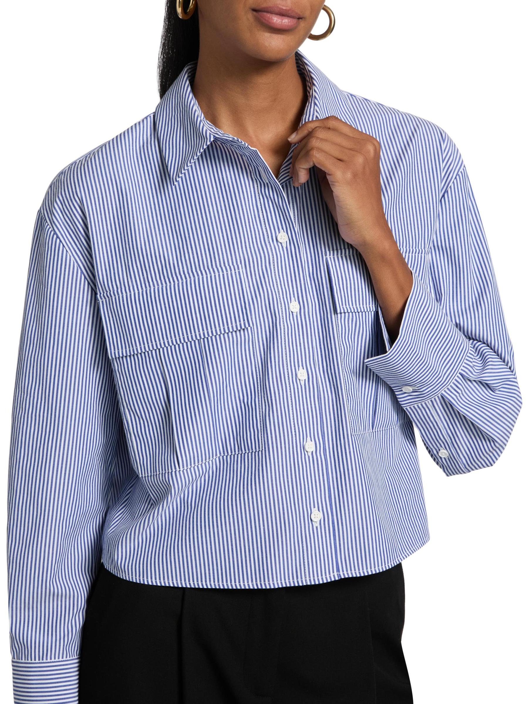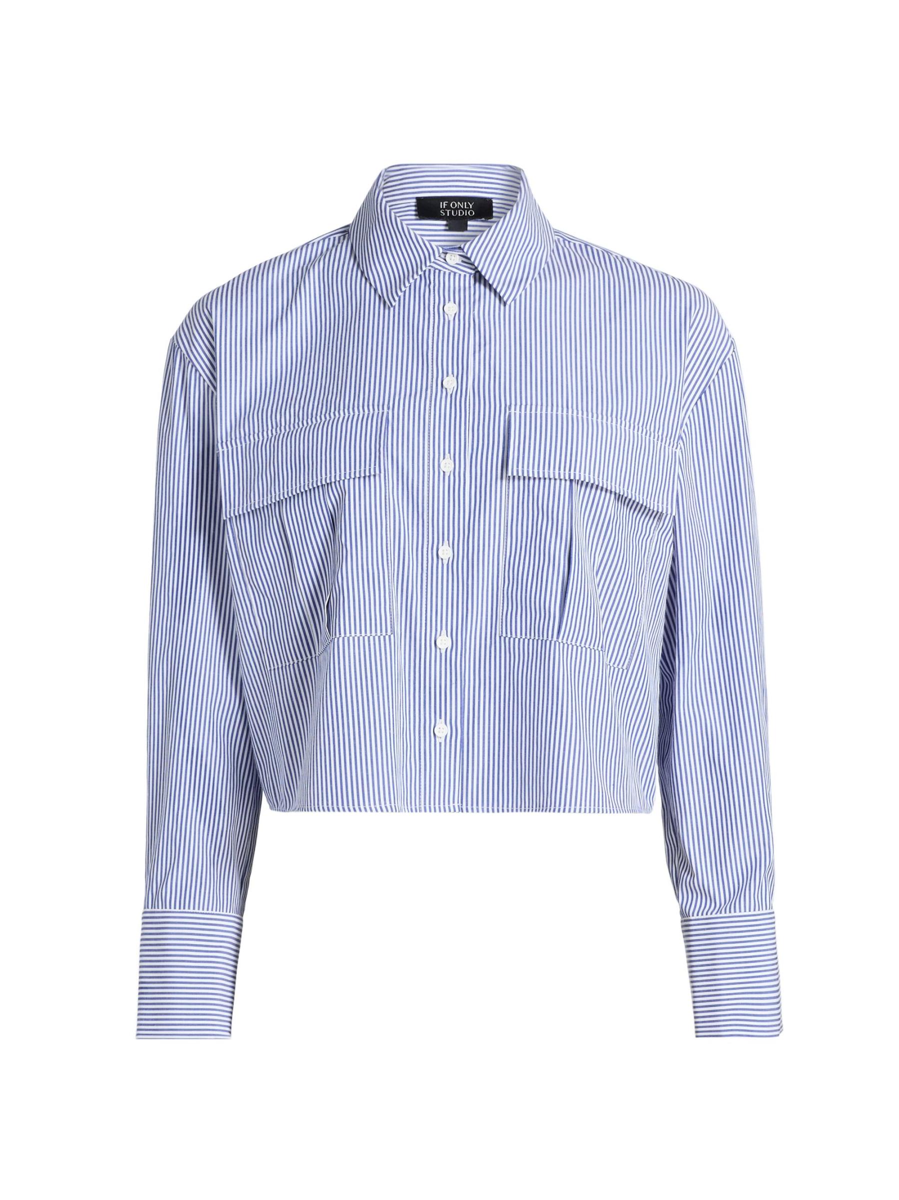 Cut in a cropped silhouette, Only Studio's striped shirt blouse is crafted of a stretch nylon-cotton blend. Chest flap pockets complete the look.Spread collar Long sleeves Chest flap pockets Button front closure 63% nylon/34% cotton/3% spandex Dry clean Imported