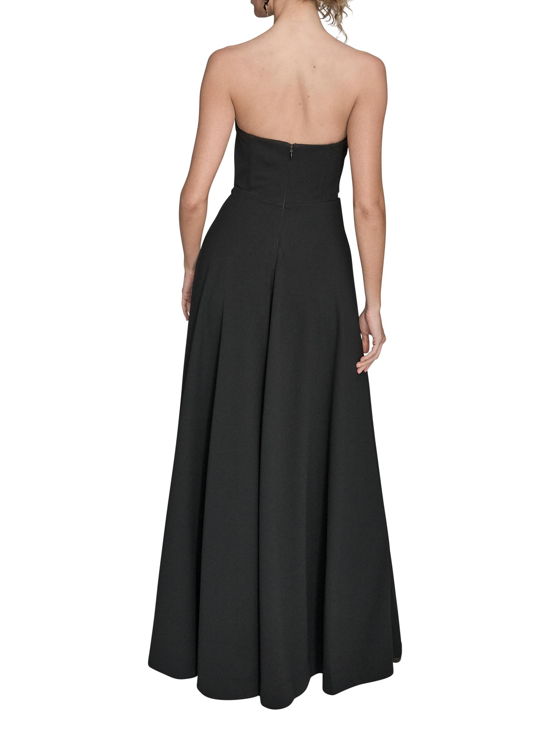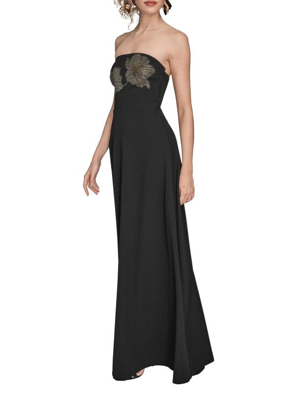 This strapless DKNY gown is adorned with floral crystal embellishment.Strapless Open back Back zip closure 94% polyester/6% spandex Lining: 100% polyester Dry clean Imported