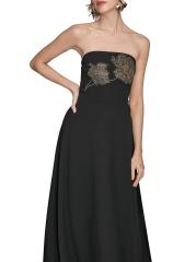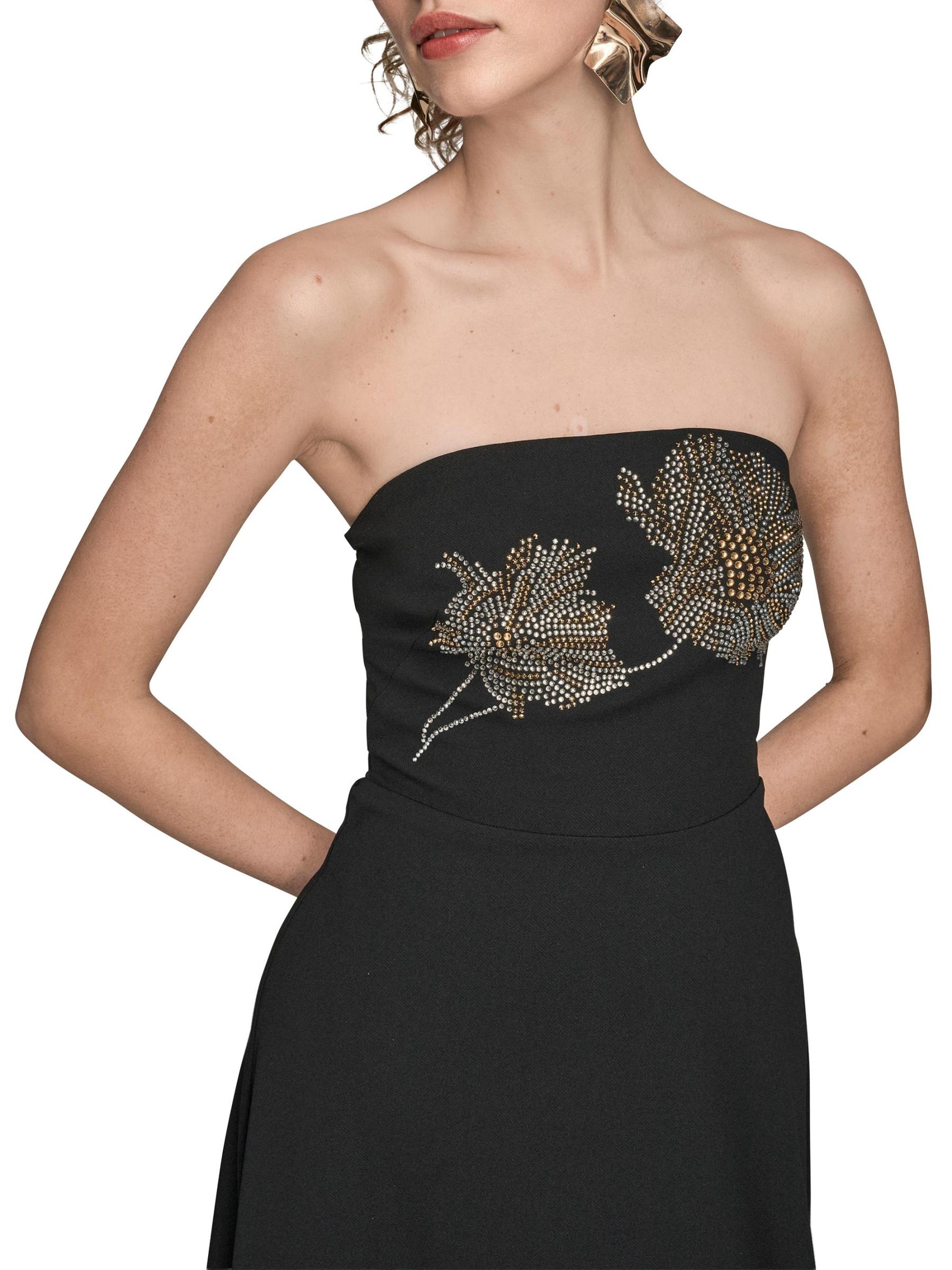 This strapless DKNY gown is adorned with floral crystal embellishment.