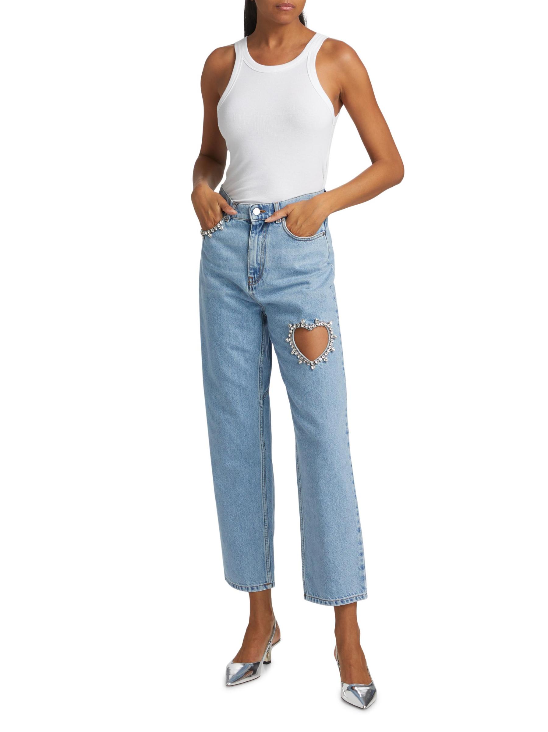 Crafted of Italian pure cotton denim, Area's Crystal Heart jeans showcase an embellished heart cutout, trimmed pocket, and heart-shaped seam at the rear. This straight-leg piece features a mid-rise and relaxed silhouette.