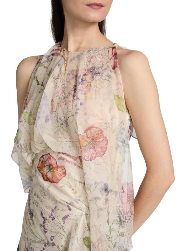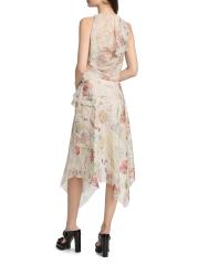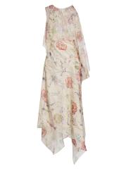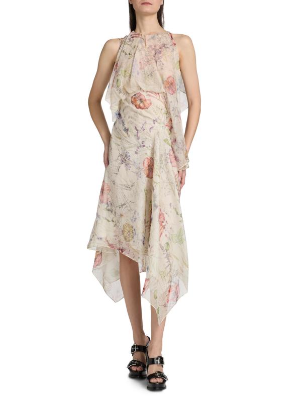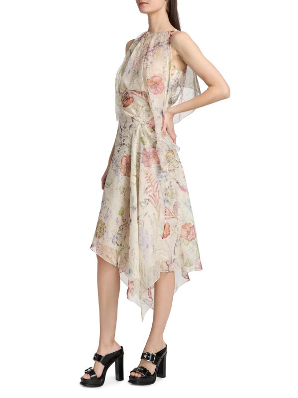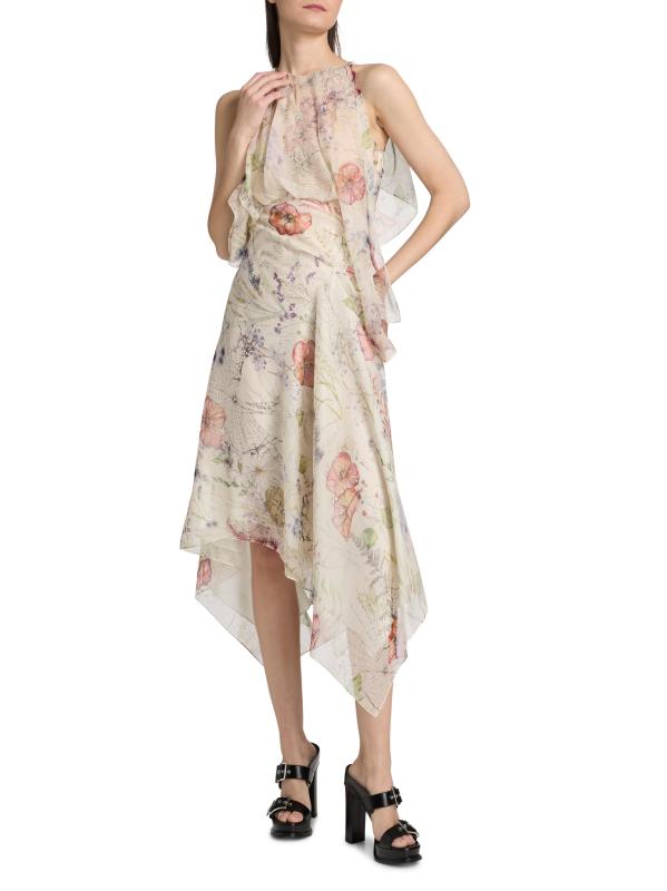 Cascading in swatches of luxurious Italian silk, this midi-dress from McQueen drapes decadently with a spiderweb floral motif and handkerchief hem. Pairing edge and romance, this piece exudes the brand's signature moods.