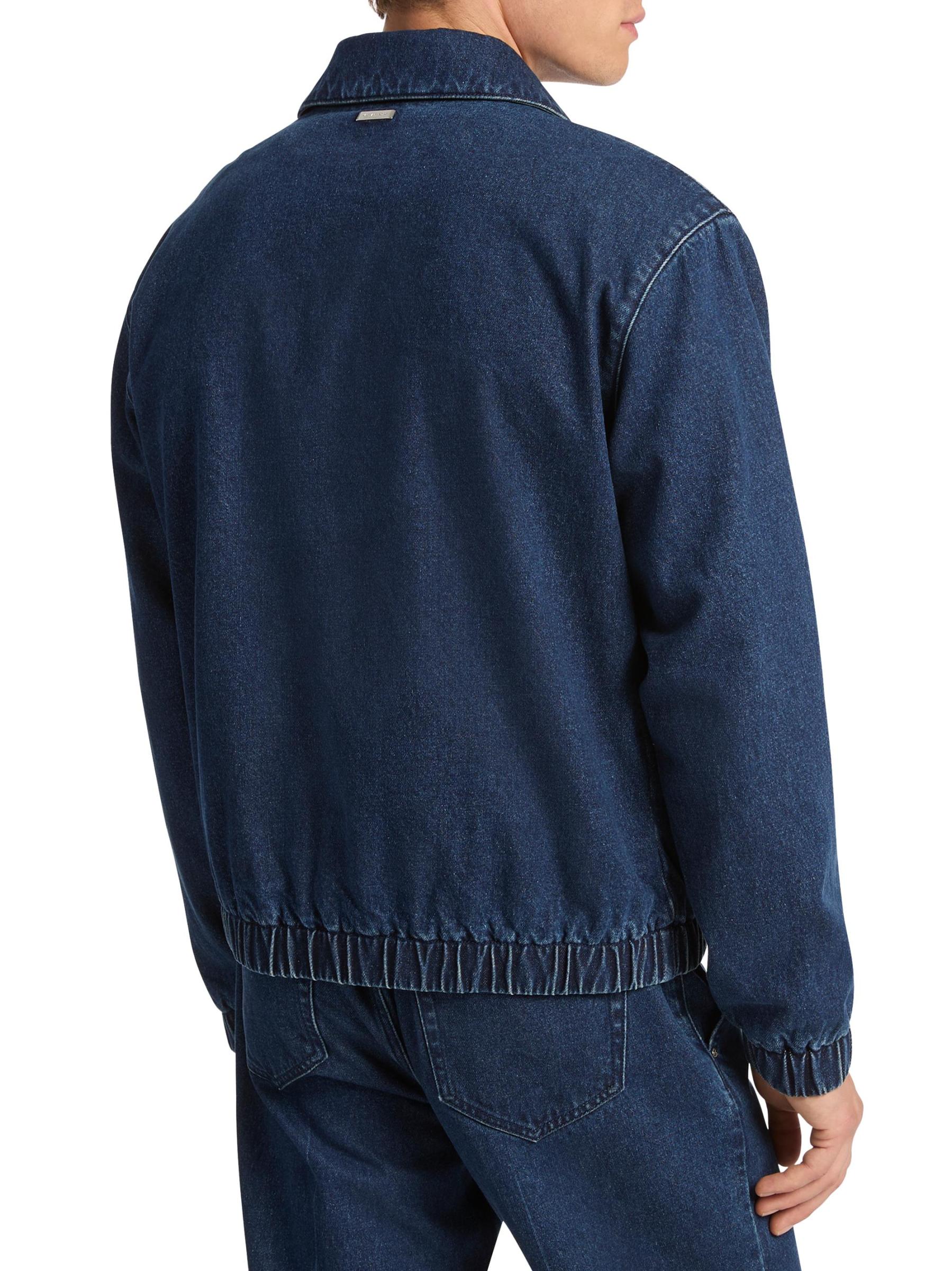 Crafted of washed denim, this shirt jacket from Michael Kors is styled with a spread collar, side snap pockets, and an elasticized waistband.Spread collar Long sleeves, elasticized cuffs Side slip pockets Elasticized waistband Front zip closure 100% denim Lining: 100% Cotton Trim: 100% suede Machine wash Imported