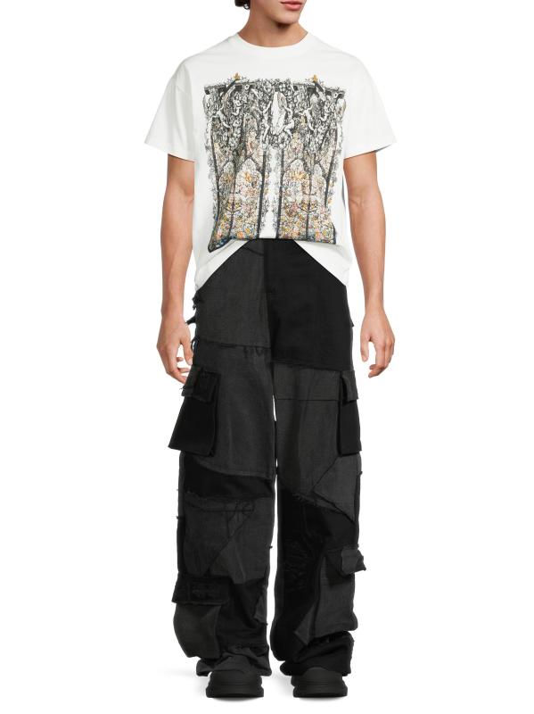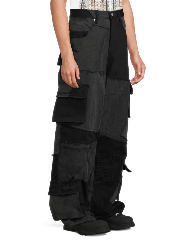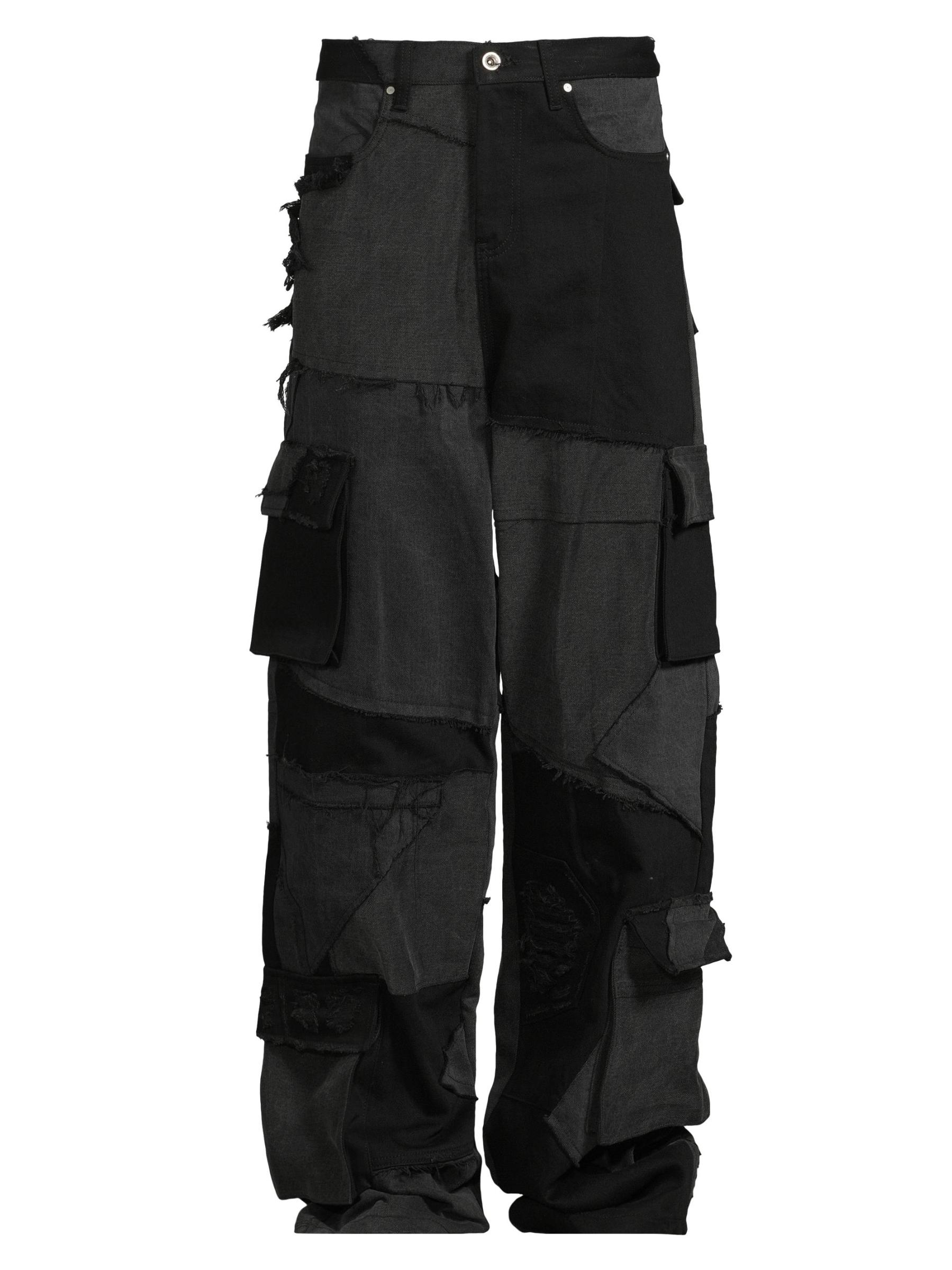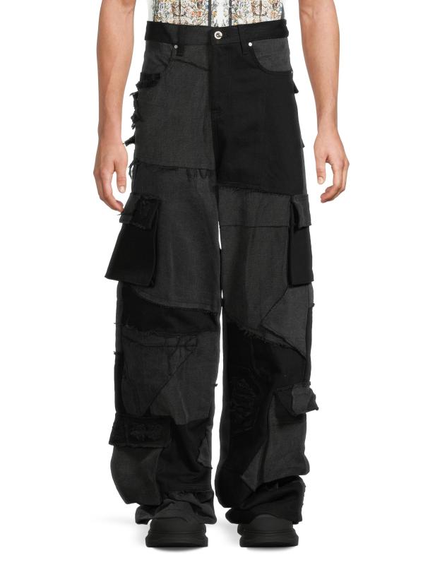 Crafted of durable cotton, Who Decides War's Destroyed Paneled Cargo jeans patch together pieces of denim with different hues and distressed threading. This slouchy silhouette features a classic five-pocket style, side flap pockets, and a wide-leg silhouette.