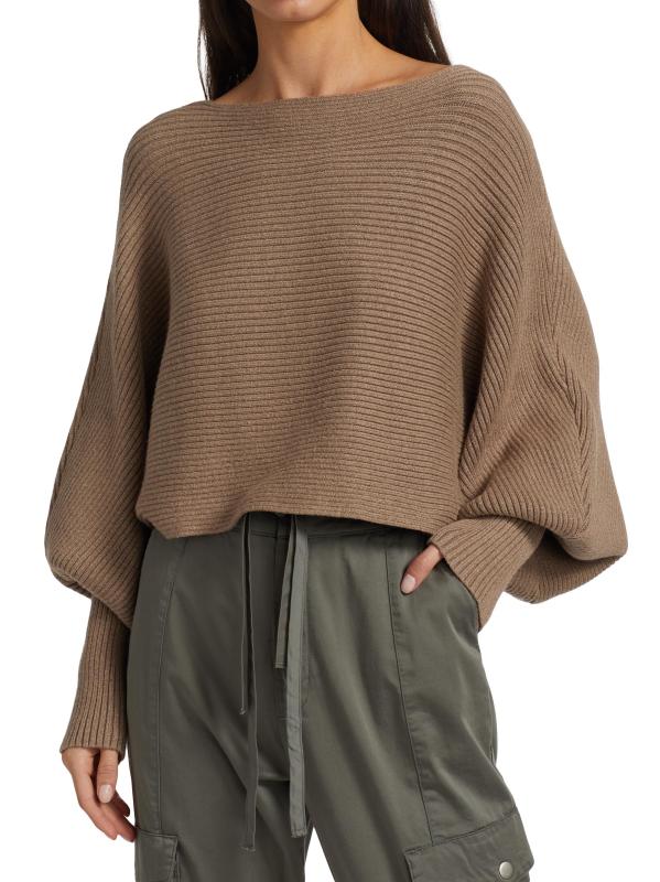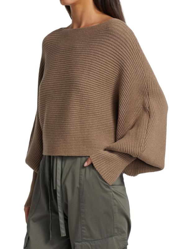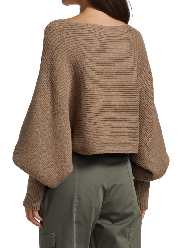 Rib-knit pullover sweater with defining puff dolman sleeves and a cropped silhouette.