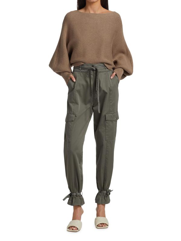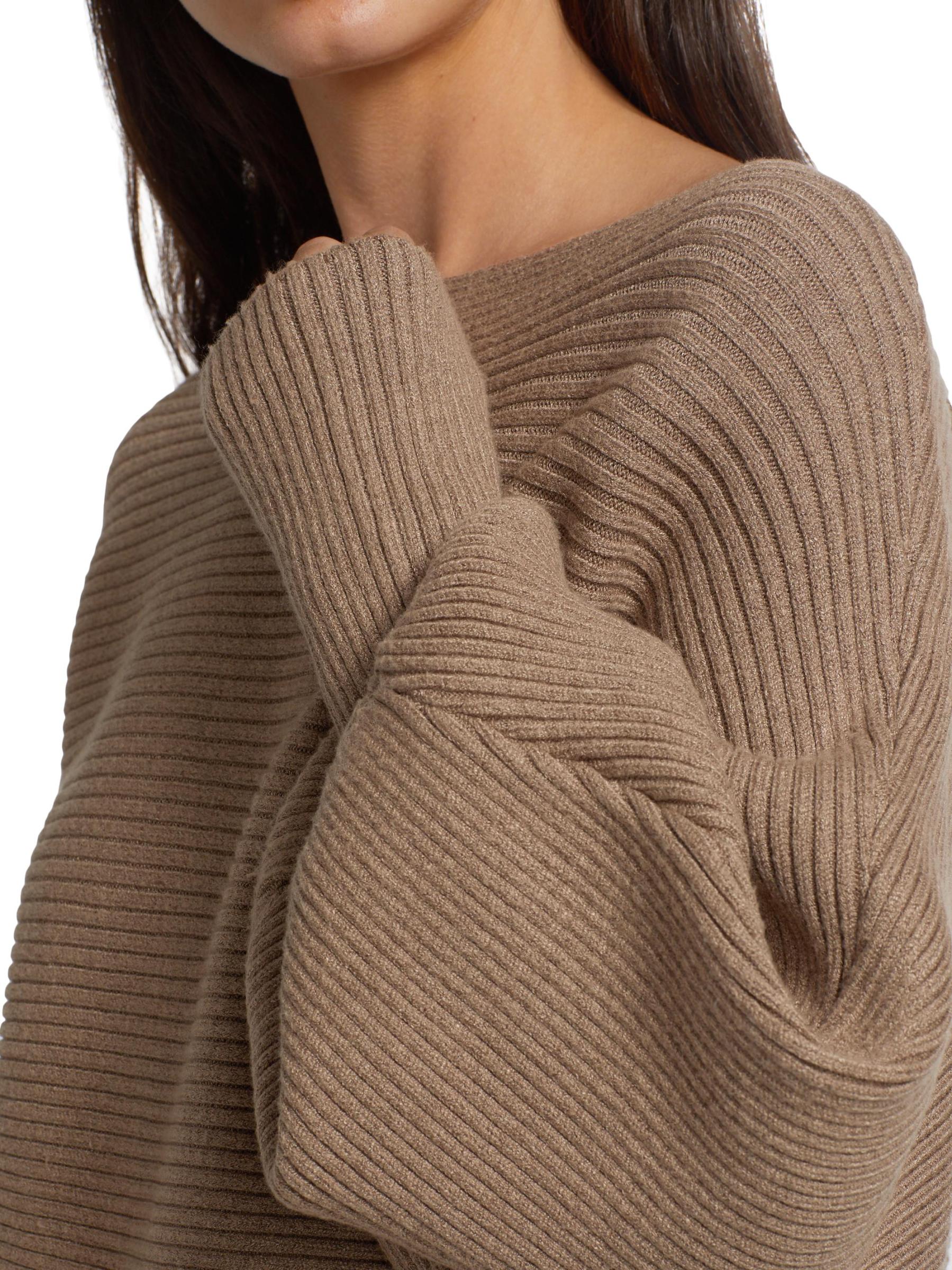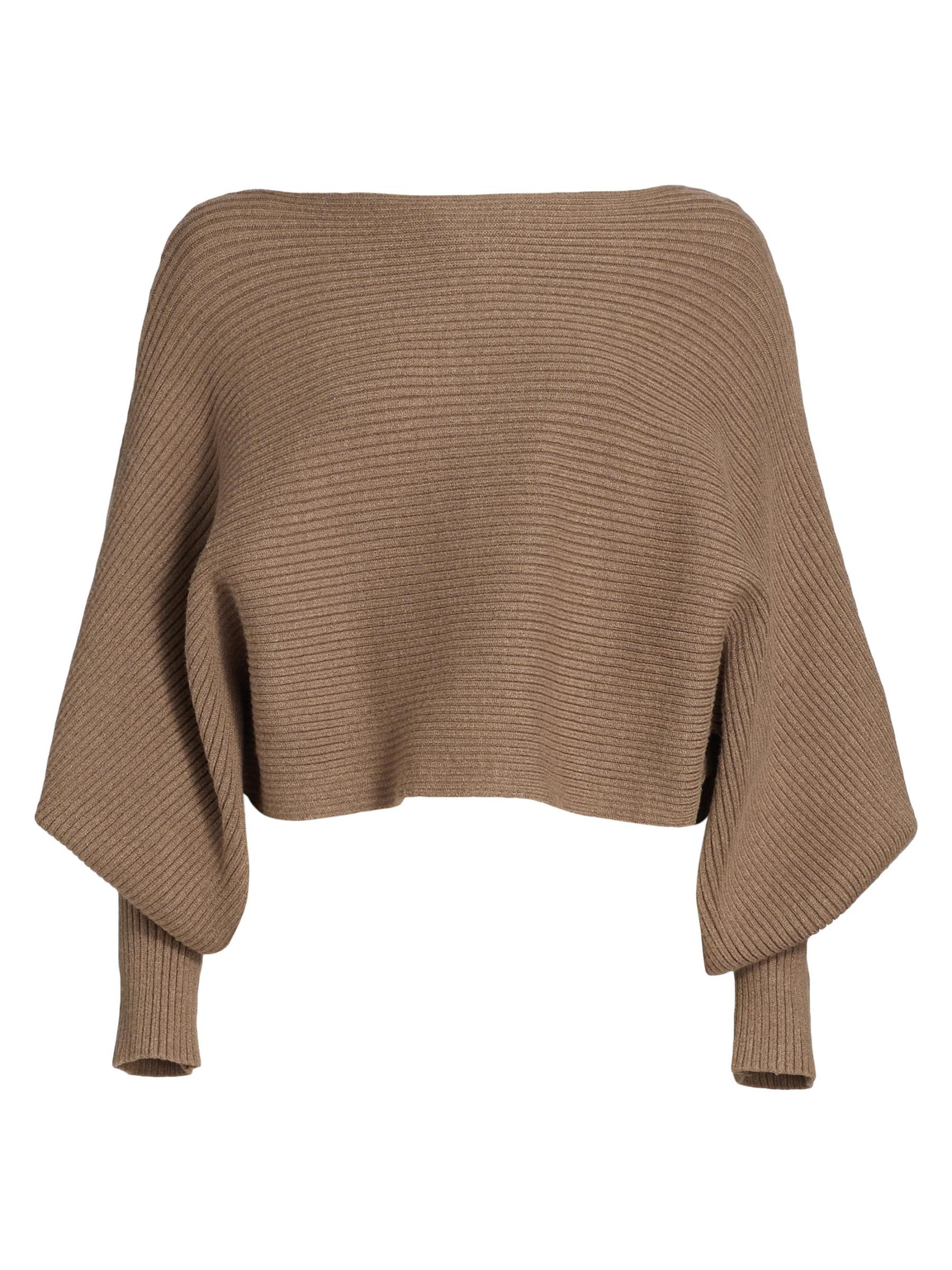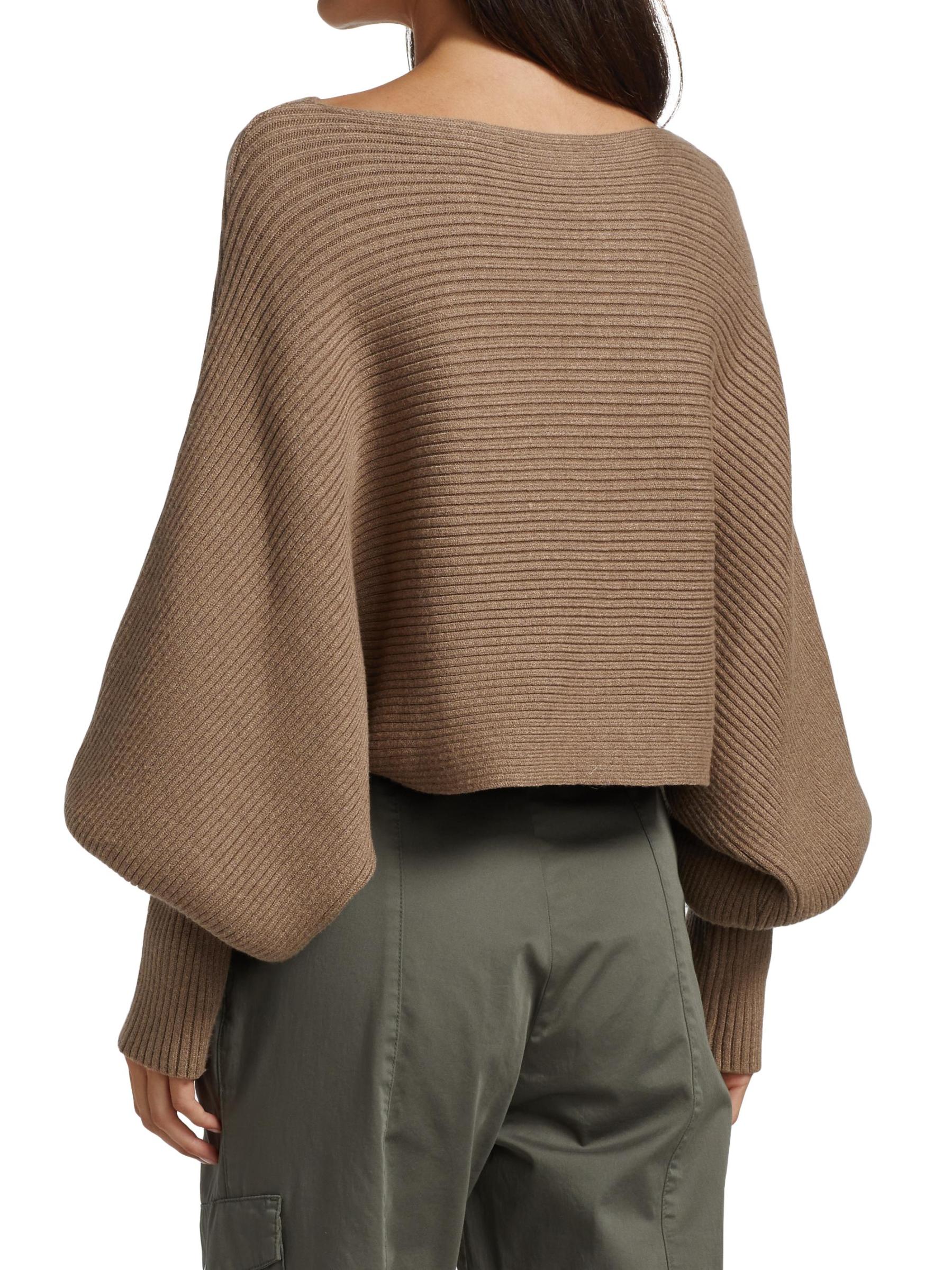 Rib-knit pullover sweater with defining puff dolman sleeves and a cropped silhouette.Boatneck Long puff dolman sleeves Pullover style 50% viscose/30% nylon/20% polyester Dry clean Imported