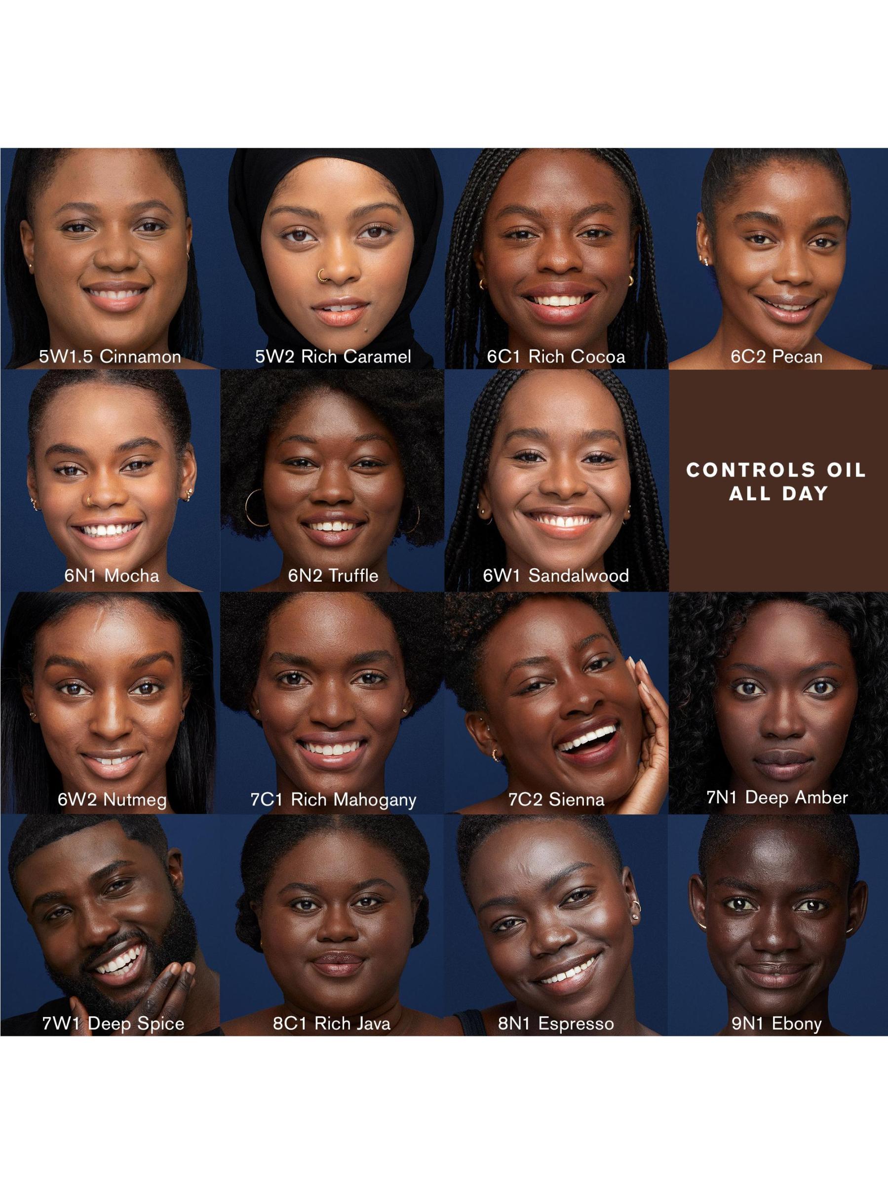 Wear confidence. 24-hour wear. Fresh matte. Oil-free. Controls oil all day. Sweat-, heat- and humidity-resistant. Waterproof. 24-hour color true. In a wide range of shades that flatters all. Won’t look grey on deeper skintones. Unifies uneven skintone and covers imperfections with buildable, medium-to-full coverage. Lightweight. No touchups needed.