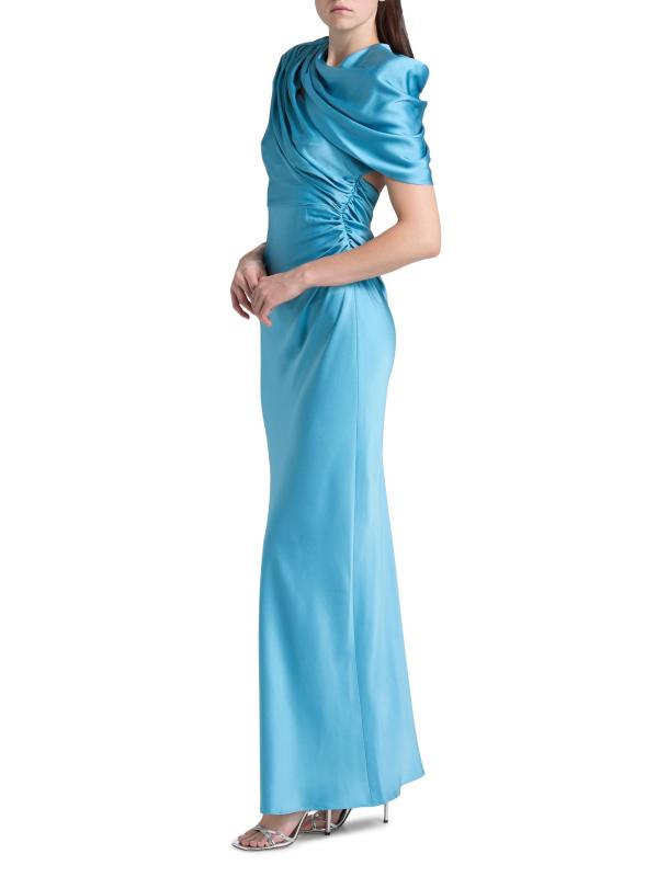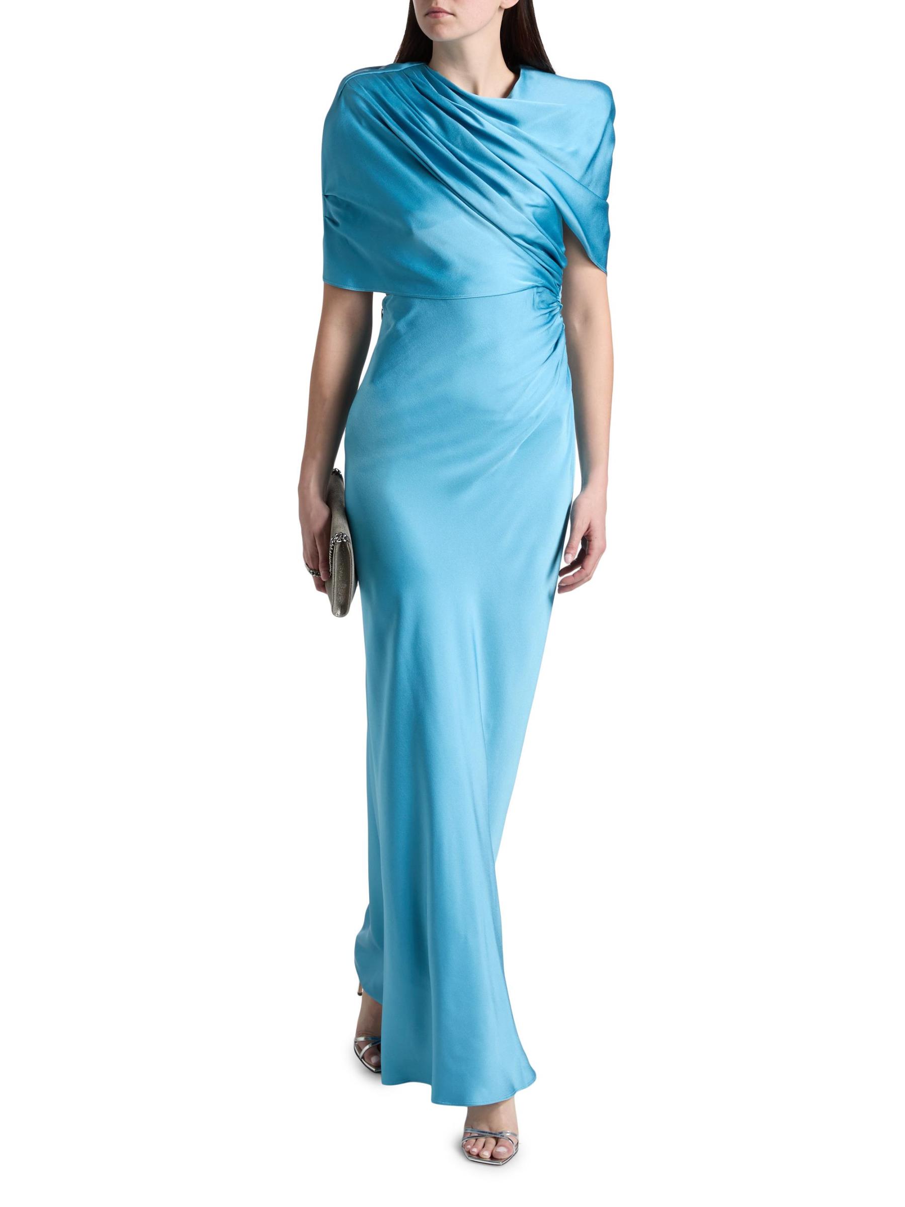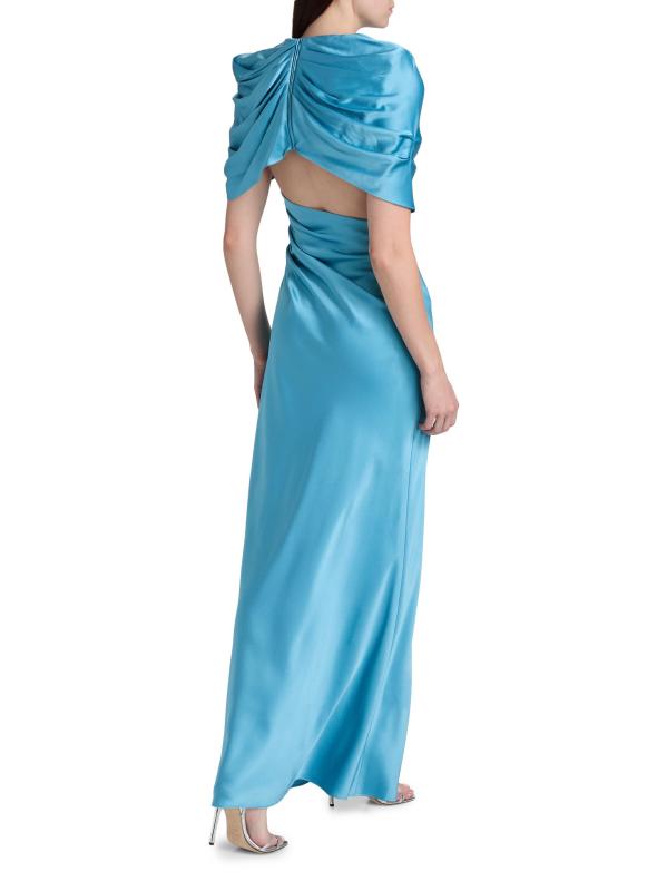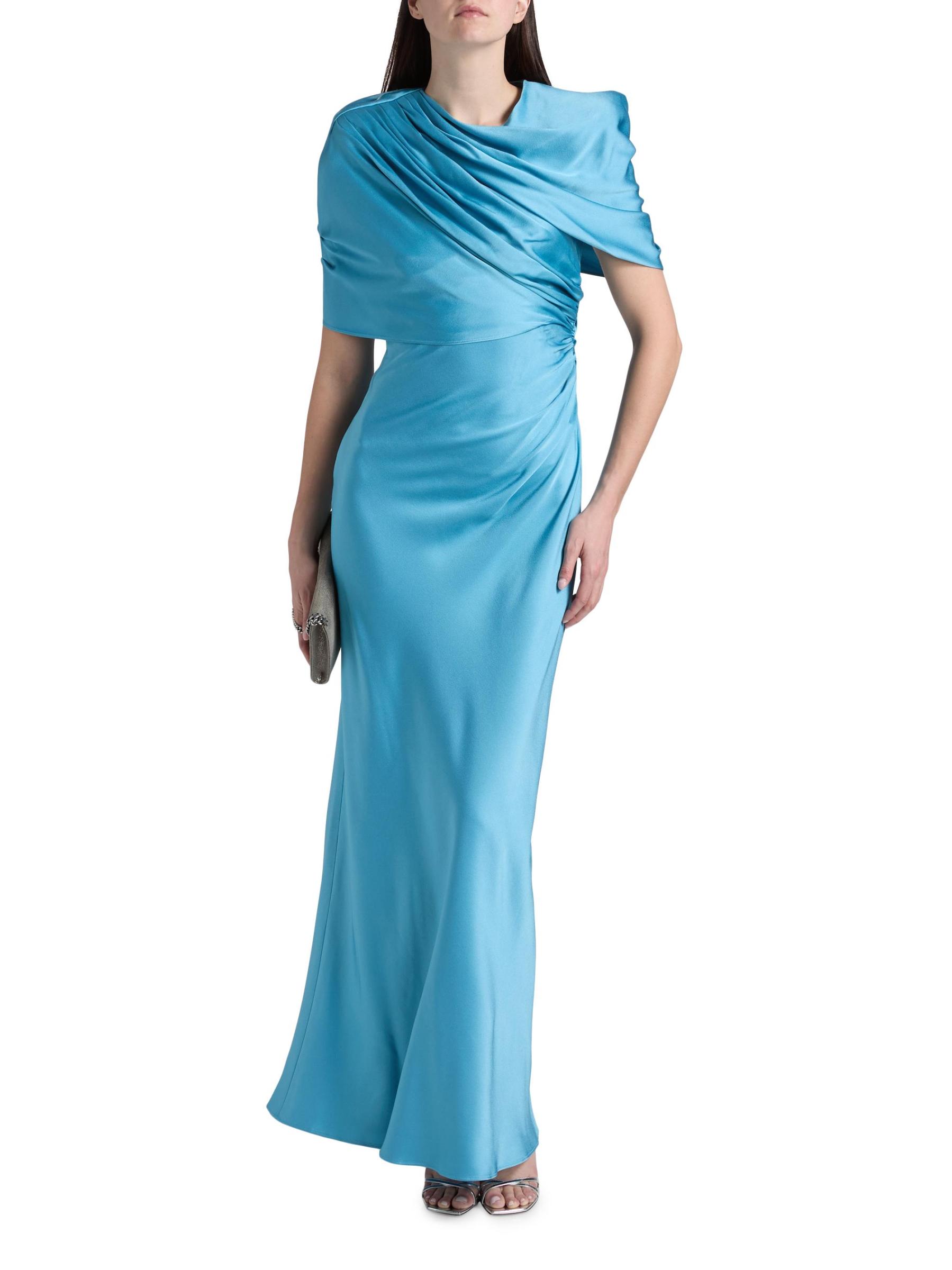 Crafted of satin, this Stella McCartney gown is designed with asymmetric draping at the shoulder, ruching through the waist, and short cape sleeves.Cowlneck Short cape sleeves Open back Back zip closure 73% acetate/27% viscose Dry clean Imported