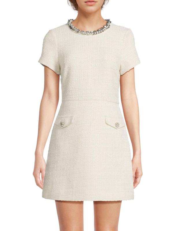 From the Drop 11 Collection. The Daria dress from Likely features a tweed design with an embellished neckline and decorative pockets.Round neck Short sleeves Concealed back zip closure 90% polyester/10% wool Lining: 97% polyester/3% spandex Dry clean Imported