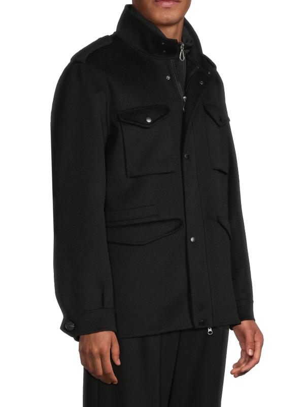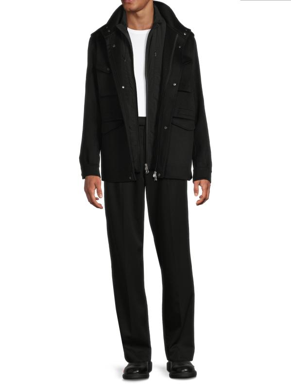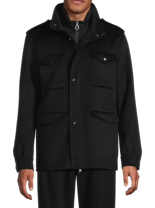 The Duccio field coat from Paltò is crafted of double-faced wool and features a detachable quilted vest. The piece includes multiple flap pockets and pleated elbows.