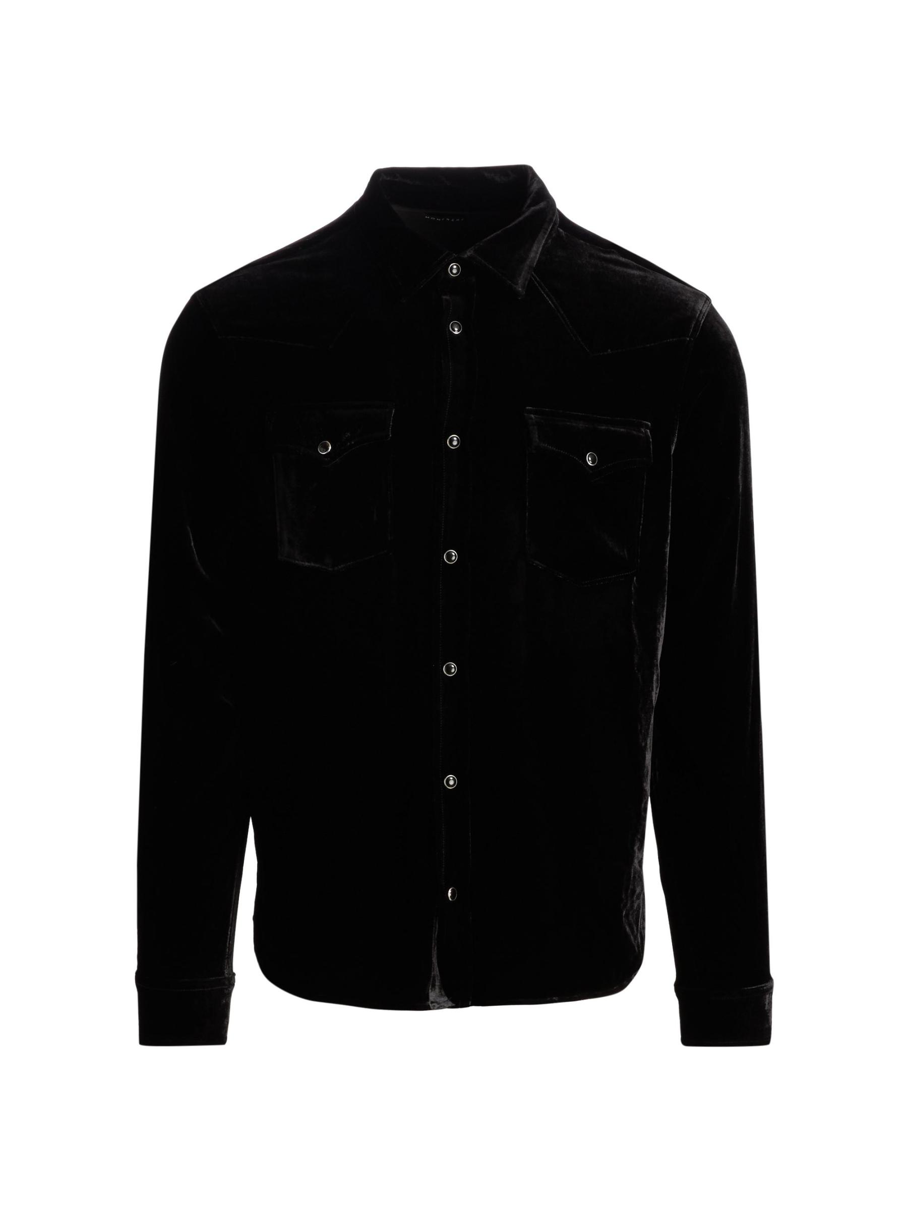 Crafted of Japanese velvet, this Eastwood shirt from Monfrère is styled with a spread collar, chest snap patch pockets, and a front snap closure.Spread collar Long sleeves, barrel cuffs Chest snap patch pockets Front snap closure 80% rayon/18% silk/ 2% spandex Dry clean Imported