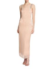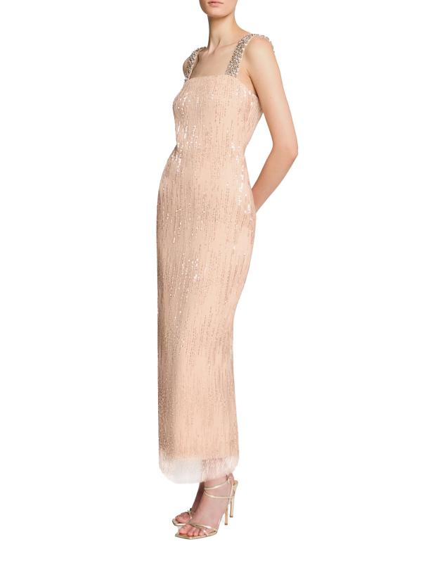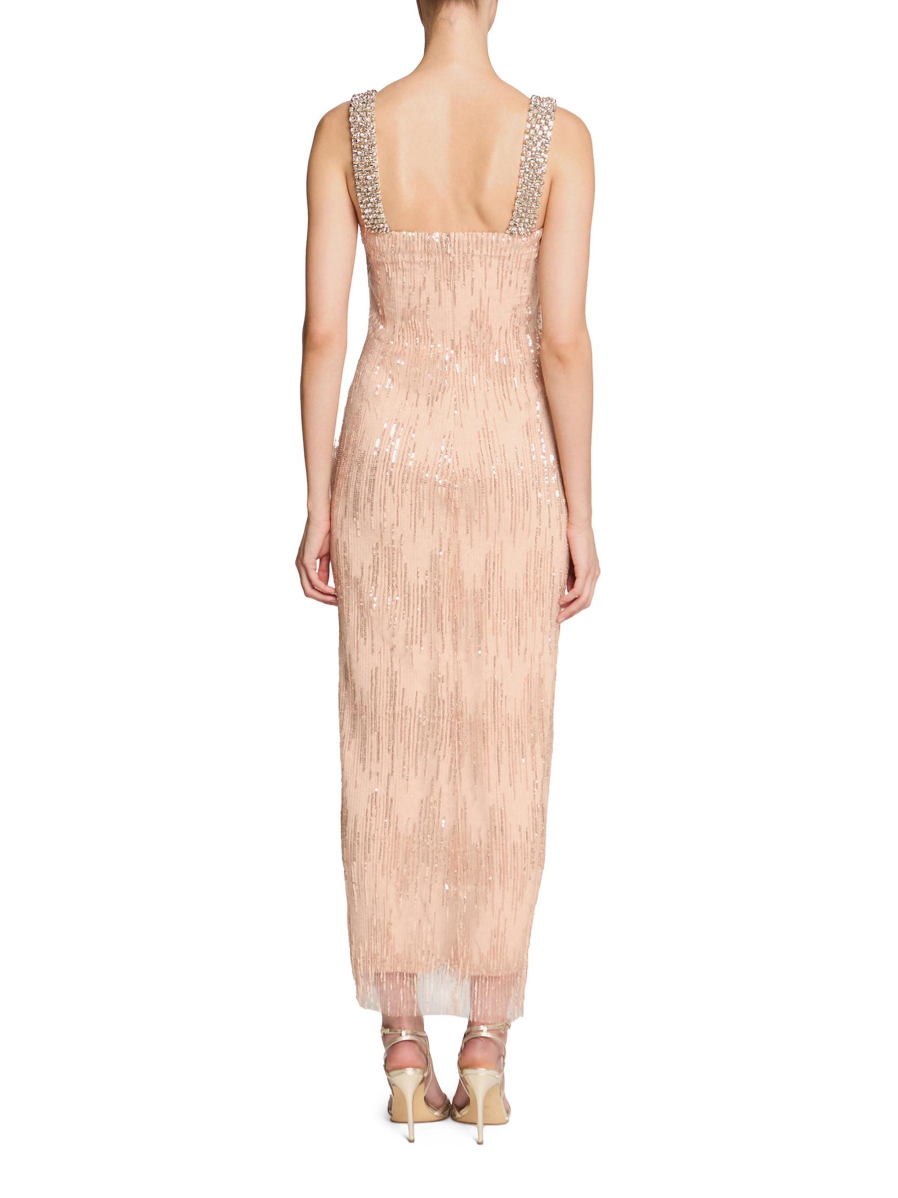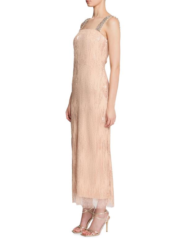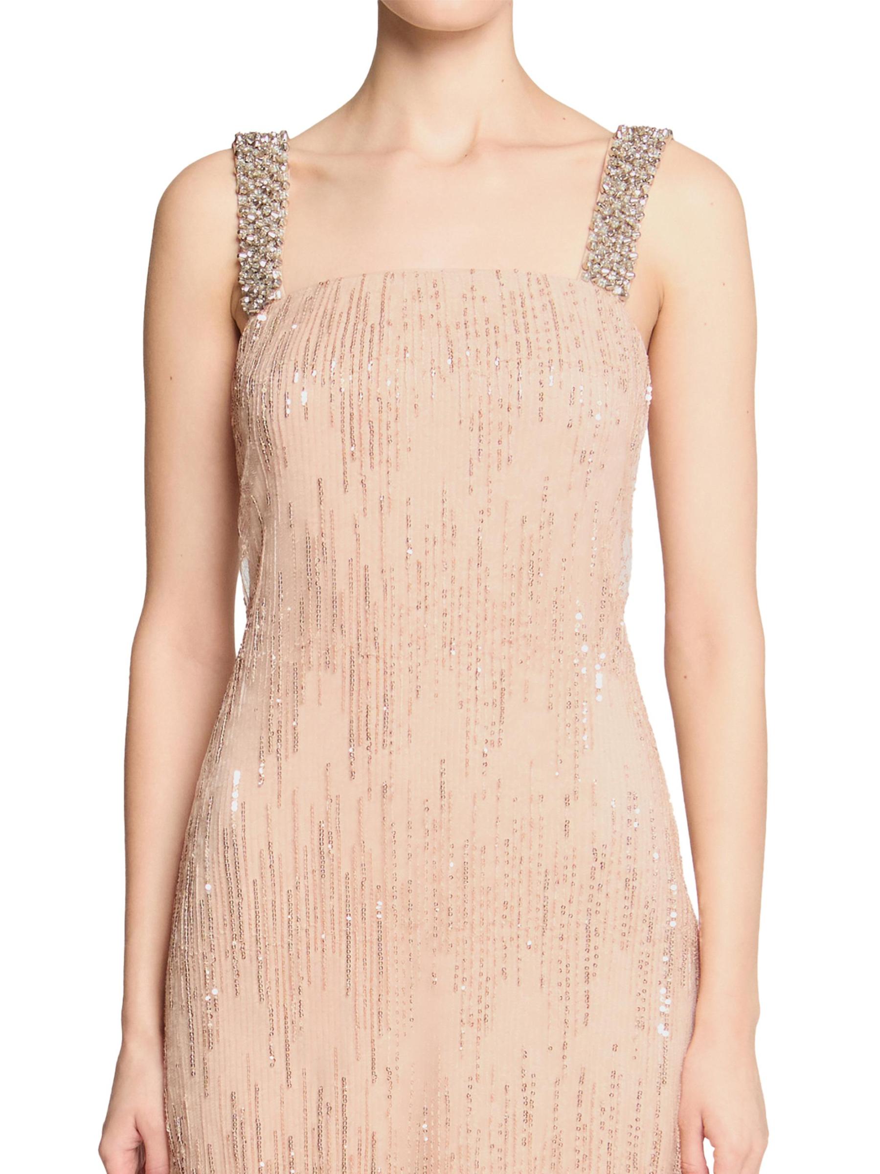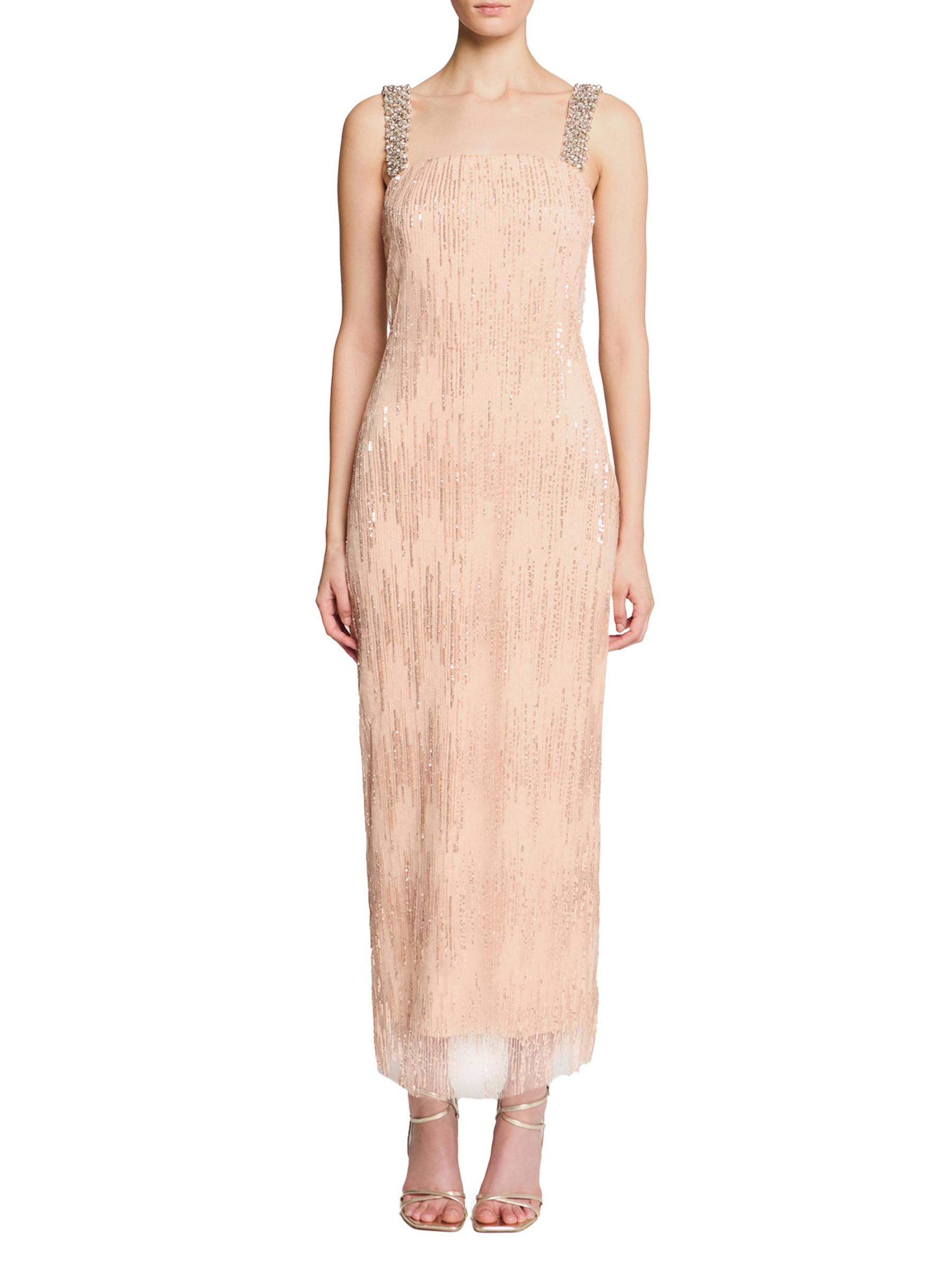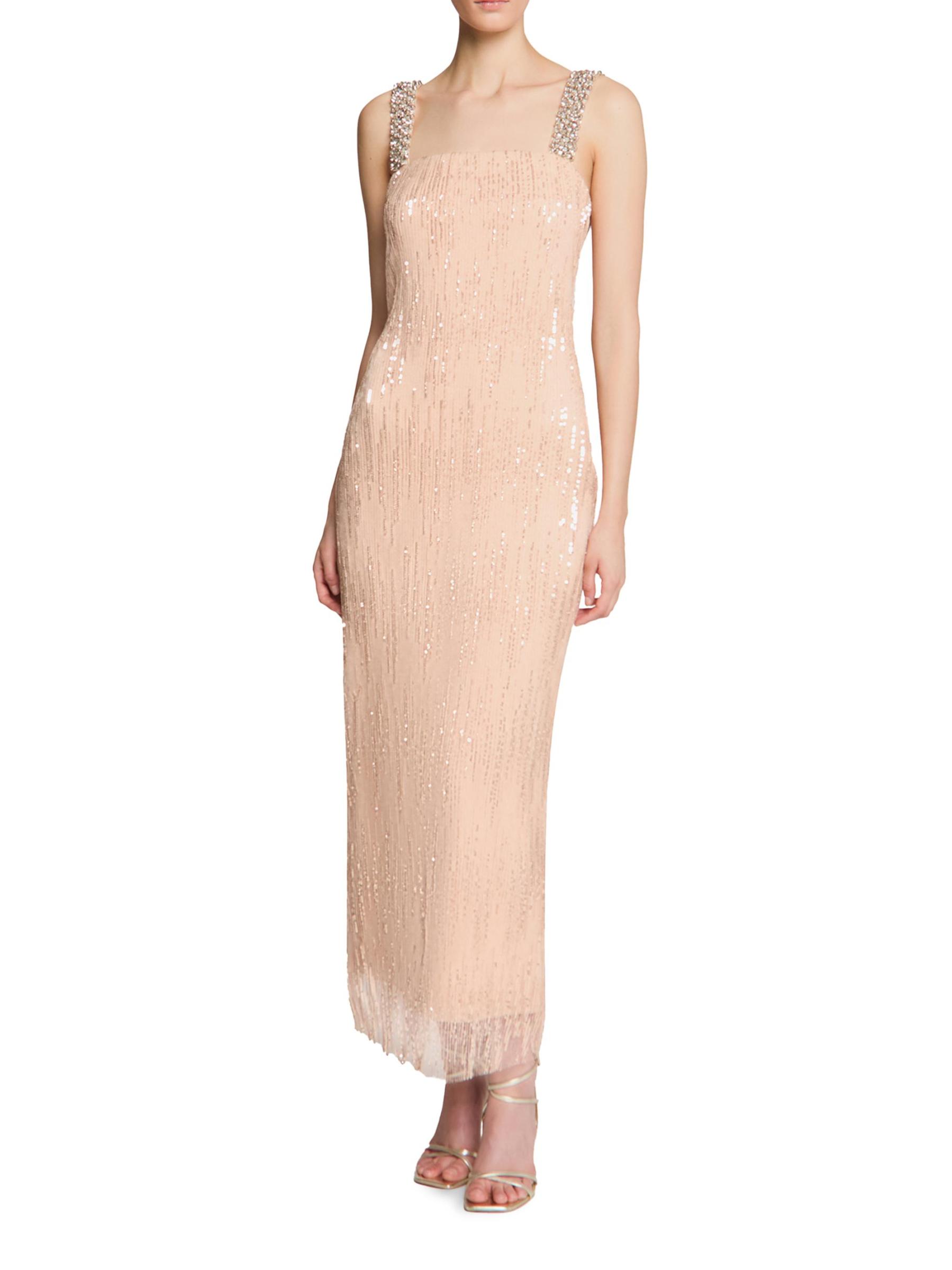 This Eila square neck midi-dress from Halston is crafted of sequin-embellished tulle and styled with beaded shoulder straps.