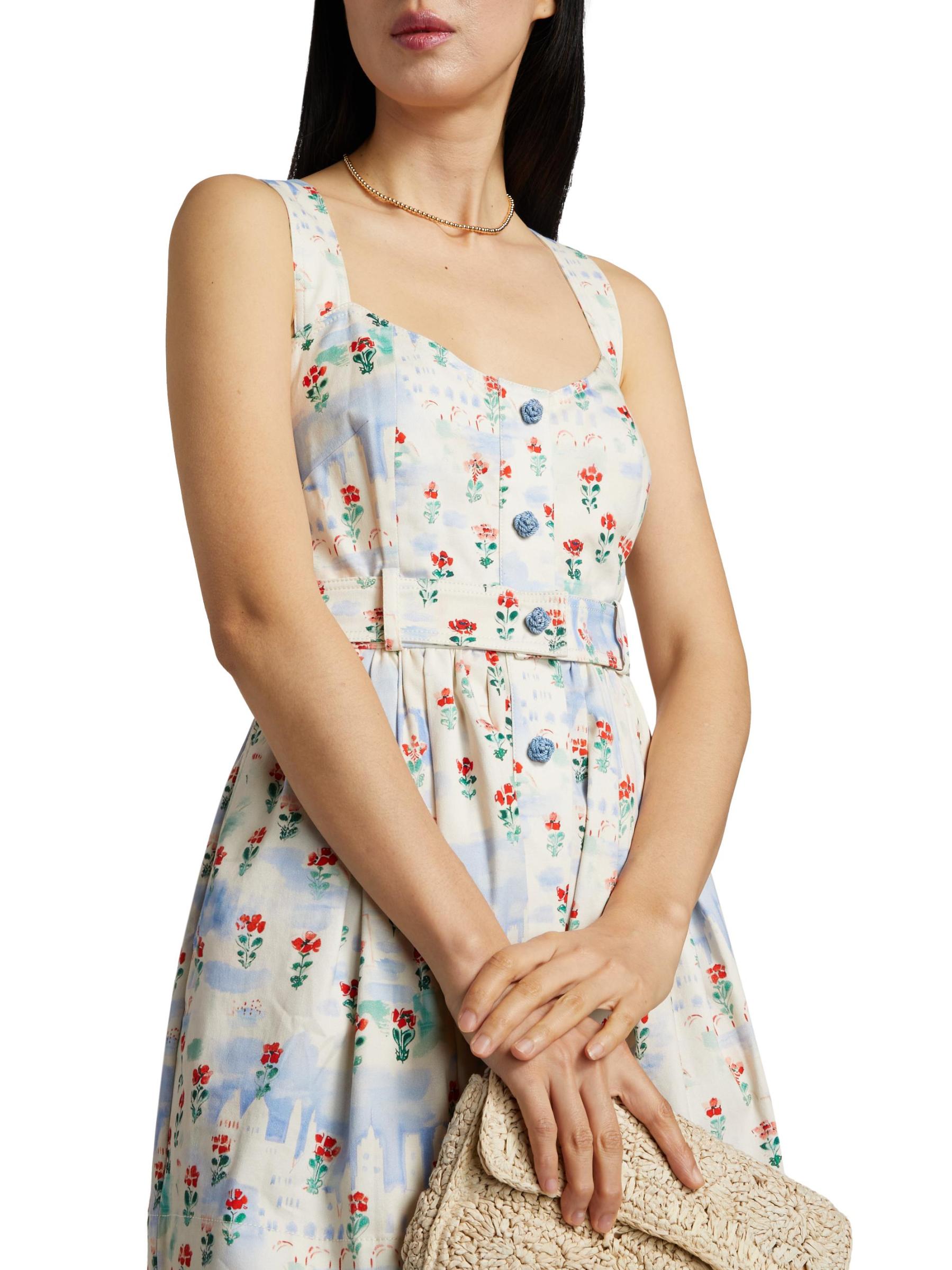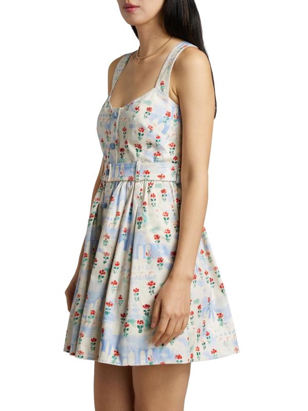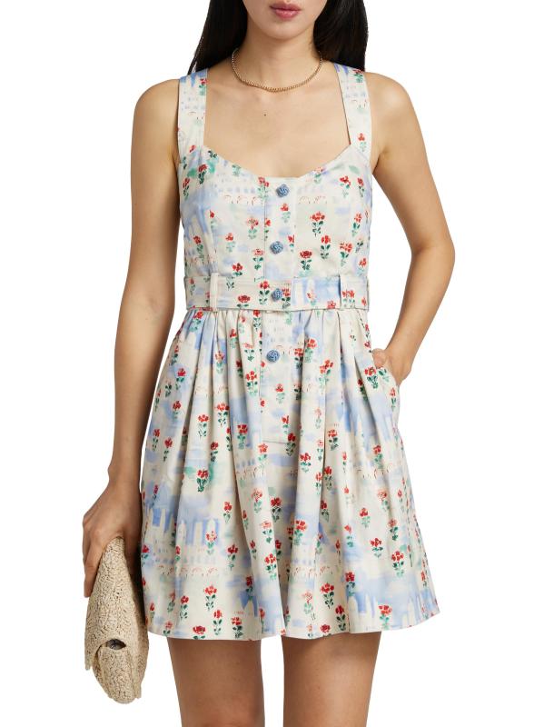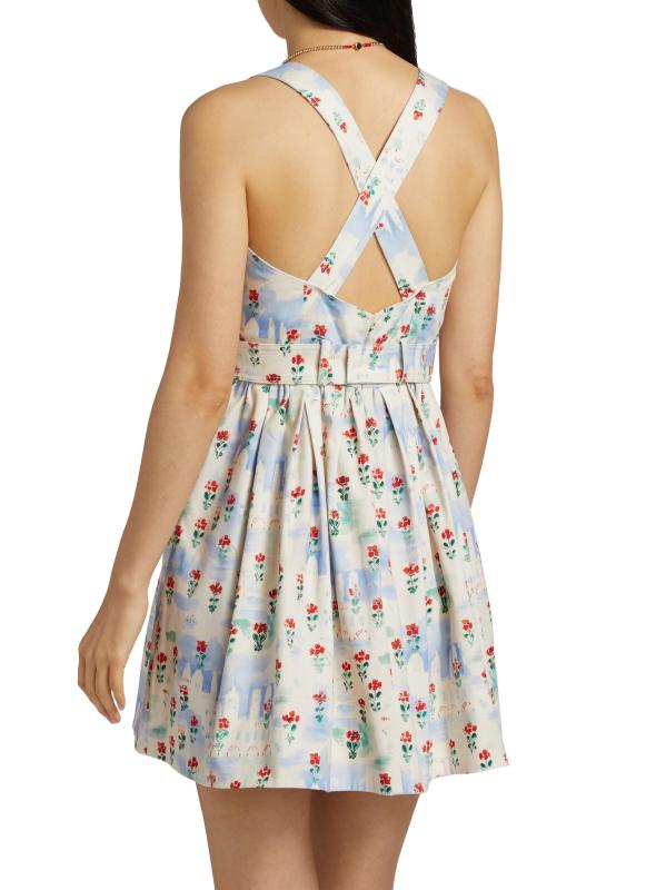 Crafted of stretch cotton, this Eileen sleeveless floral minidress from Hunter Bell is designed with a scoopneck, belt loops, side slip pockets, and a crisscross back.