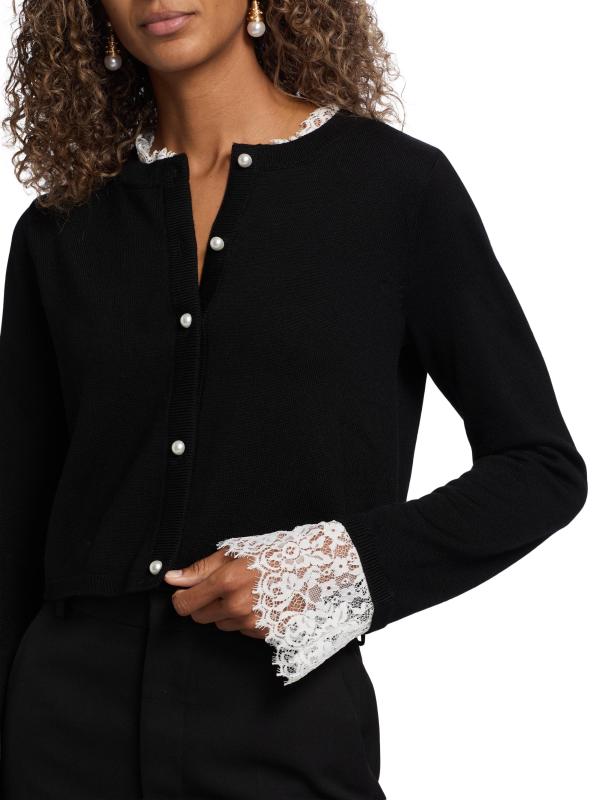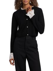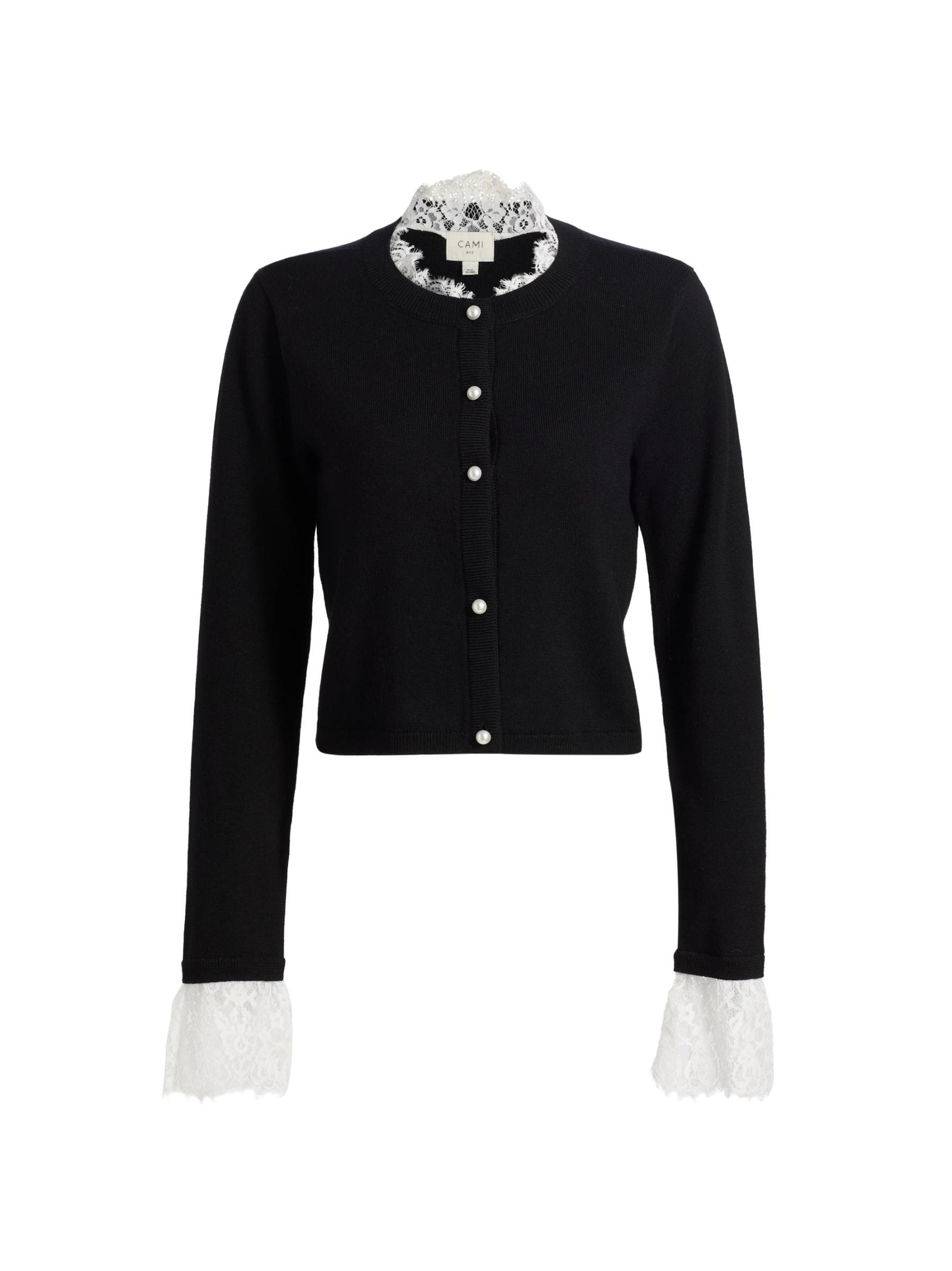 Knit from extra-fine merino wool, this cozy Eliana cardigan from Cami NYC is embellished with lace trim at the neck and cuffs.