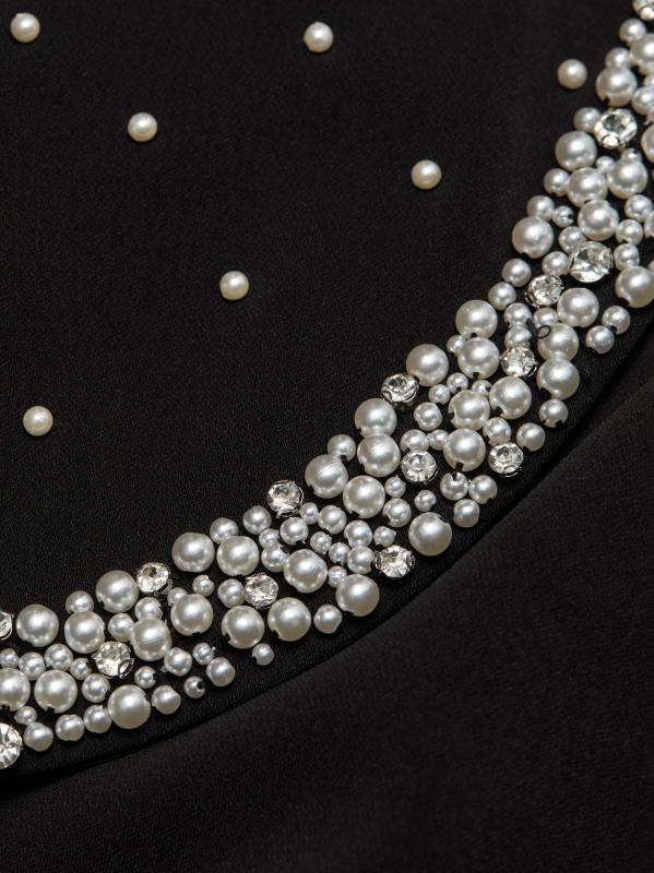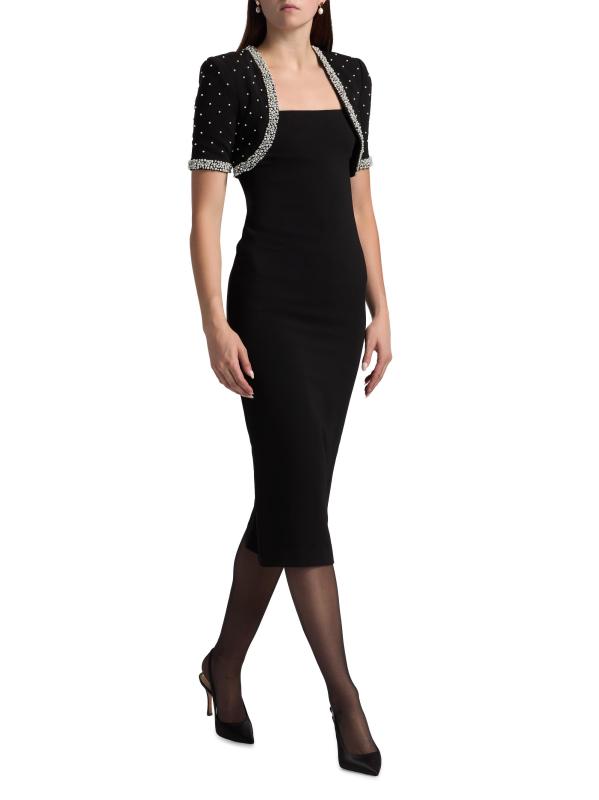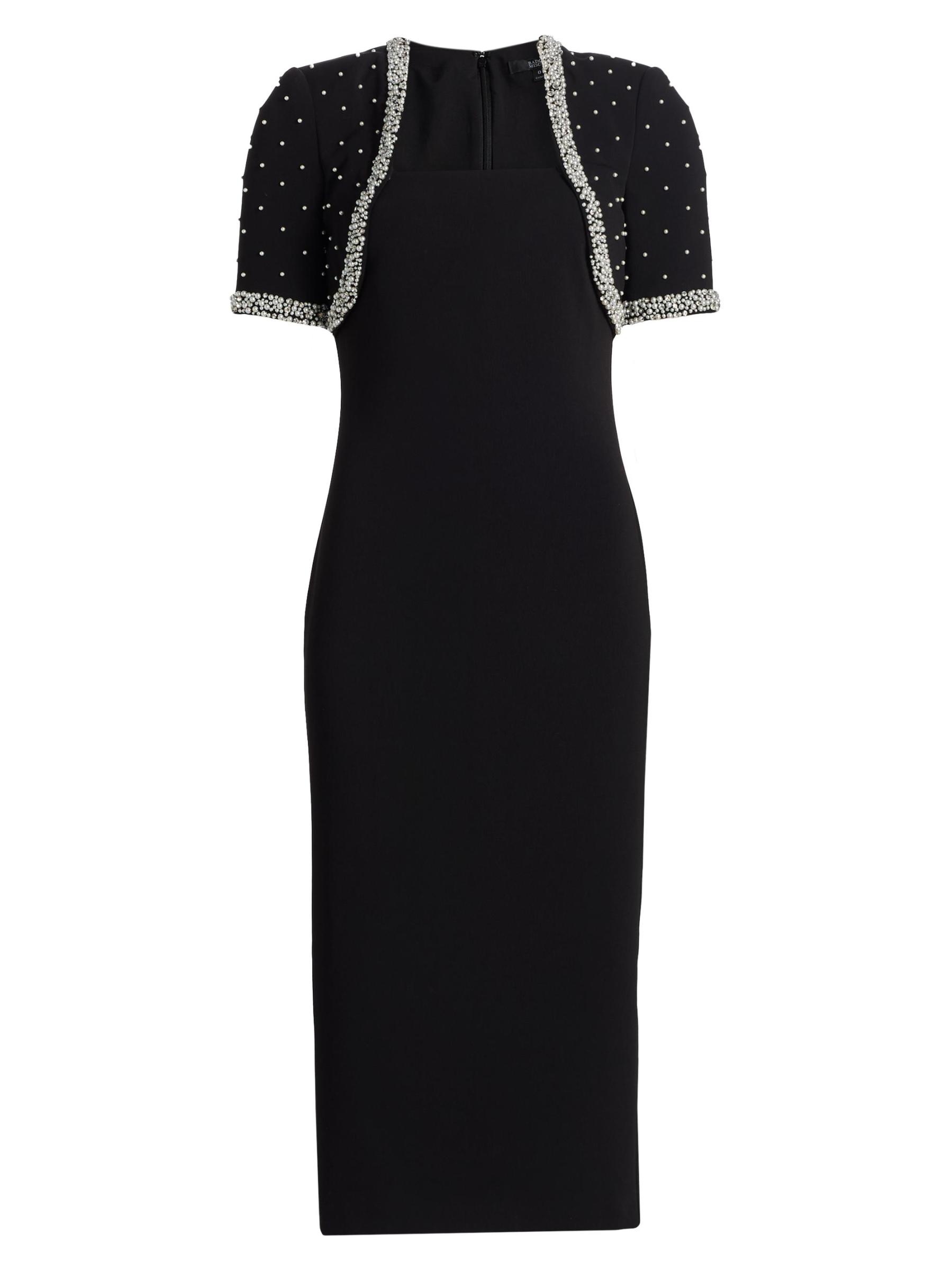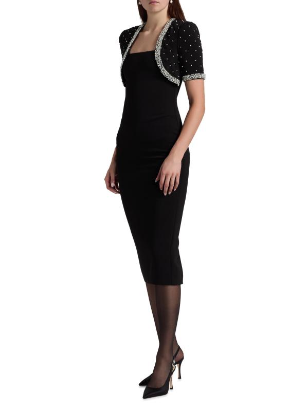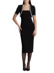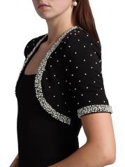 Crafted of stretch fabric, this vintage-inspired cocktail dress from Badgley Mischka is styled with imitation pearls and rhinestones at the bolero-style top.Square neck Short sleeves Concealed back zip closure 98% polyester/2% spandex Dry clean Imported